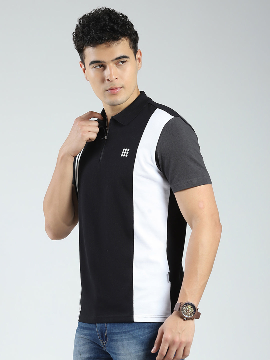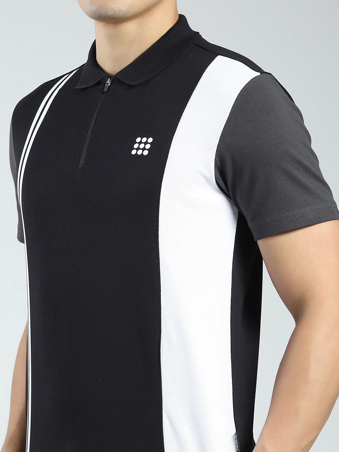 Men Black Stripe Collar Half Sleeve T-Shirt