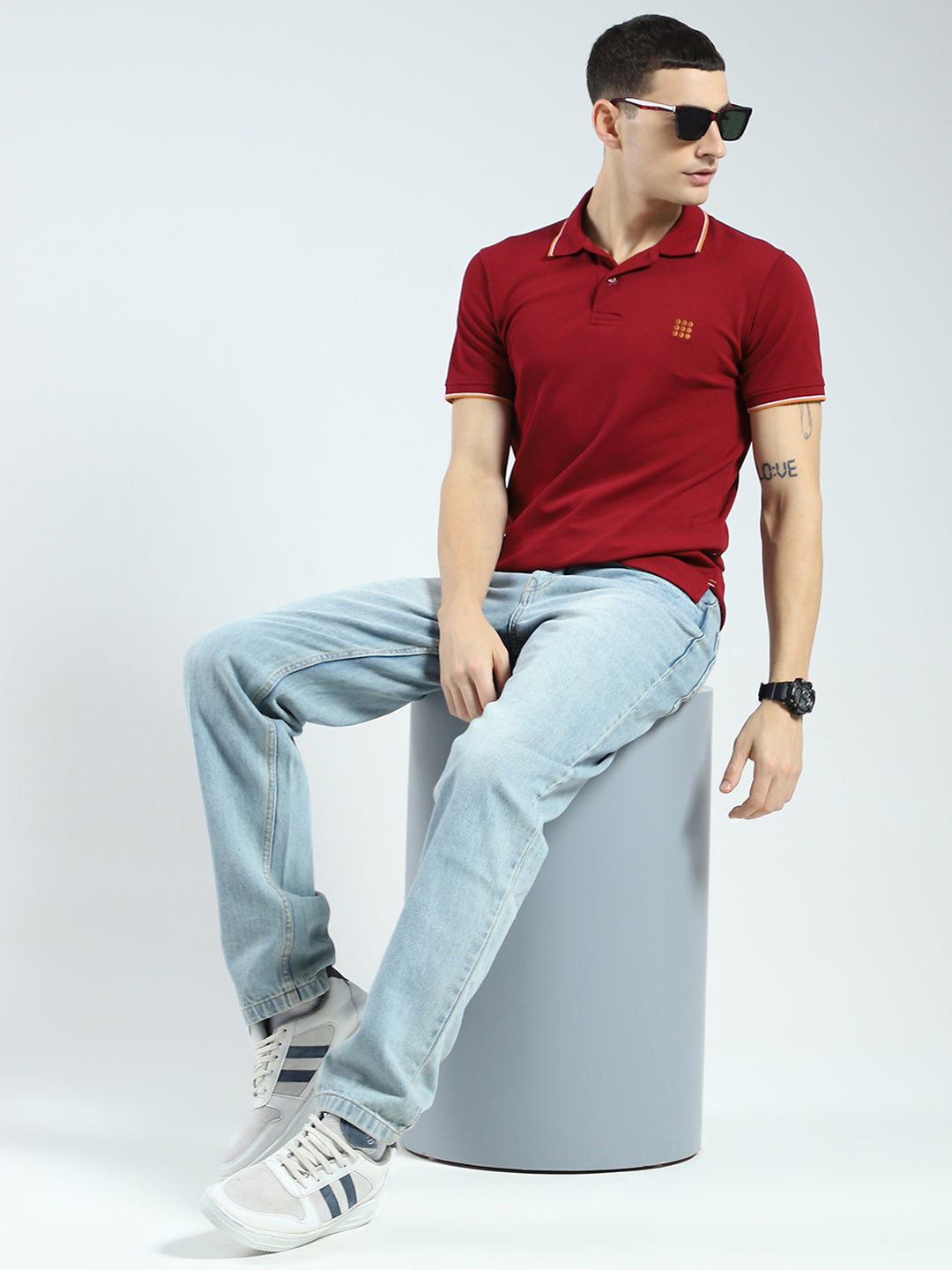- Men Maroon Self Design Collar Half Sleeve T-Shirt