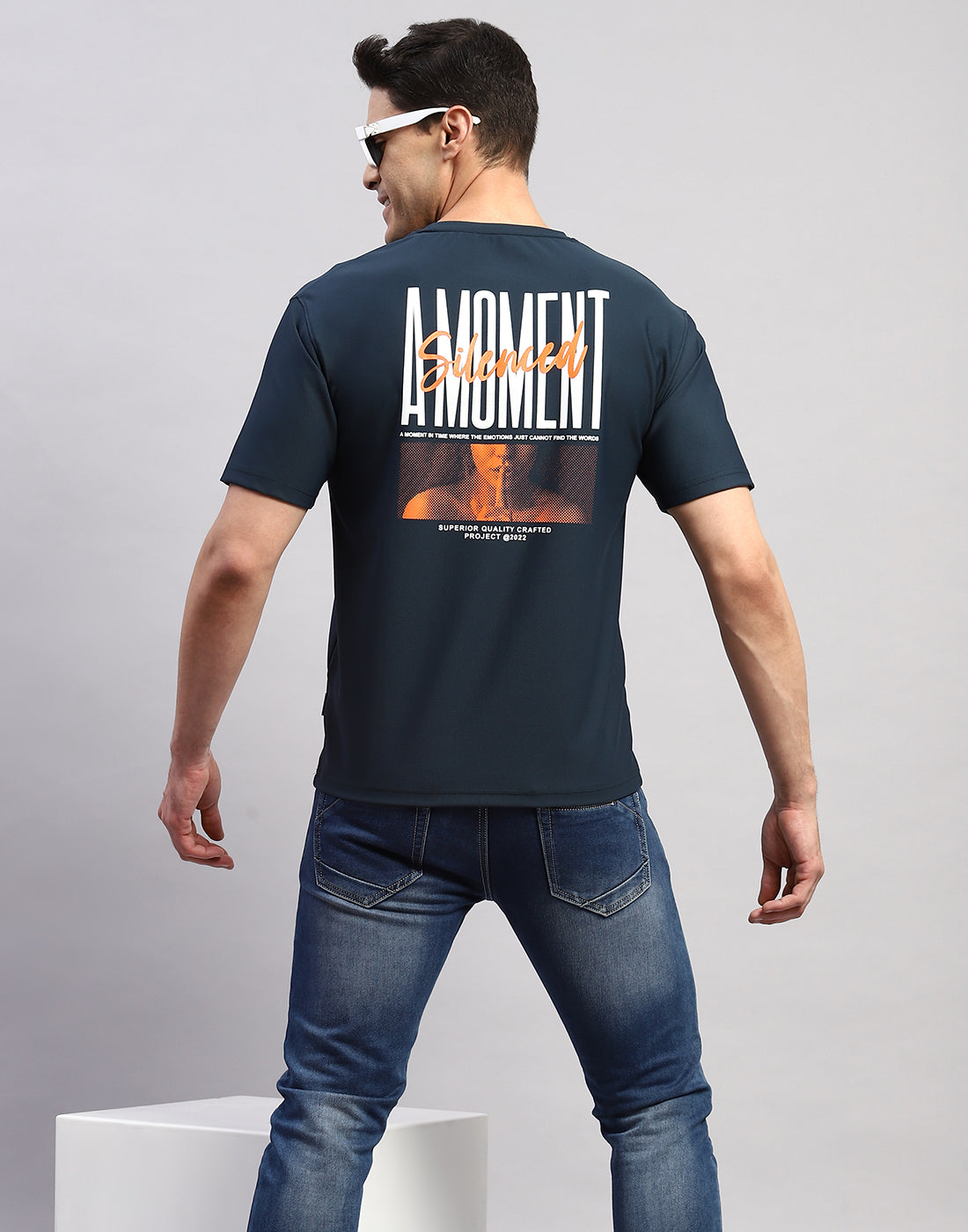 - Men Navy Blue Printed Round Neck Half Sleeve T-Shirt