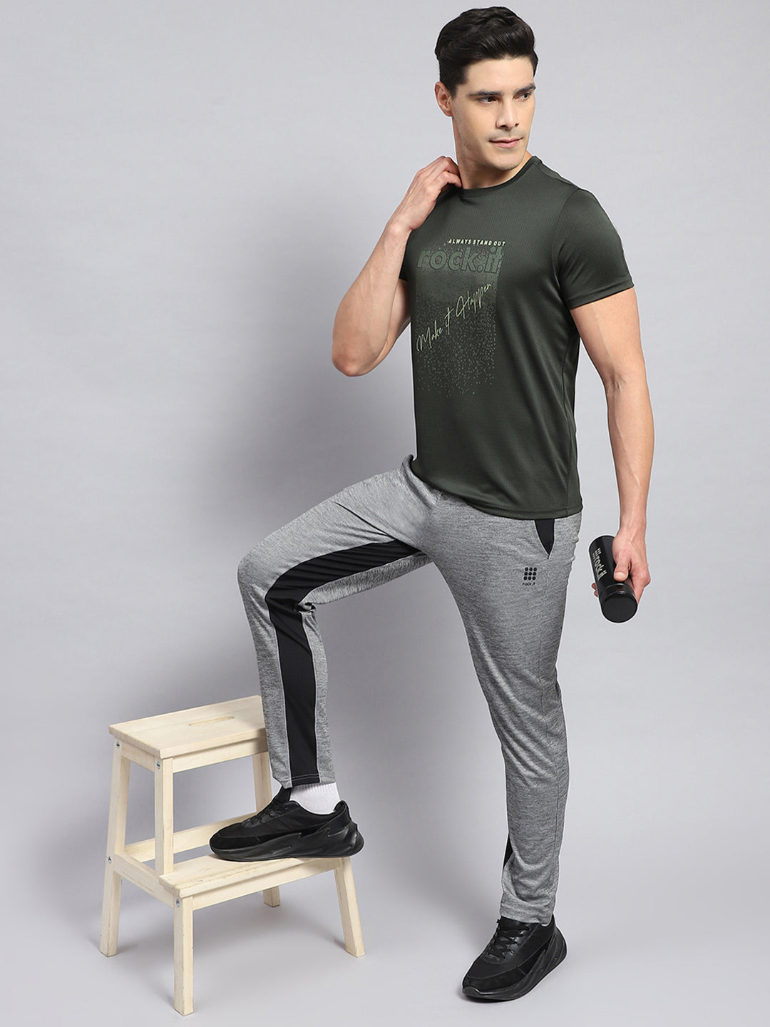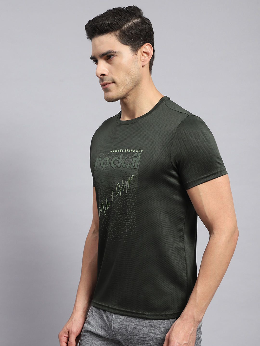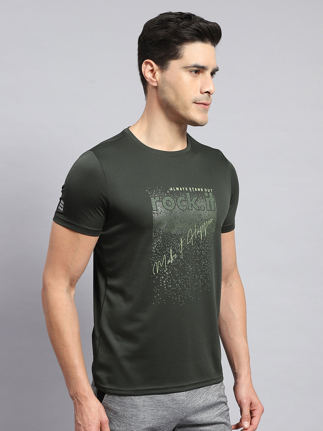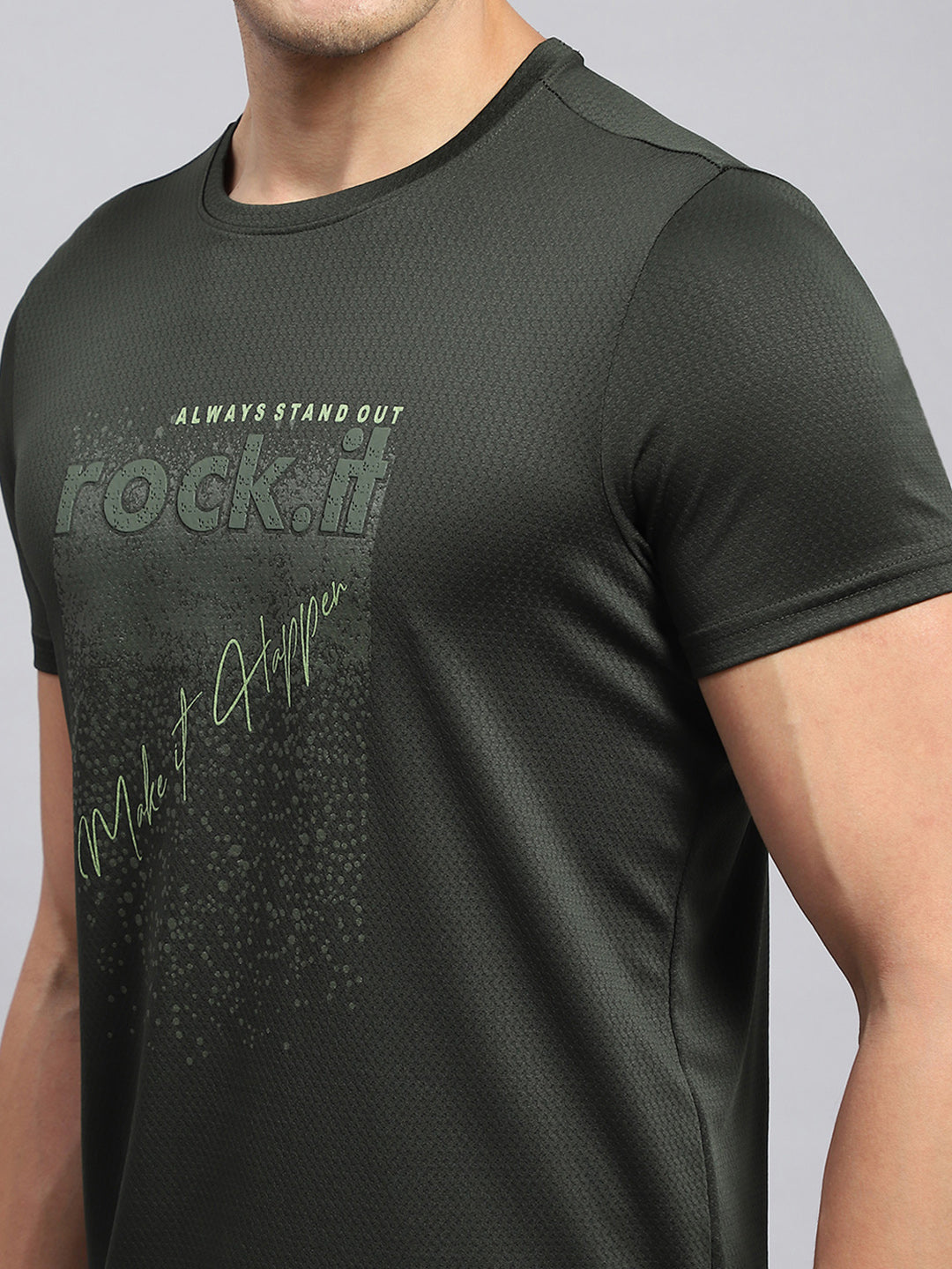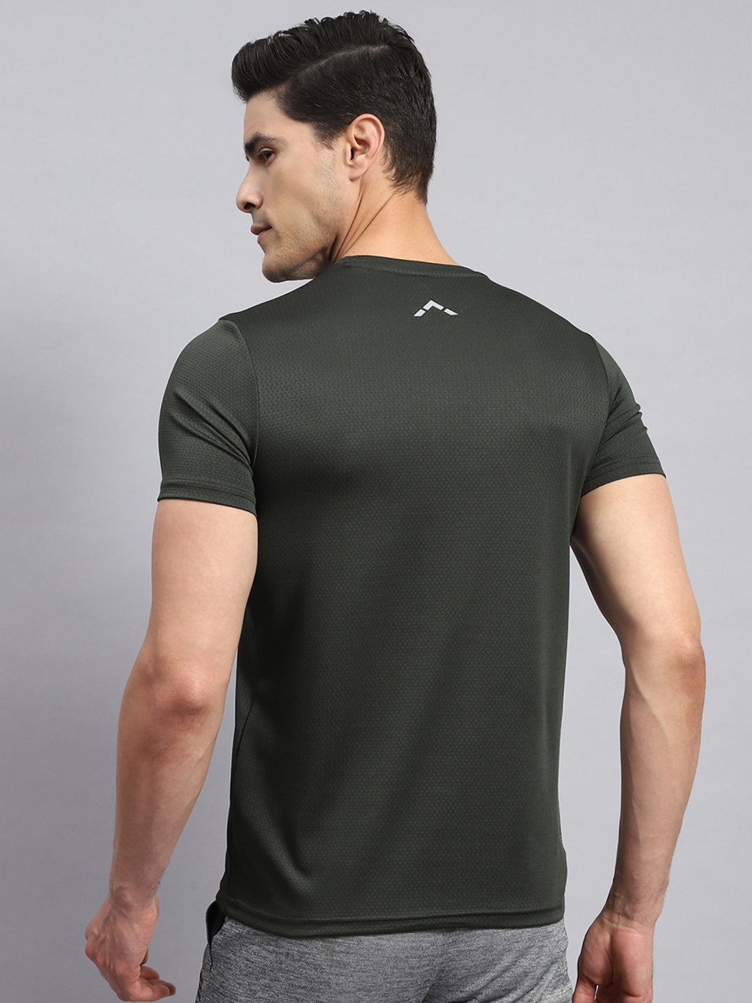 - Men Olive Self Design Round Neck Half Sleeve T-Shirt