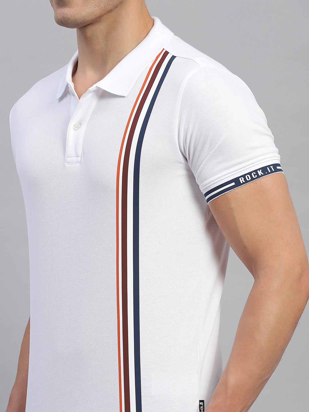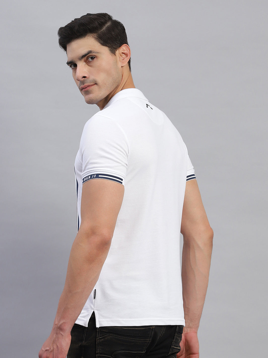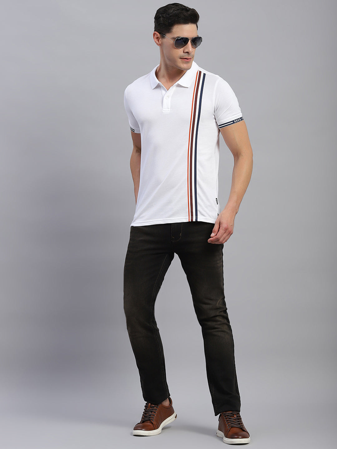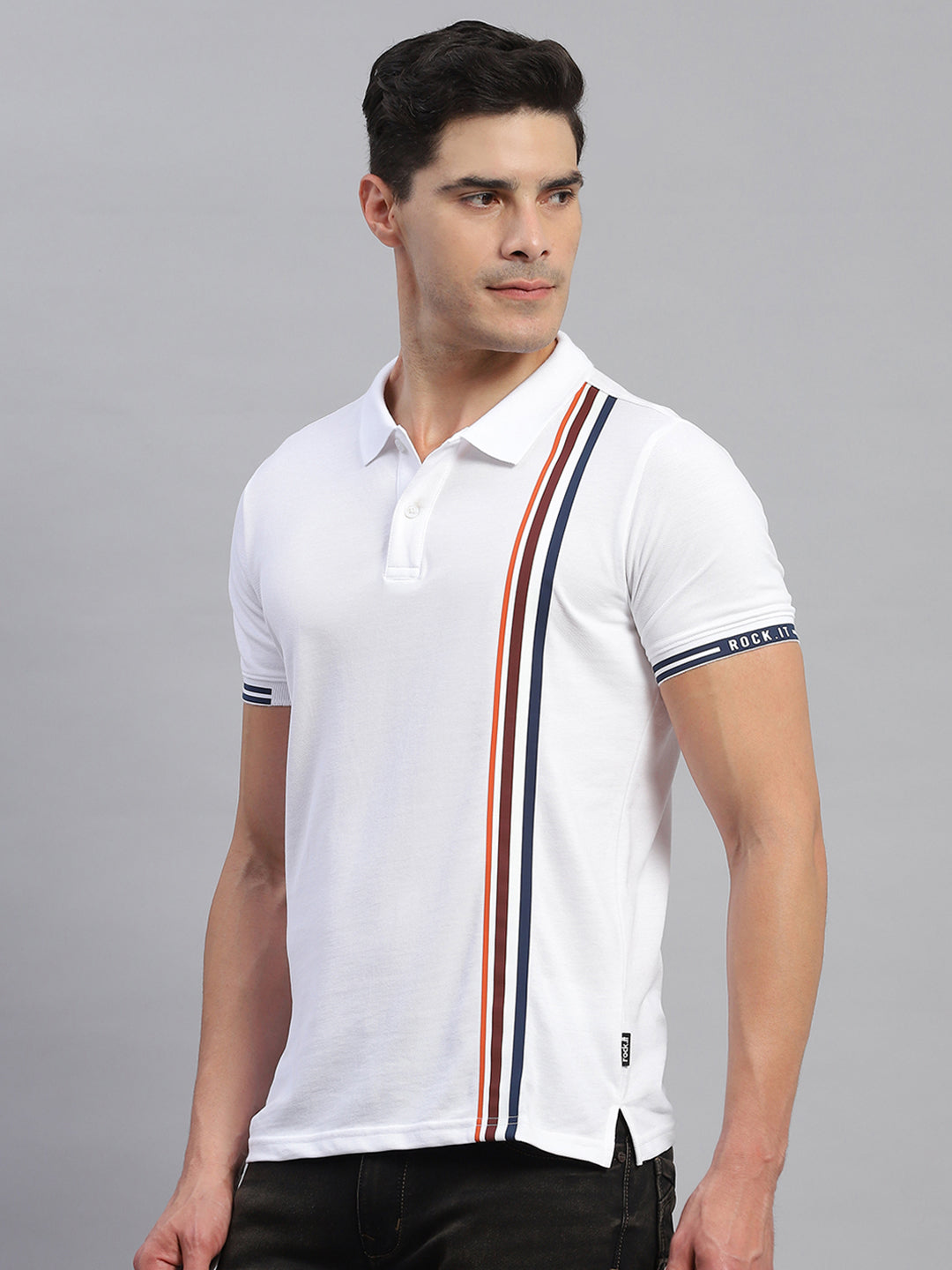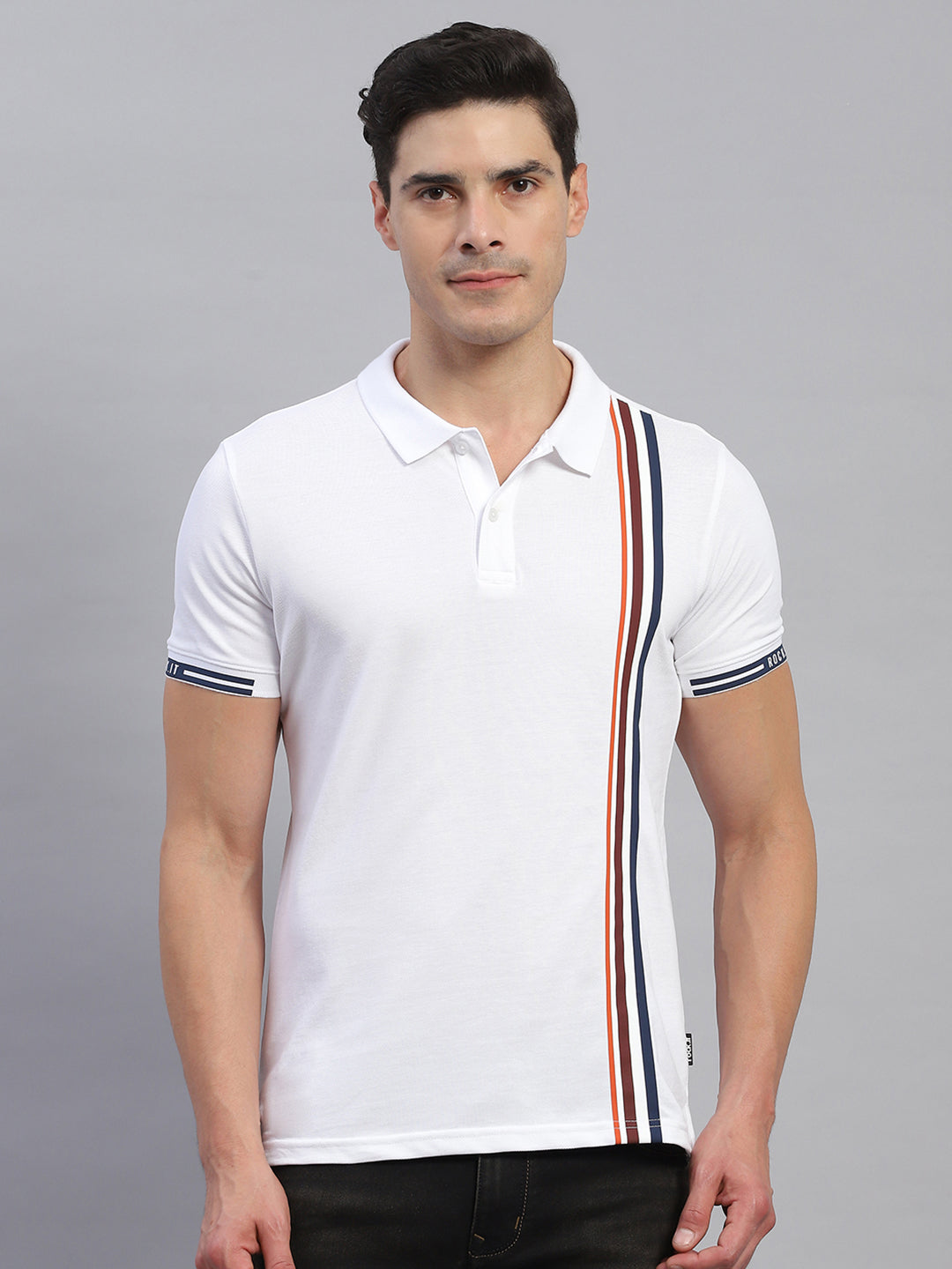 - Men White Stripe Collar Half Sleeve T-Shirt