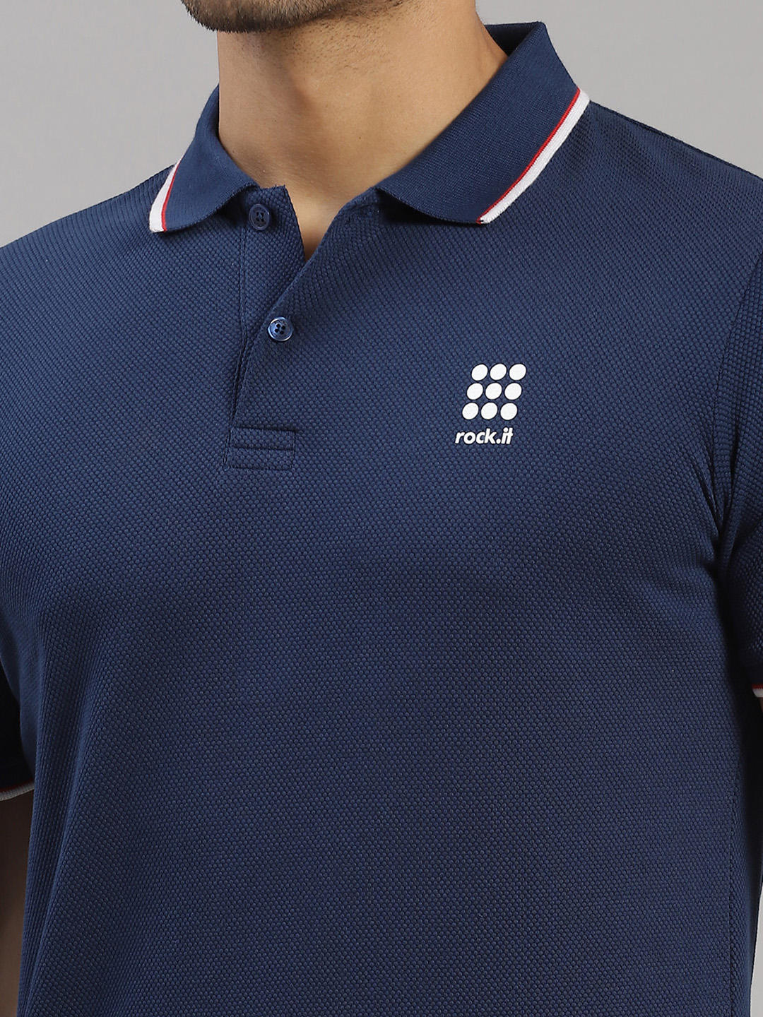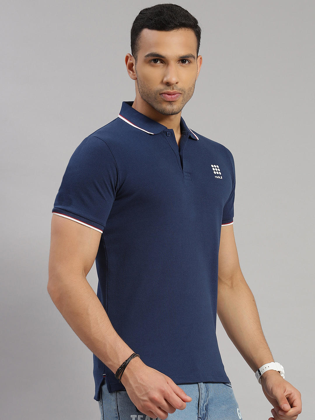 - Men Cotton Blend Blue Self Design Collar T-Shirt