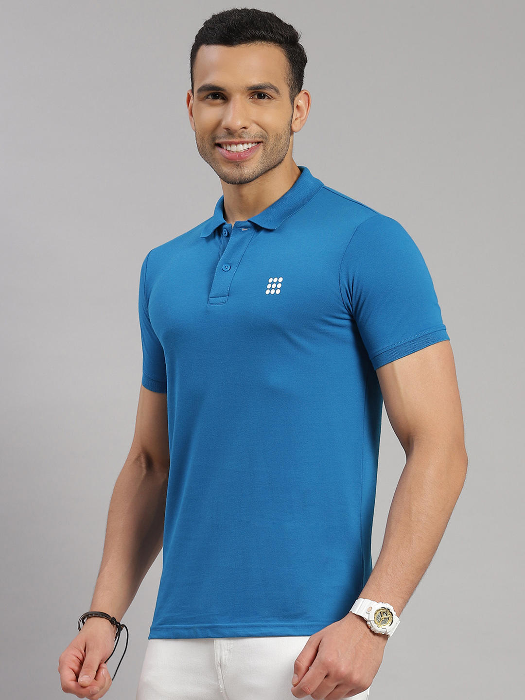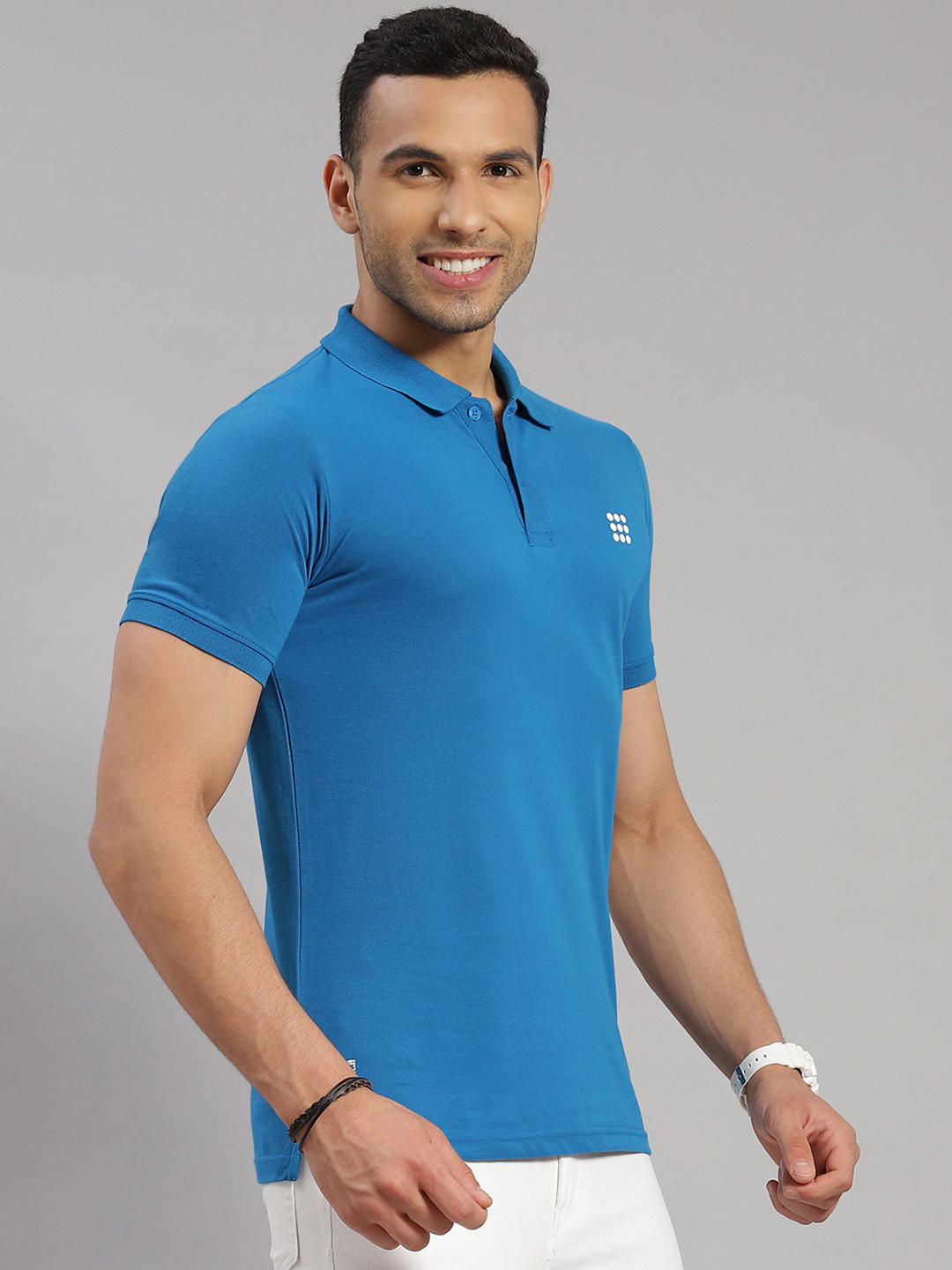 Men Cotton Blend Turquoise Blue Solid Collar T-Shirt