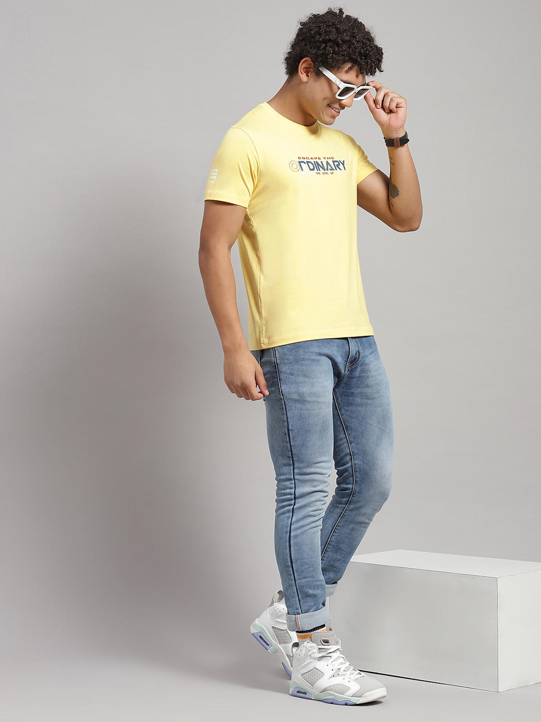 - Men Cotton Blend Yellow/Coral Printed T-Shirt 2 Pc Set