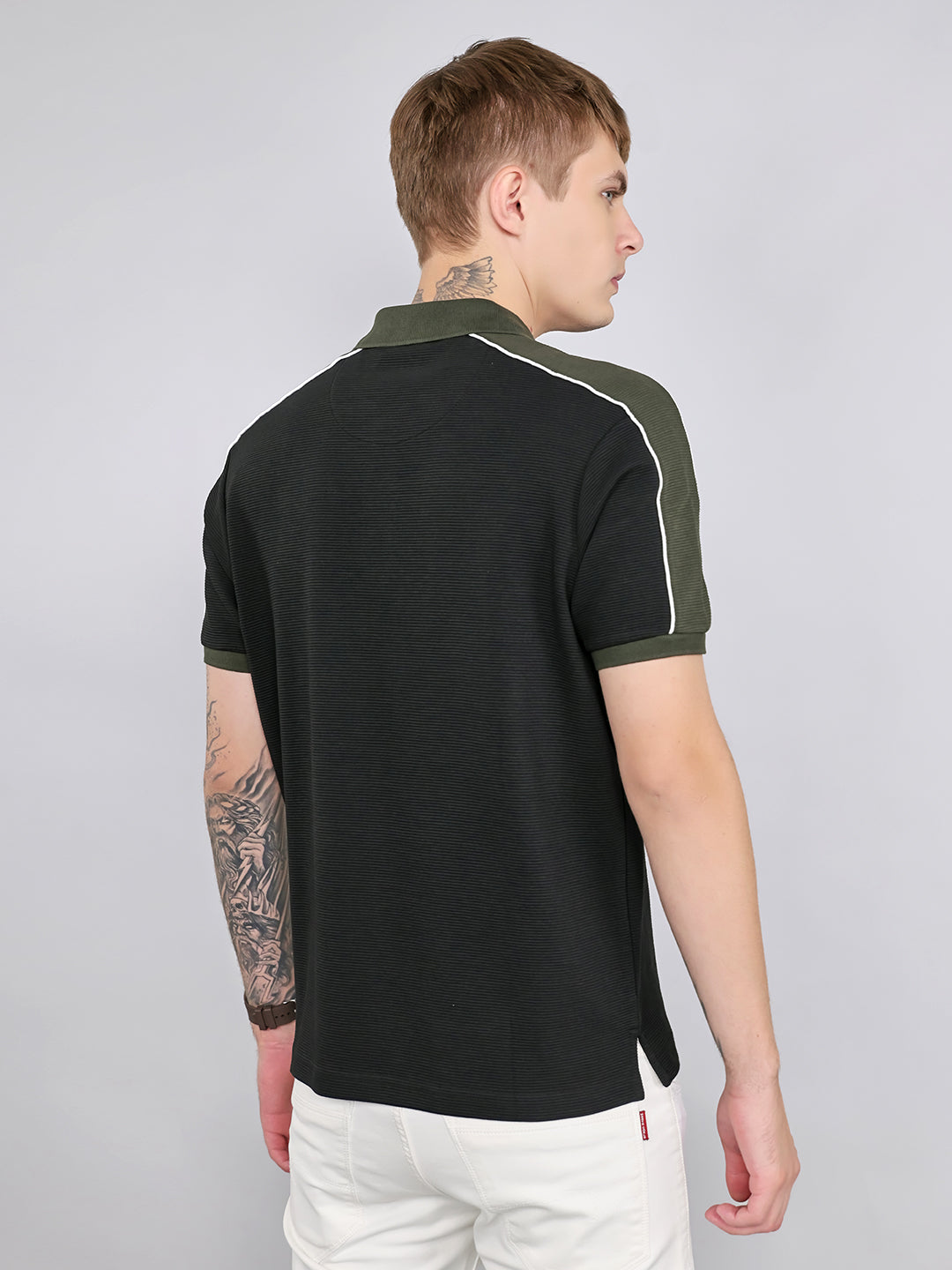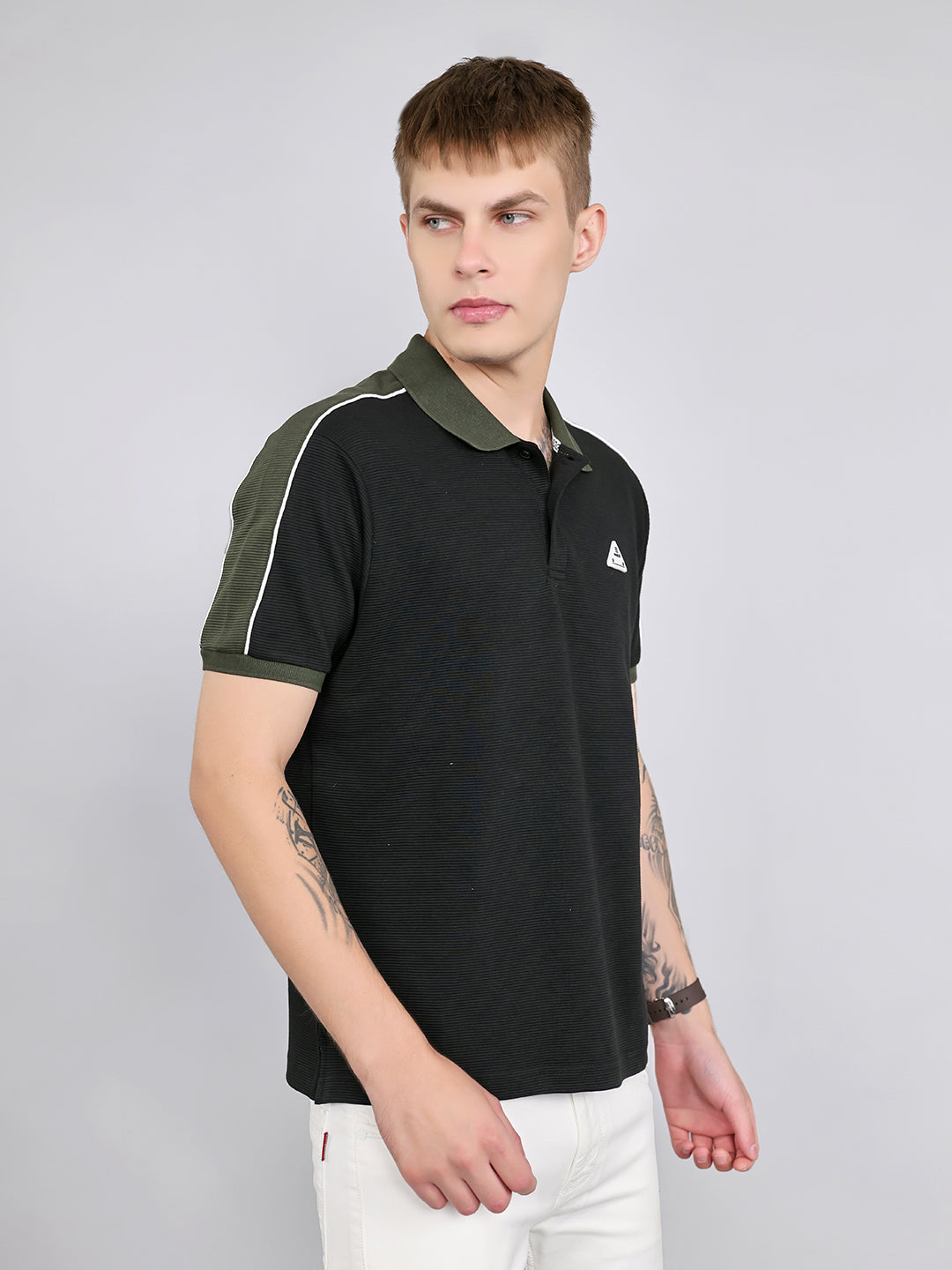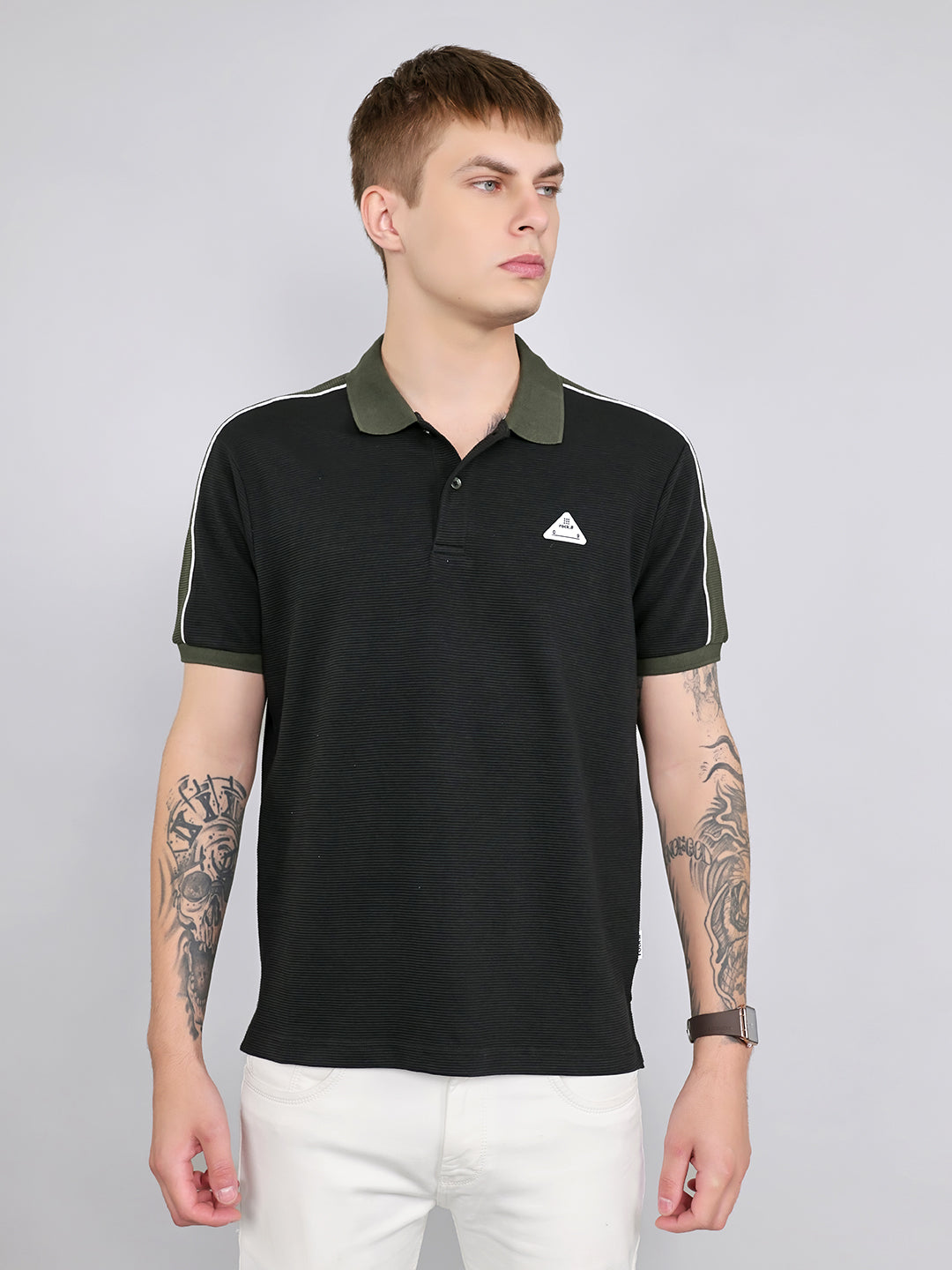 - Men Black Self Design Collar Half Sleeve T-Shirt