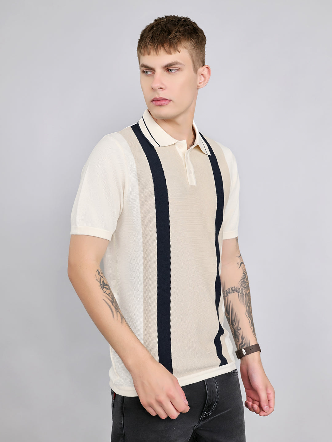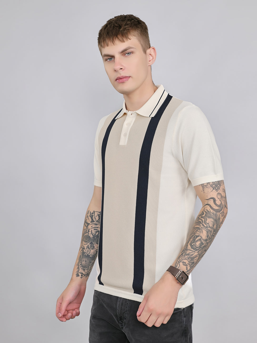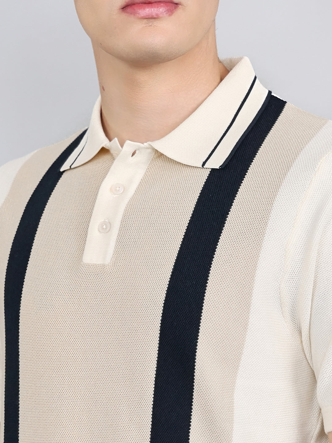 - Men Cream Stripe Collar Half Sleeve T-Shirt