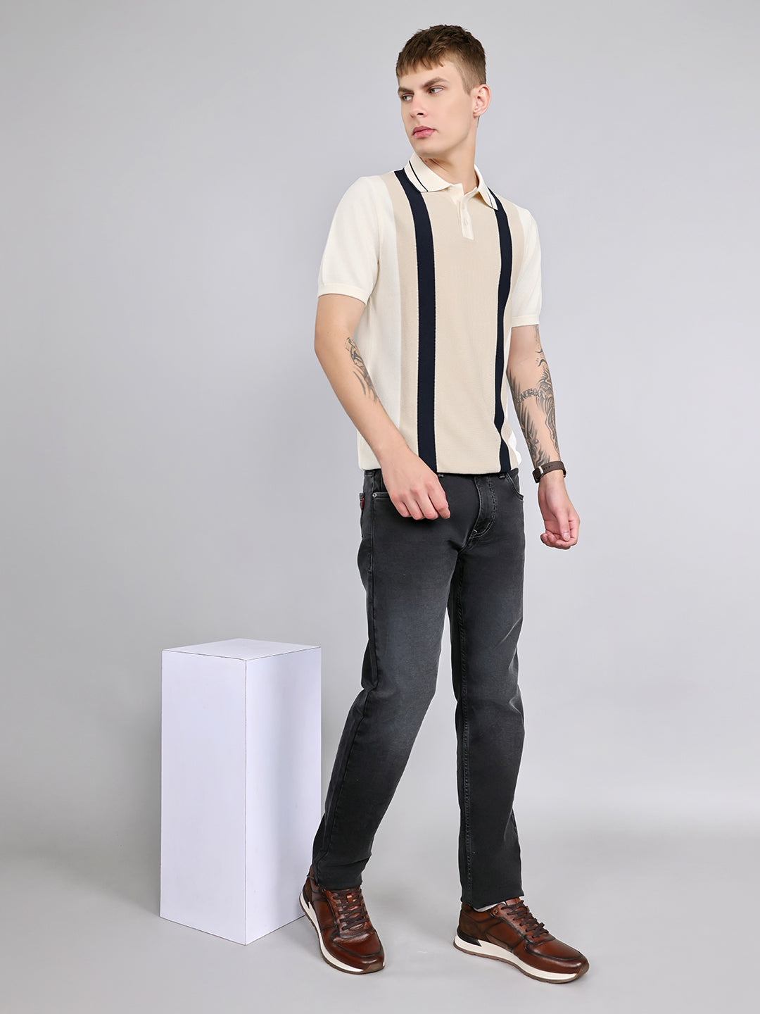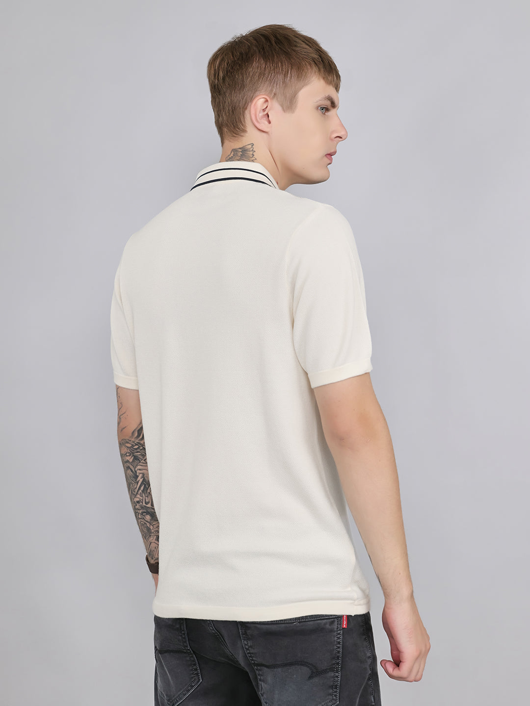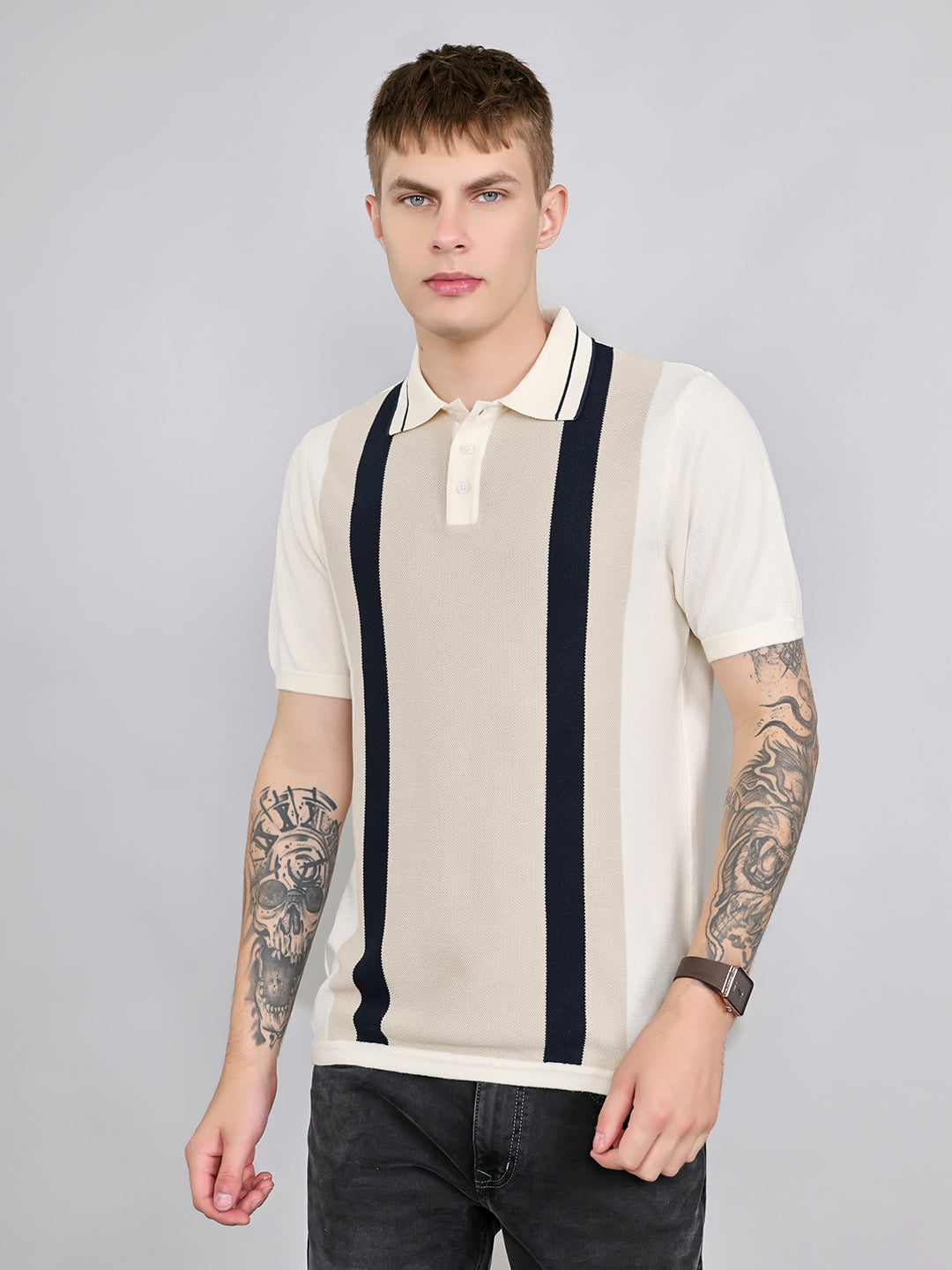 - Men Cream Stripe Collar Half Sleeve T-Shirt