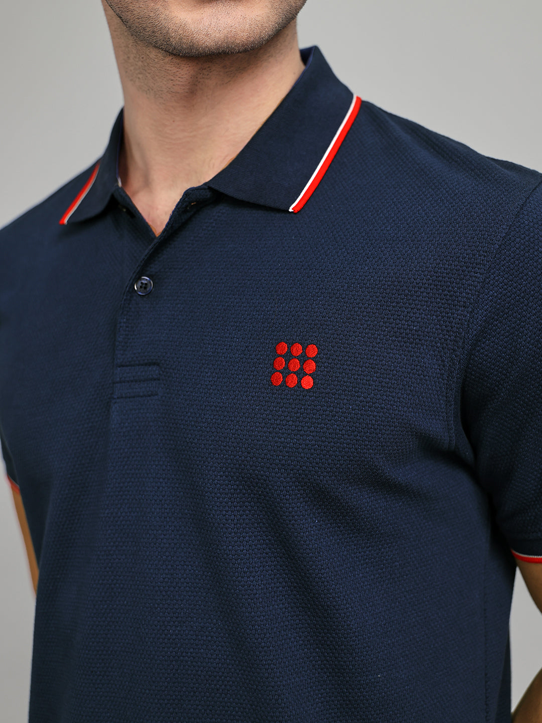 - Men Dark Blue Self Design Collar Half Sleeve T-Shirt