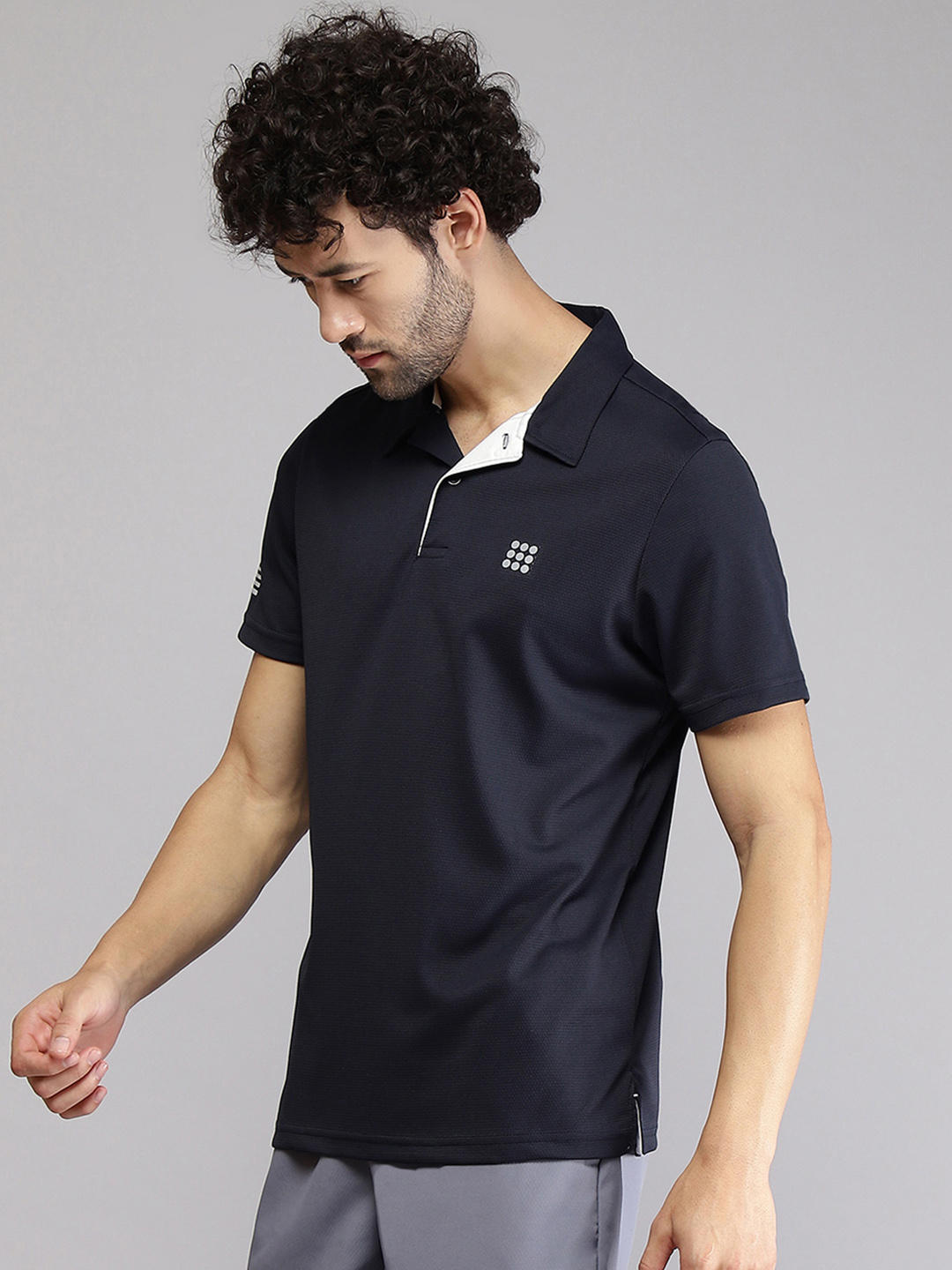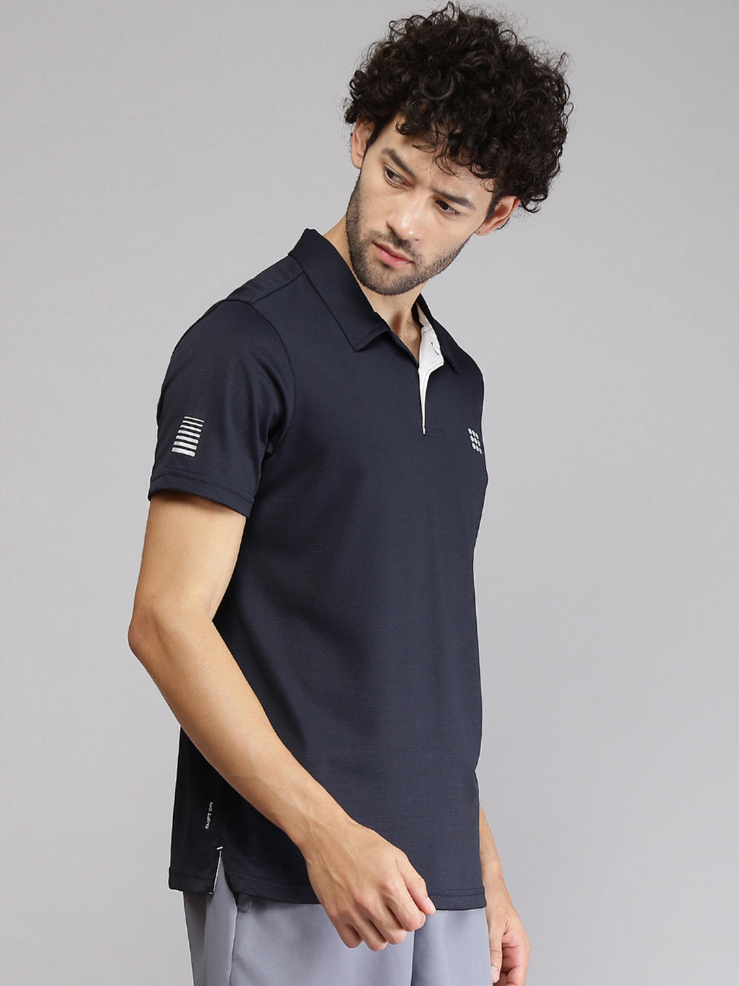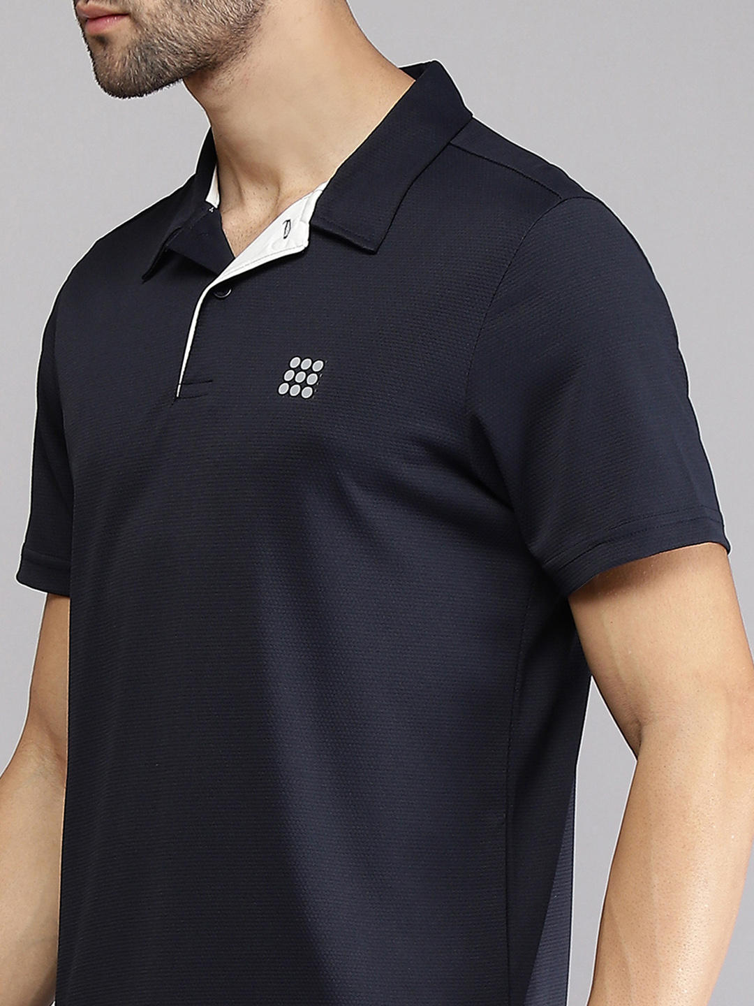 - Mens Polyester Blend Navy Blue Self Design Collar T-Shirt