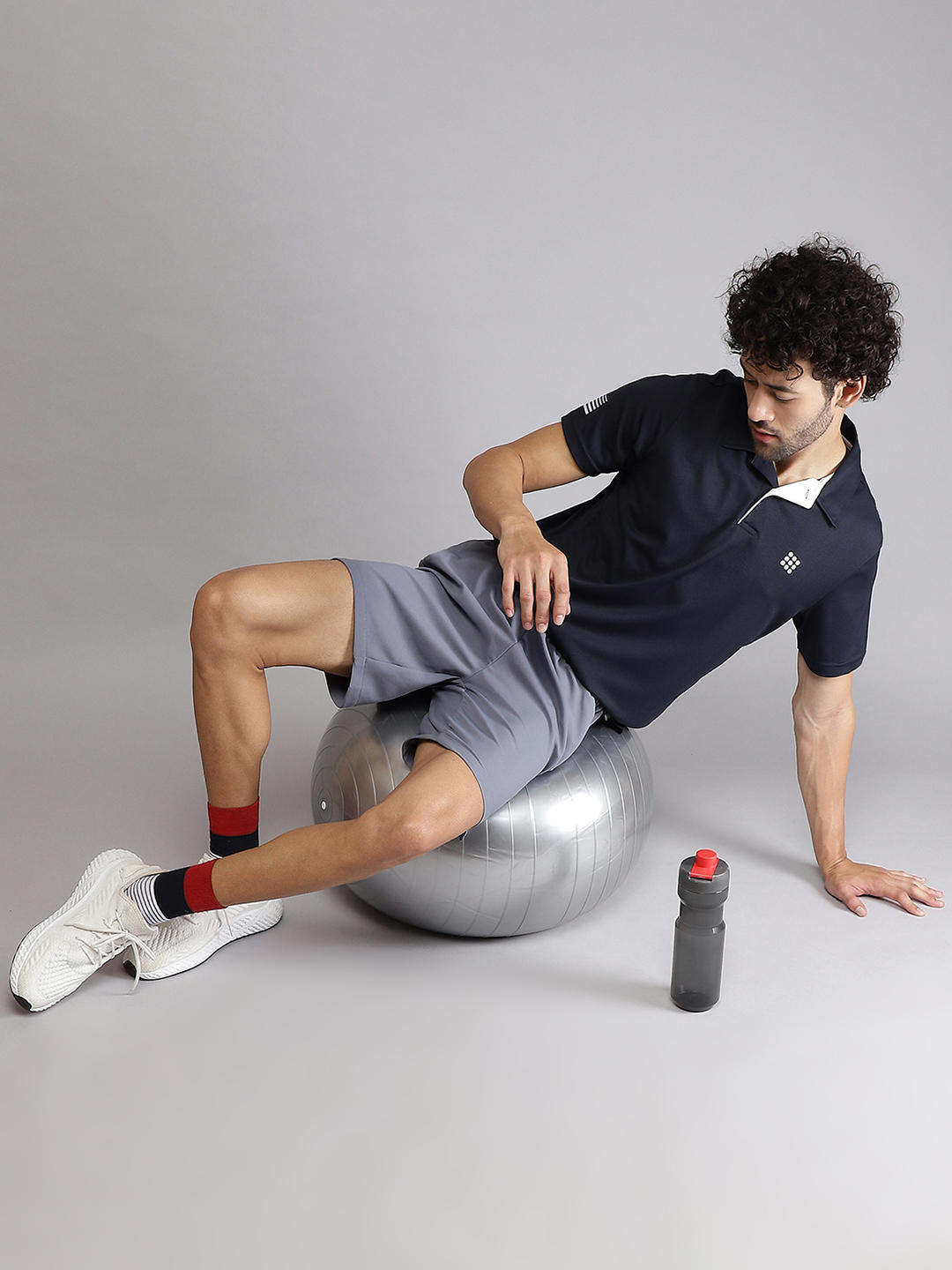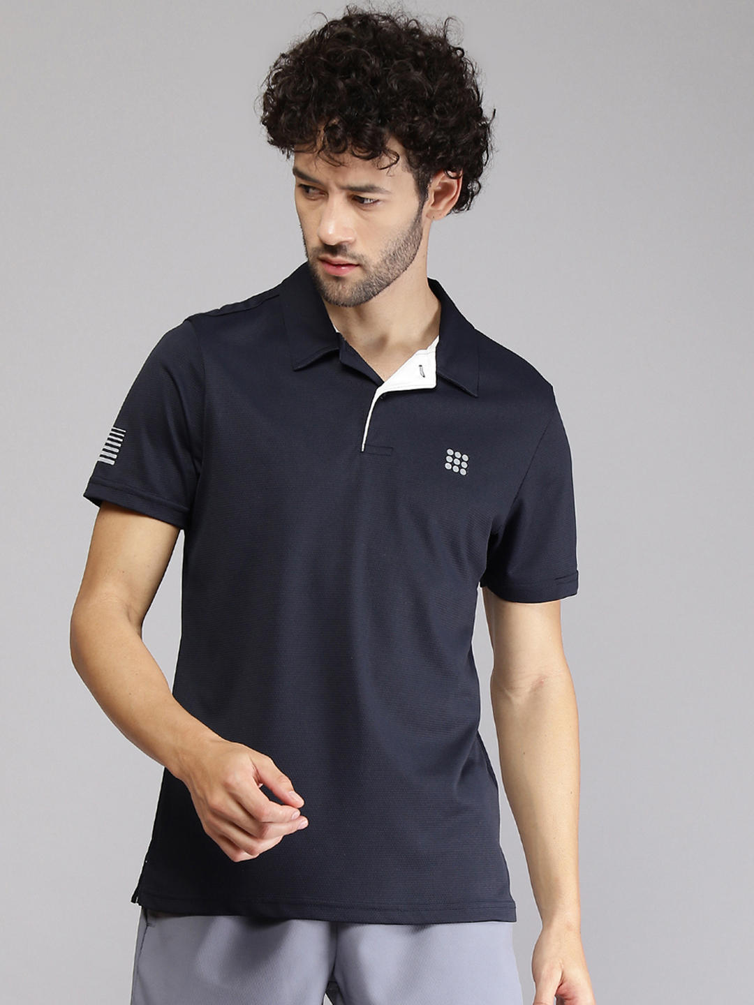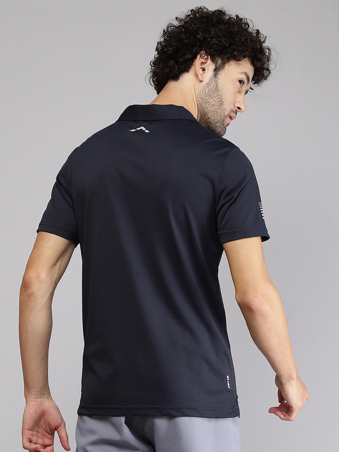 - Mens Polyester Blend Navy Blue Self Design Collar T-Shirt