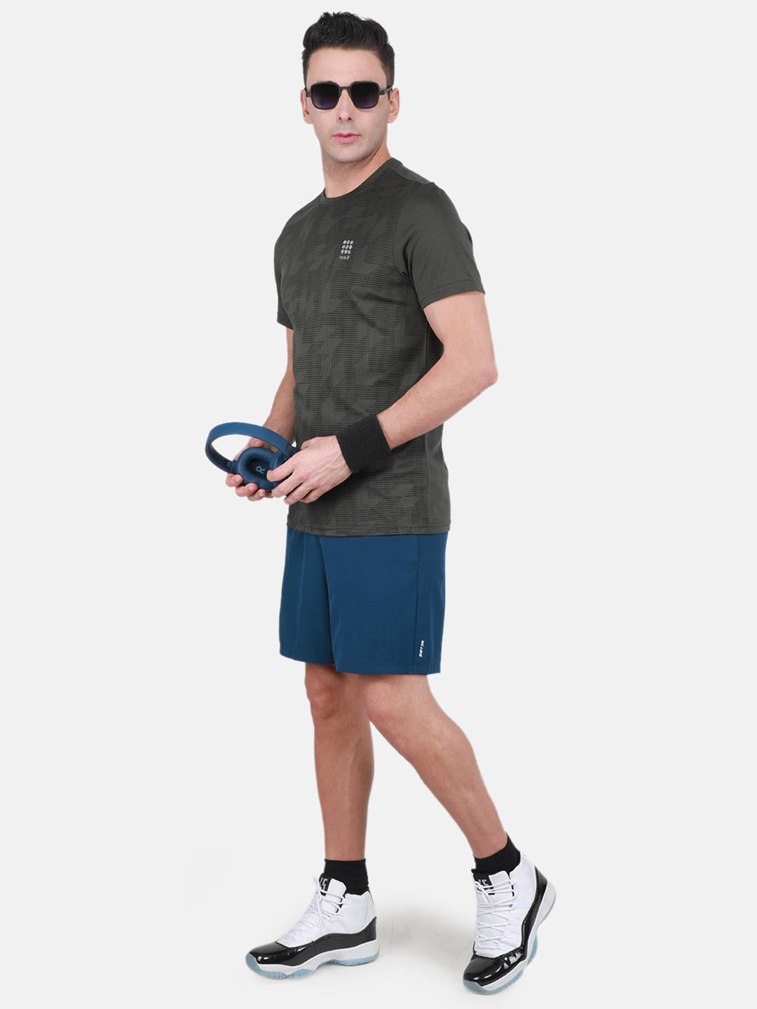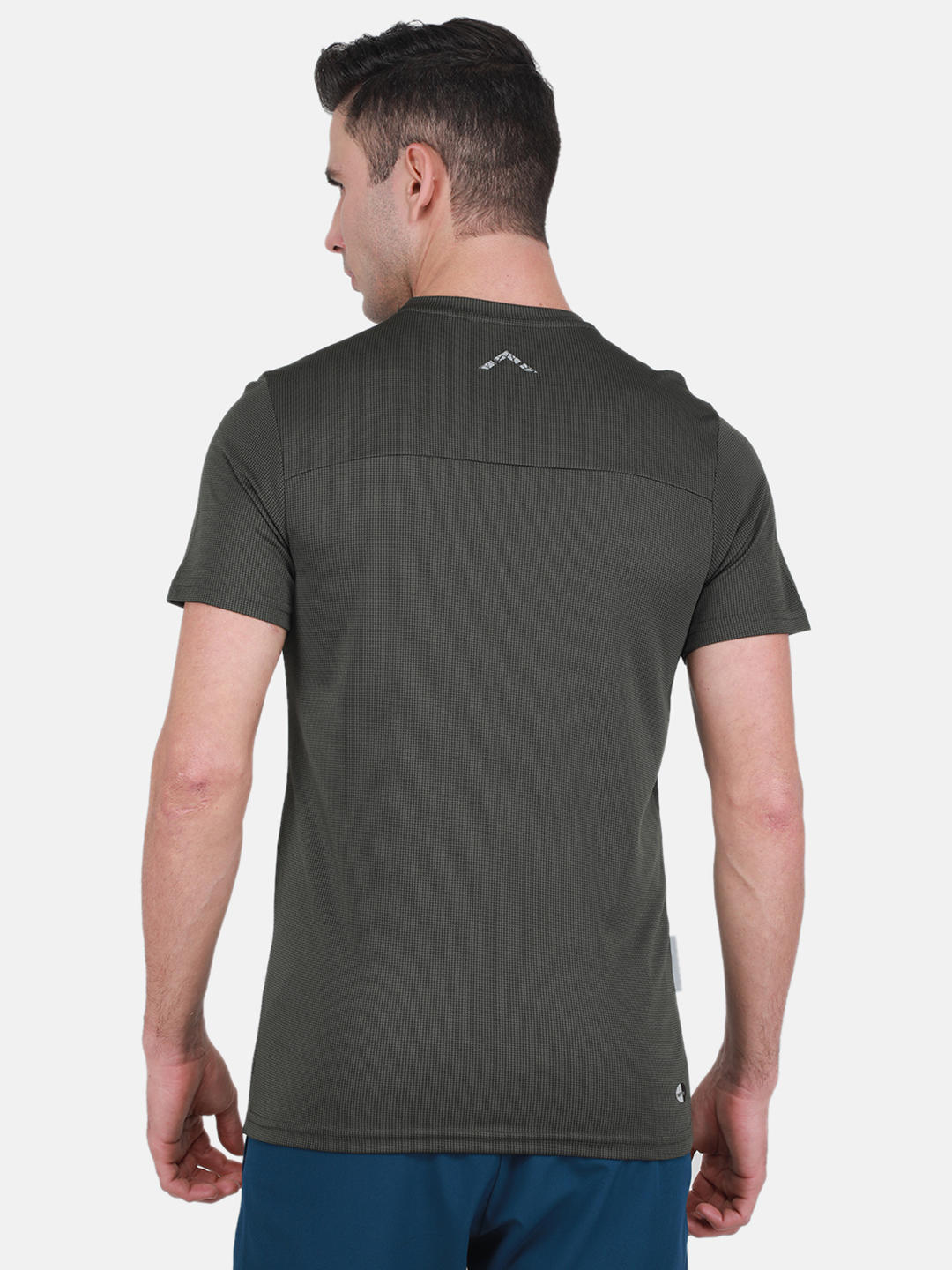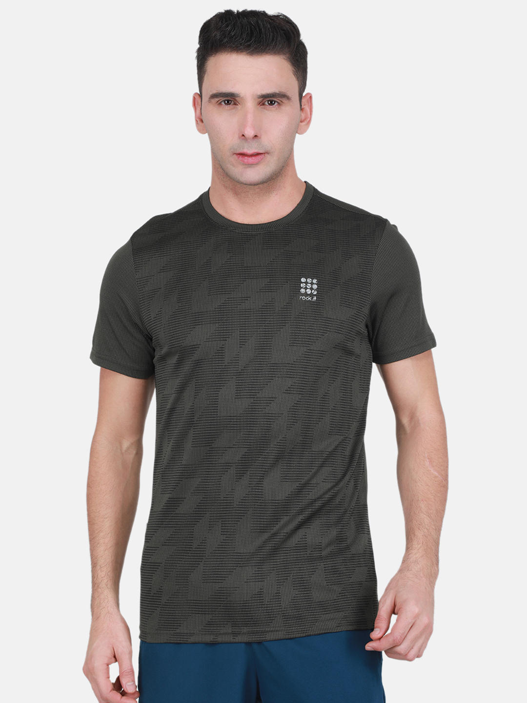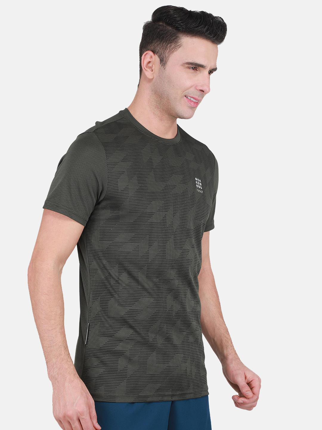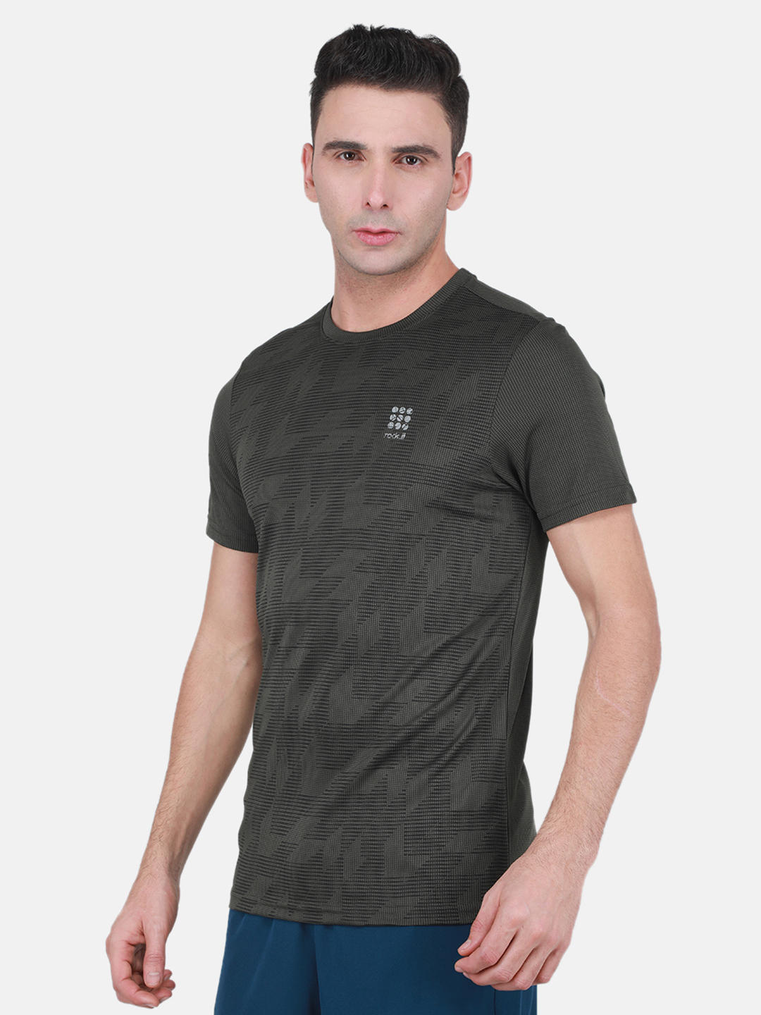 - Mens Polyester Blend Olive Self Design Round Neck T-Shirt
