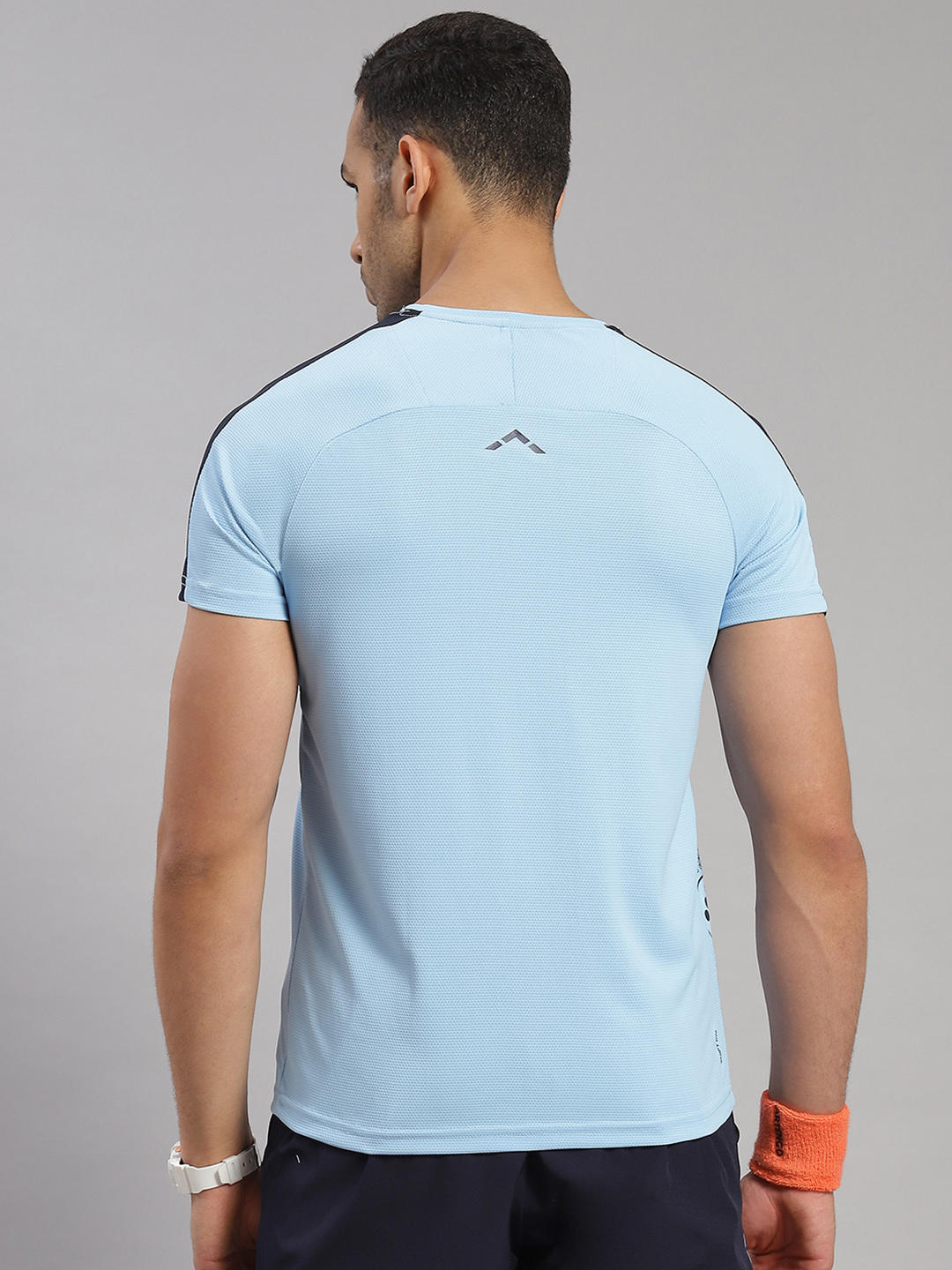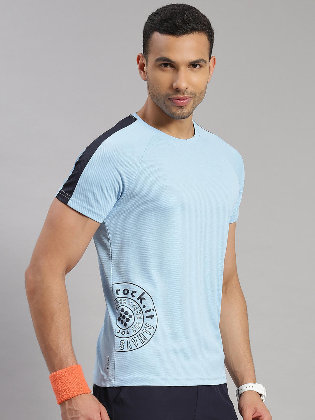 - Men Polyester Blend Blue Self Design Round Neck T-Shirt