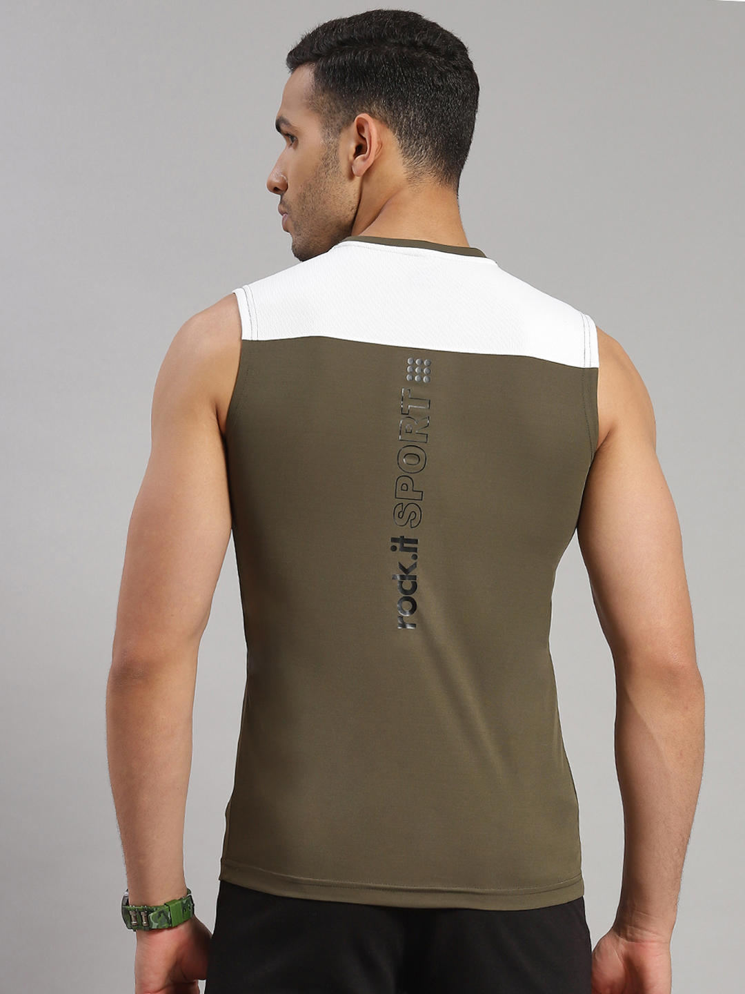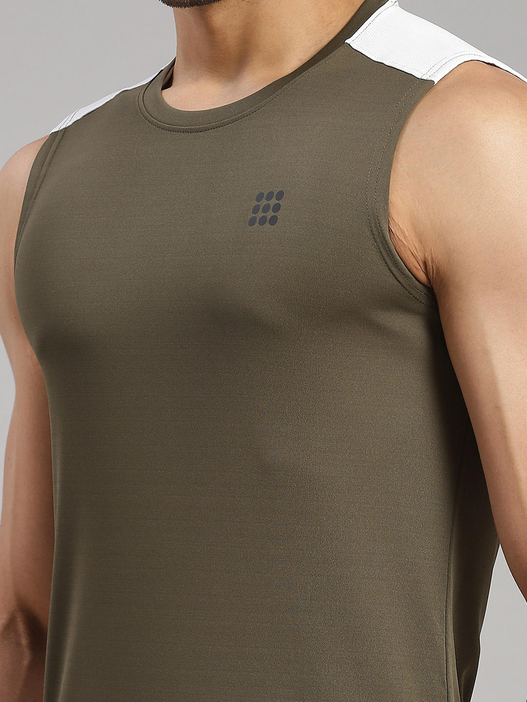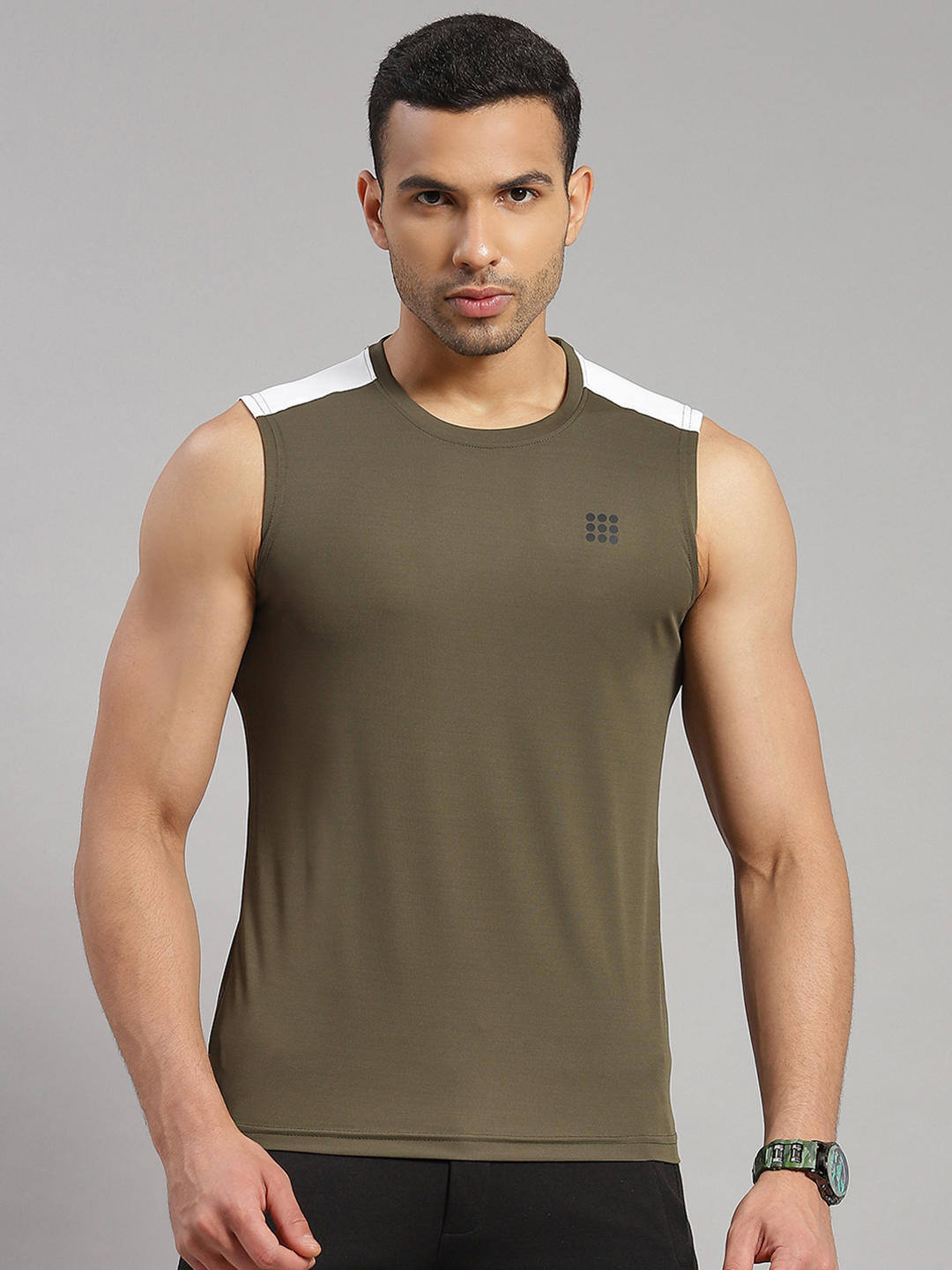 - Men Polyester Blend Olive Solid Round Neck T-Shirt