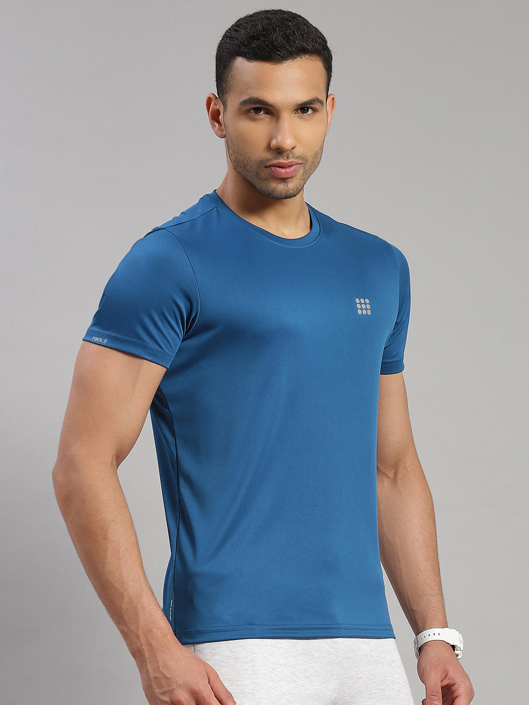 - Men Polyester Blend Teal Solid Round Neck T-Shirt