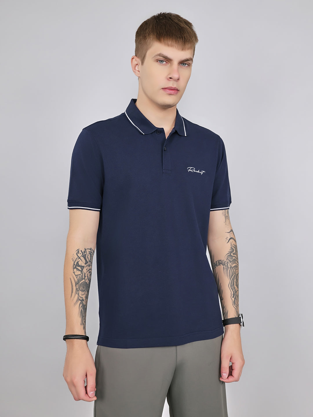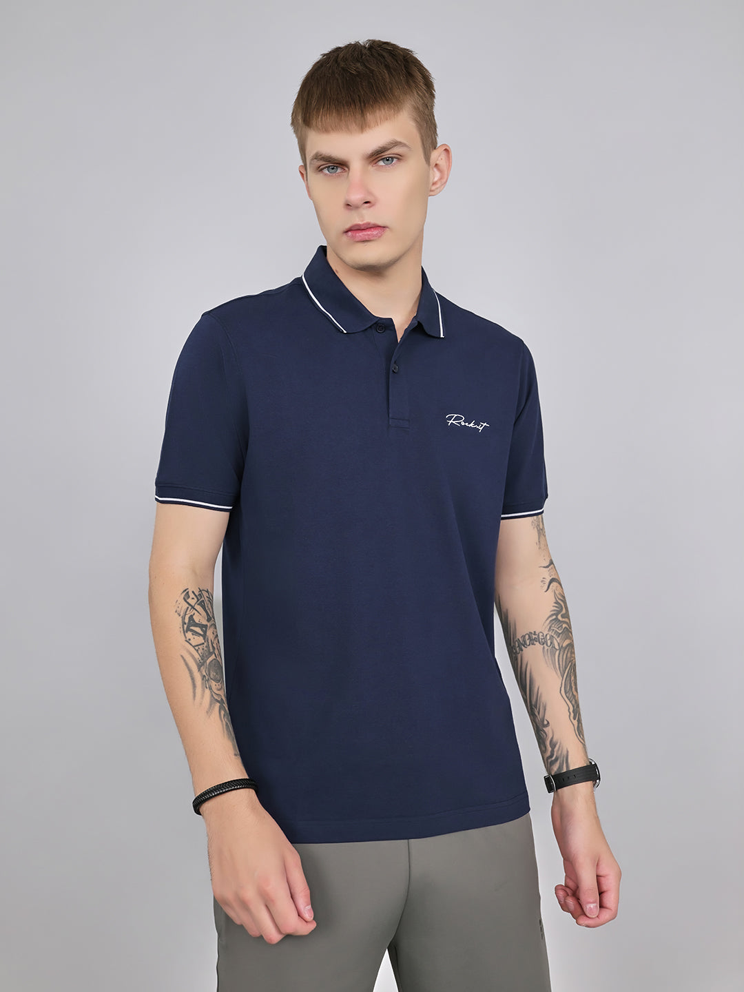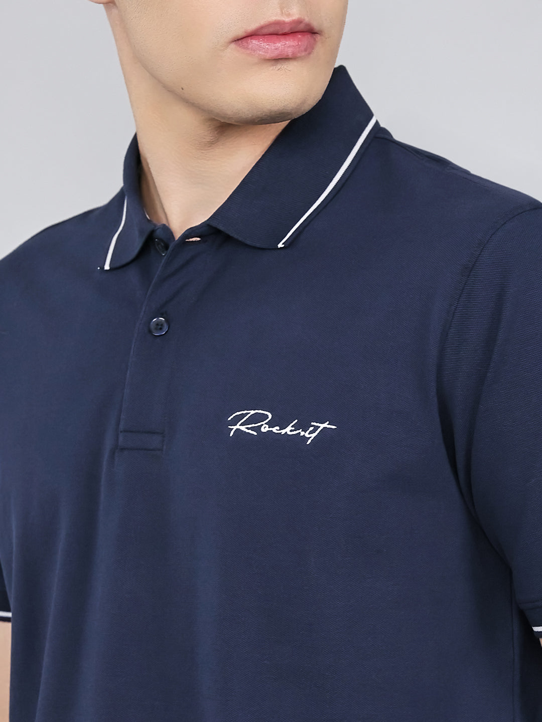 - Men Navy Blue Solid Collar Half Sleeve T-Shirt