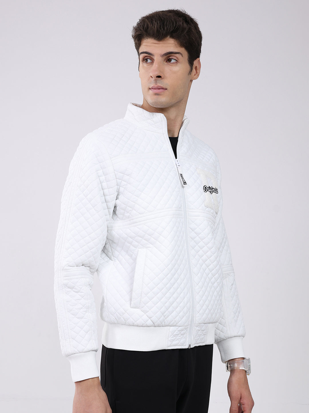- Men White Self Design Mock Neck Full Sleeve Jacket