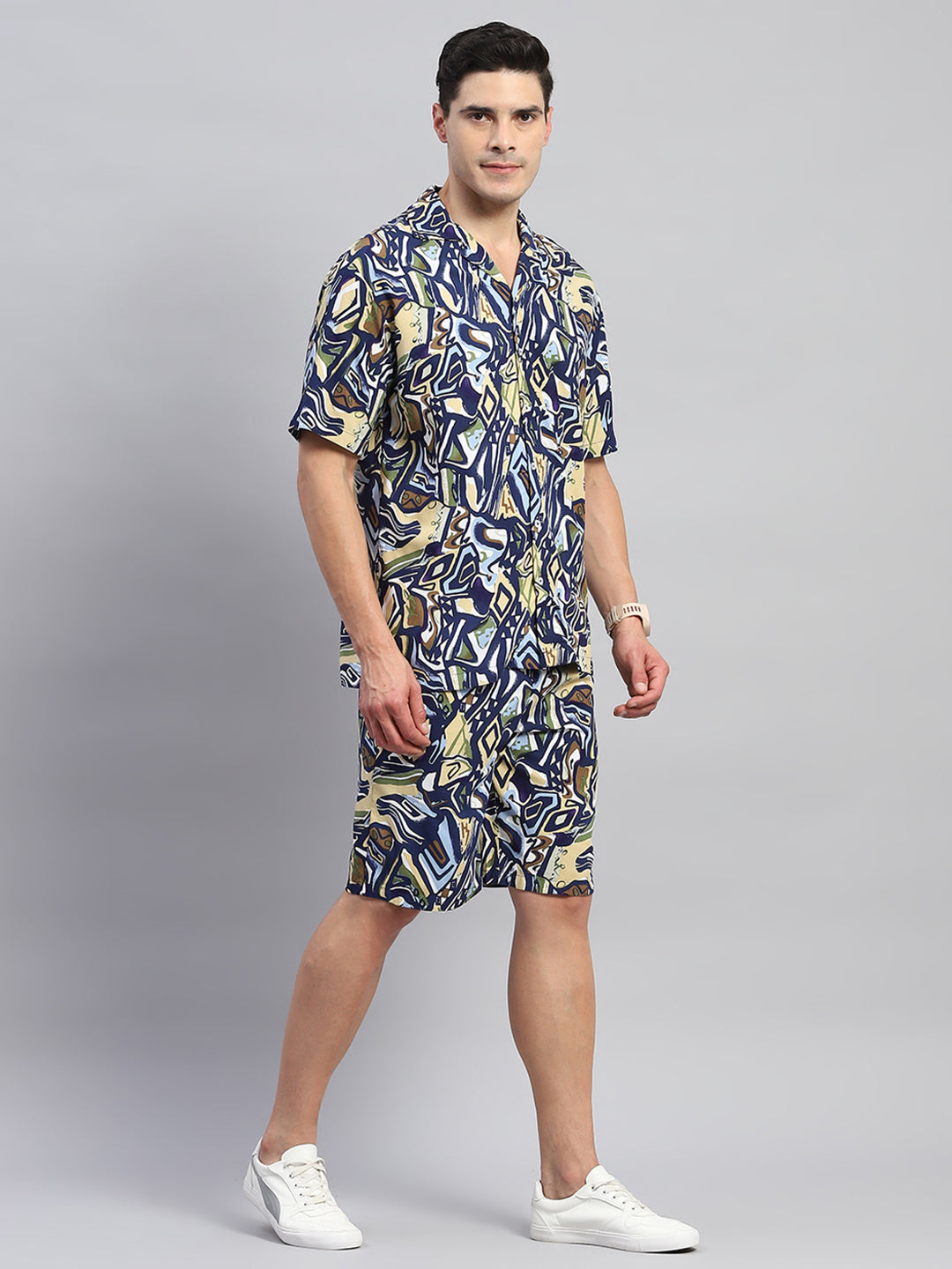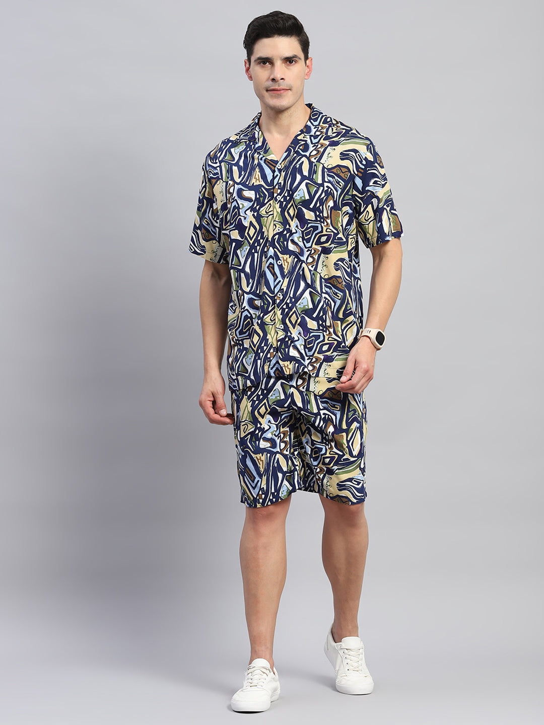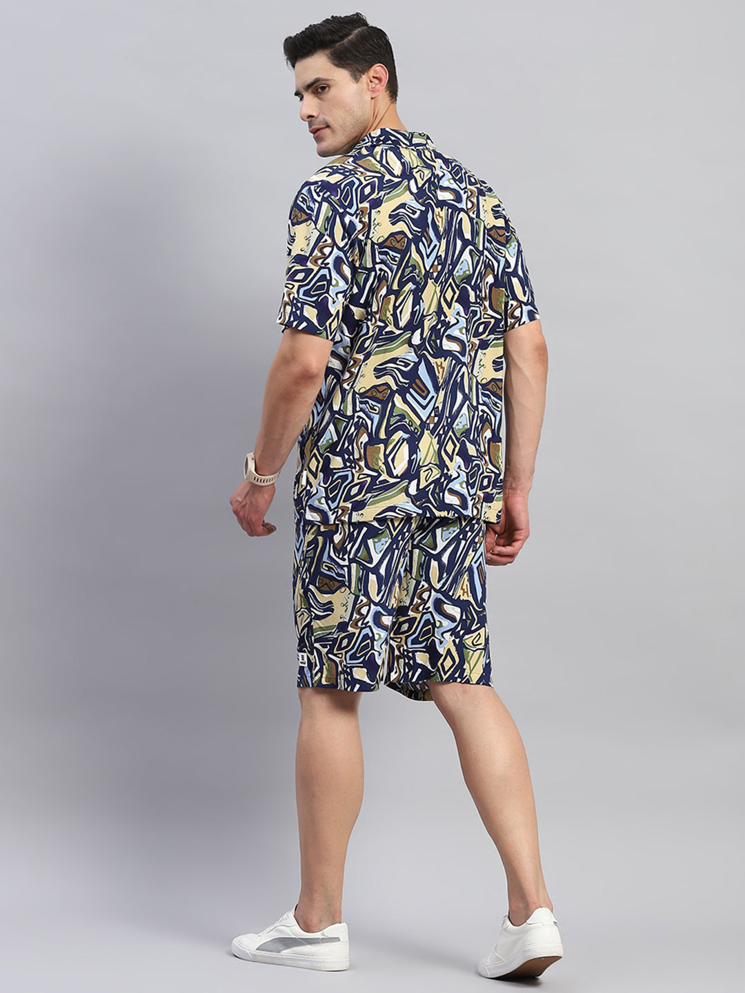 - Men Navy Blue Printed Round Neck Half Sleeve Cords Set