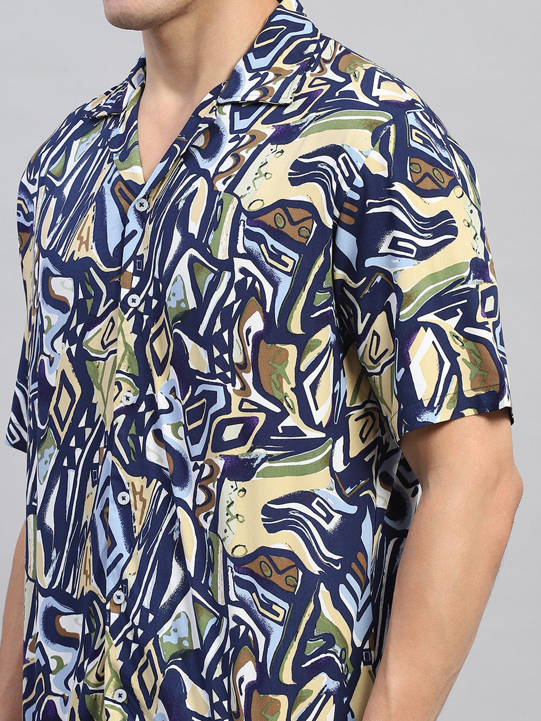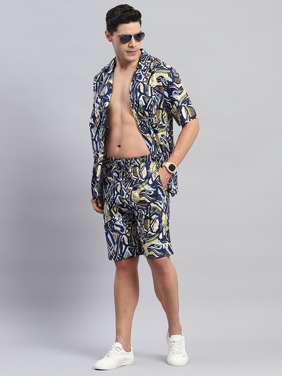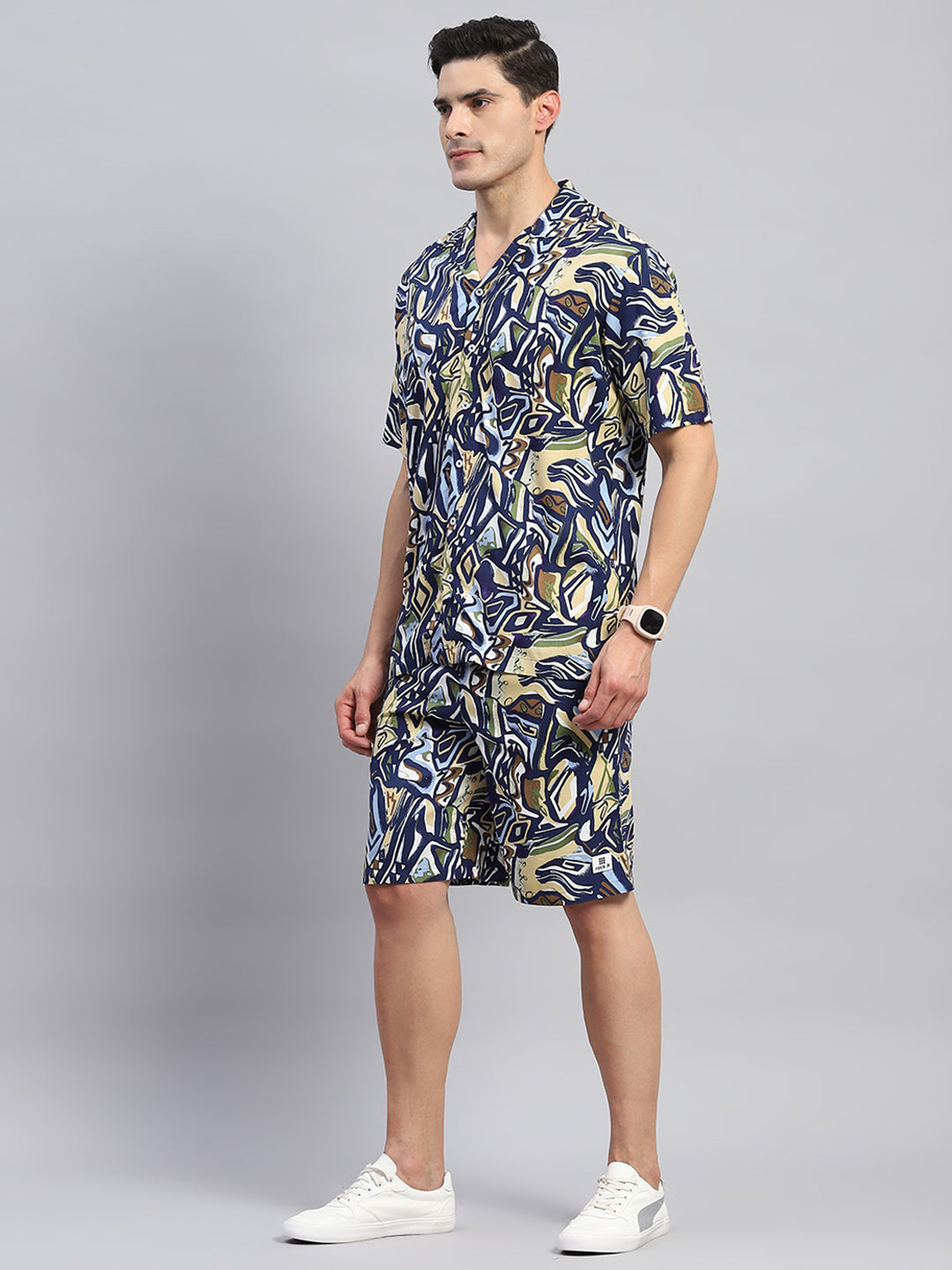 - Men Navy Blue Printed Round Neck Half Sleeve Cords Set