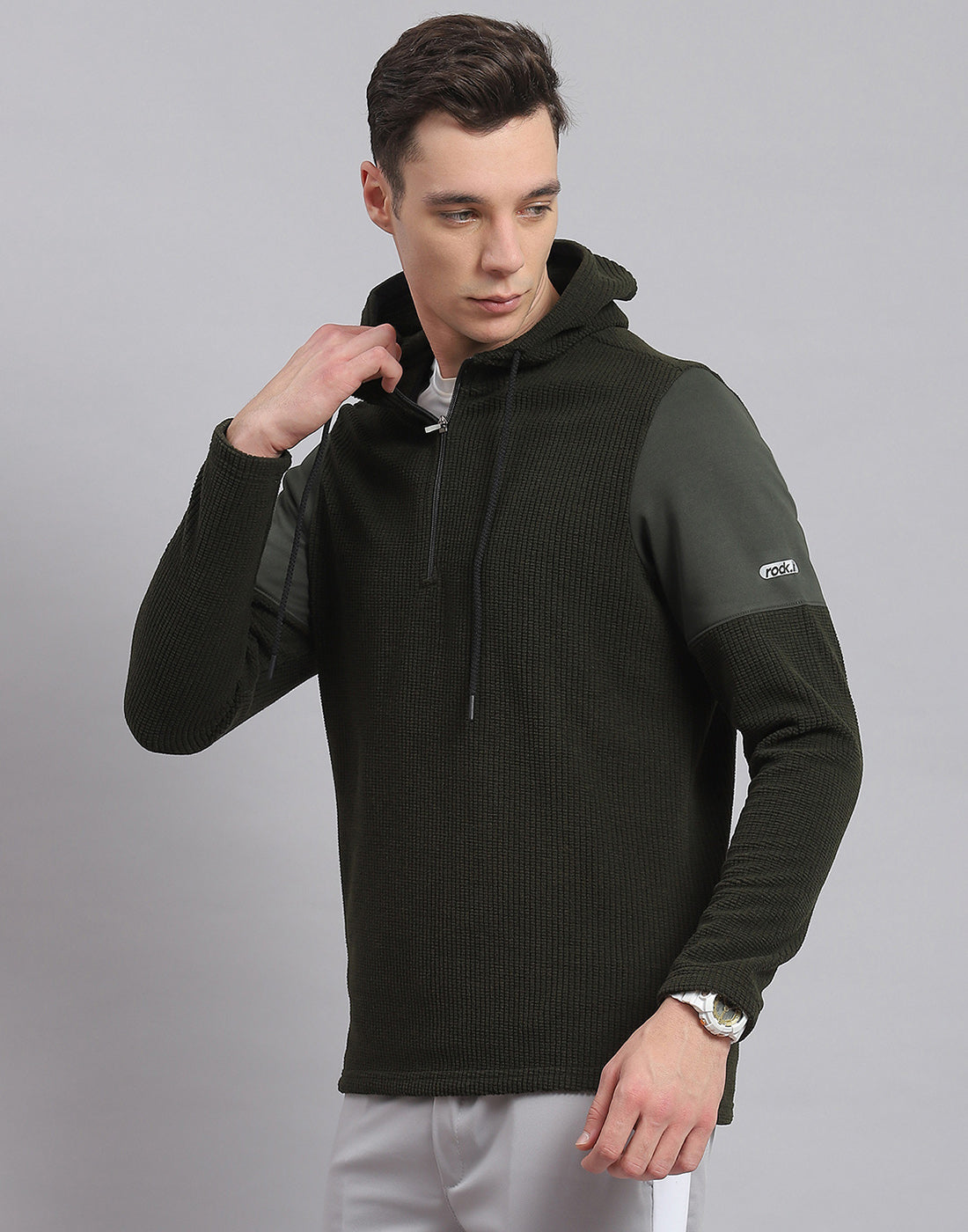 - Men Olive Solid Hooded Full Sleeve Sweatshirt