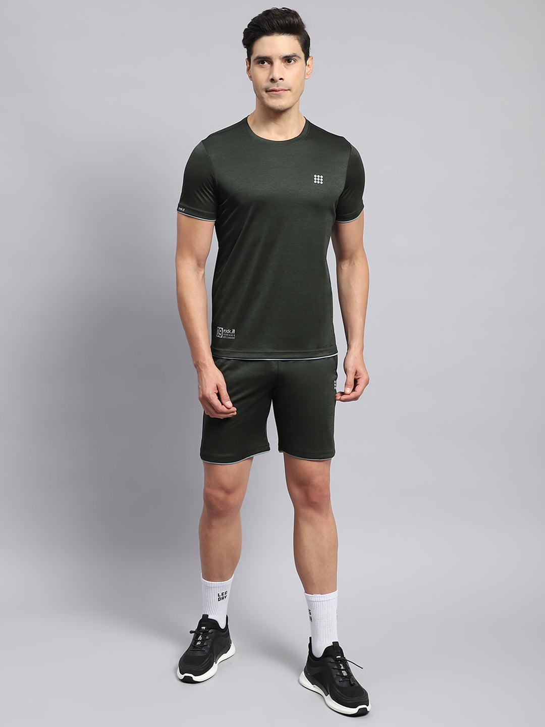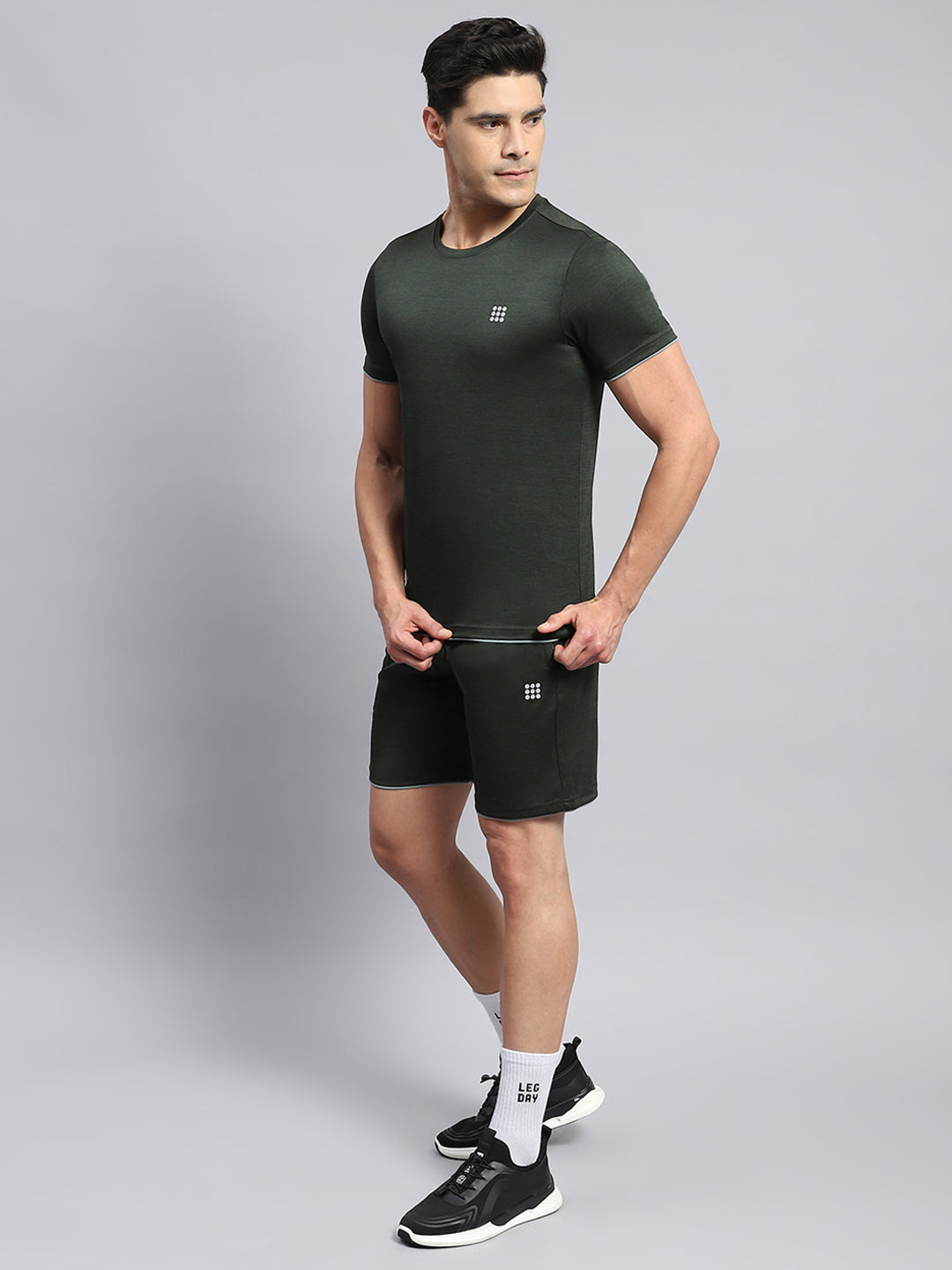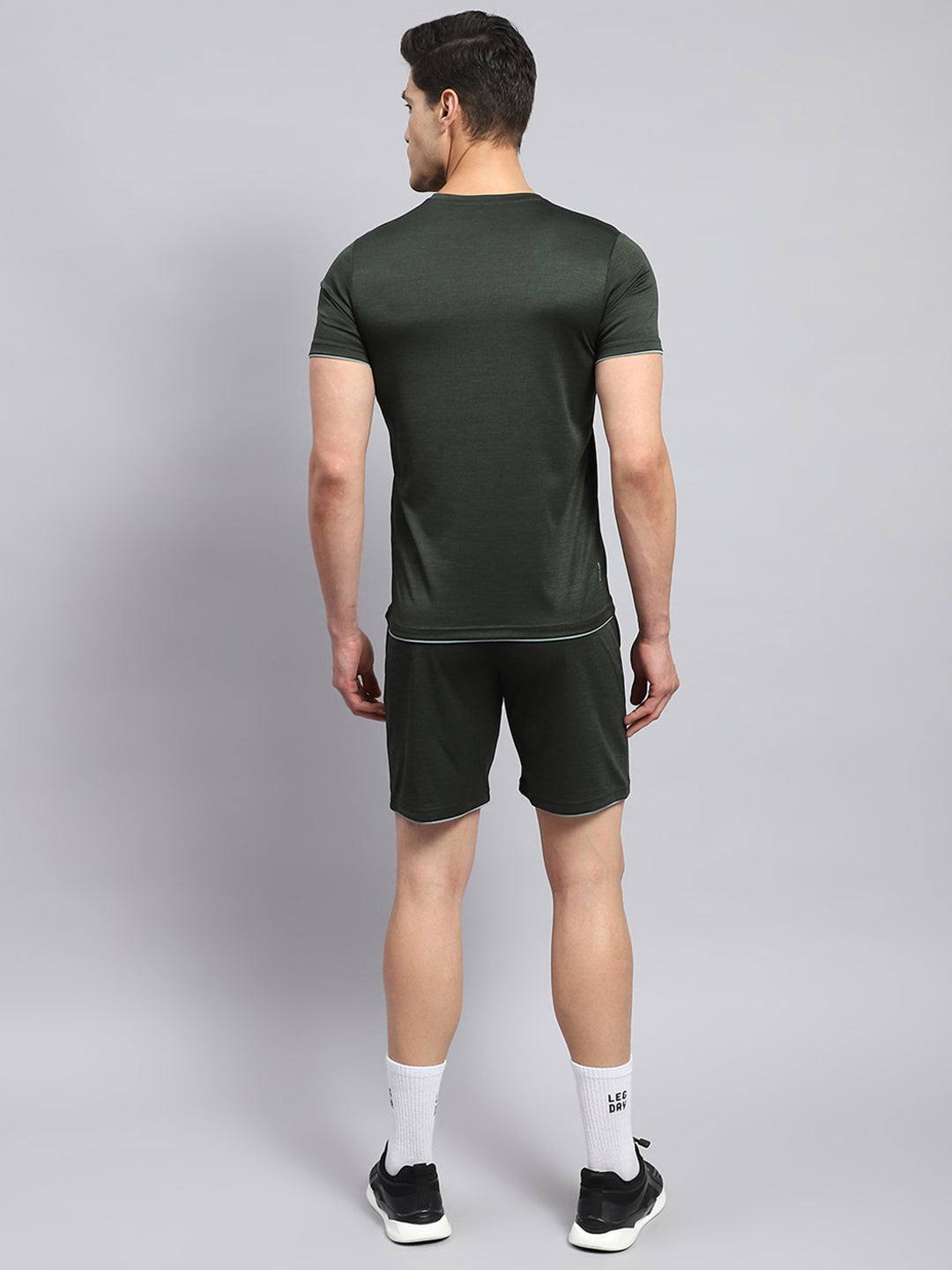 - Men Olive Solid Round Neck Half Sleeve Short Set
