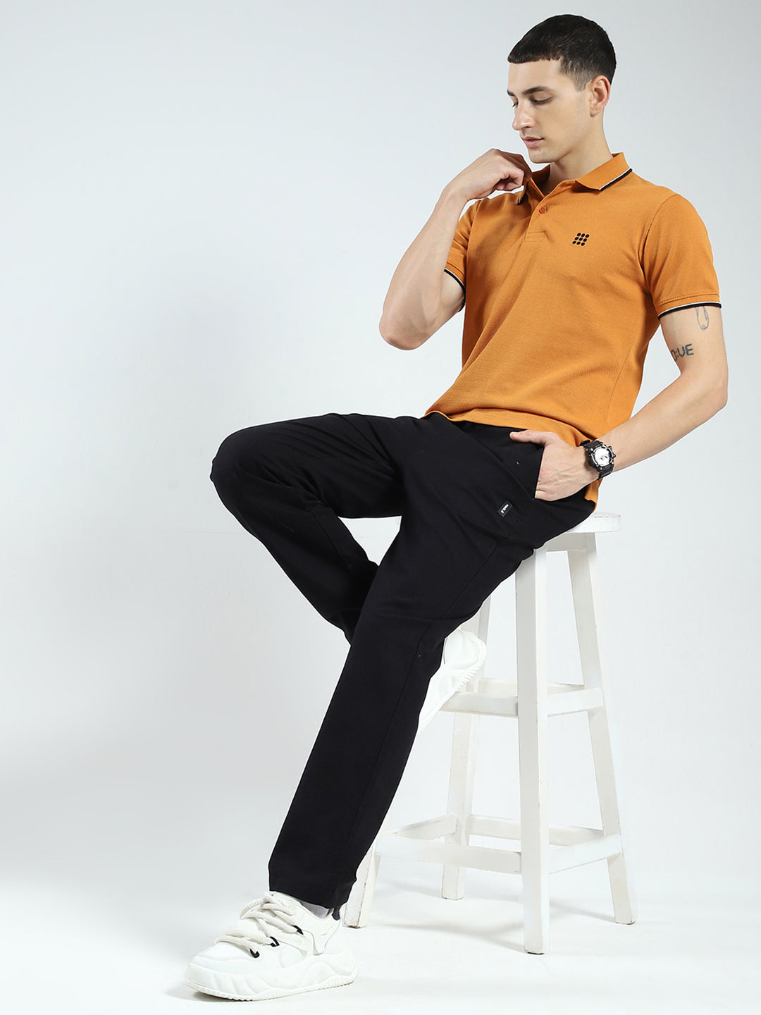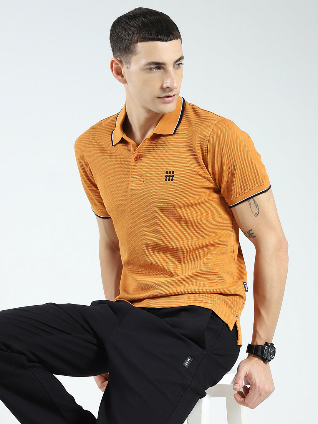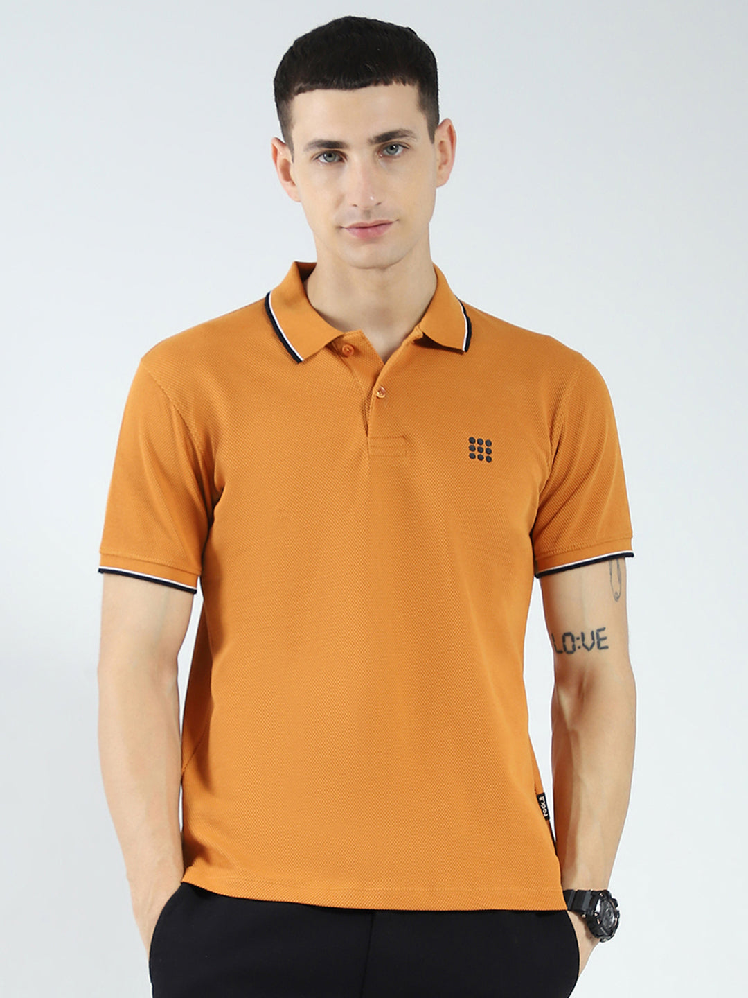 - Men Mustard Self Design Collar Half Sleeve T-Shirt