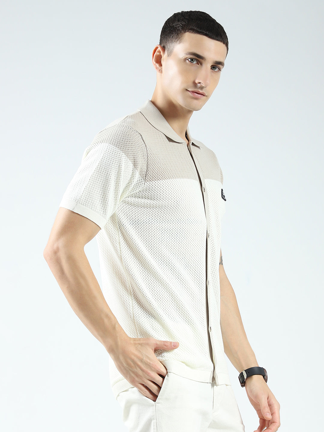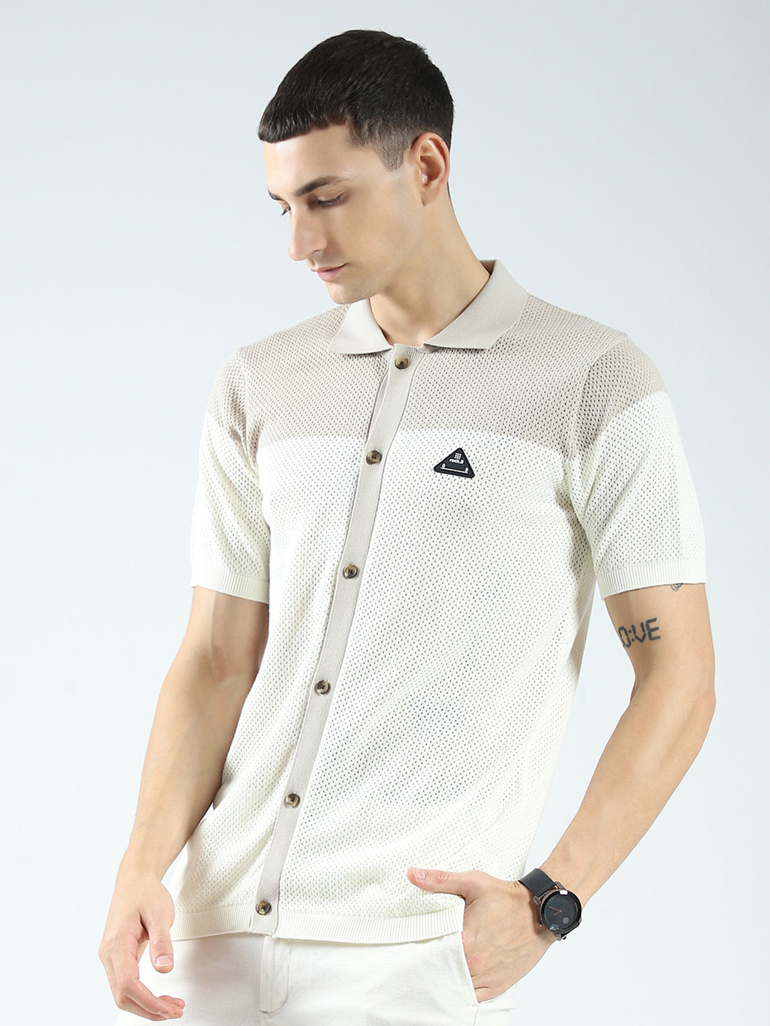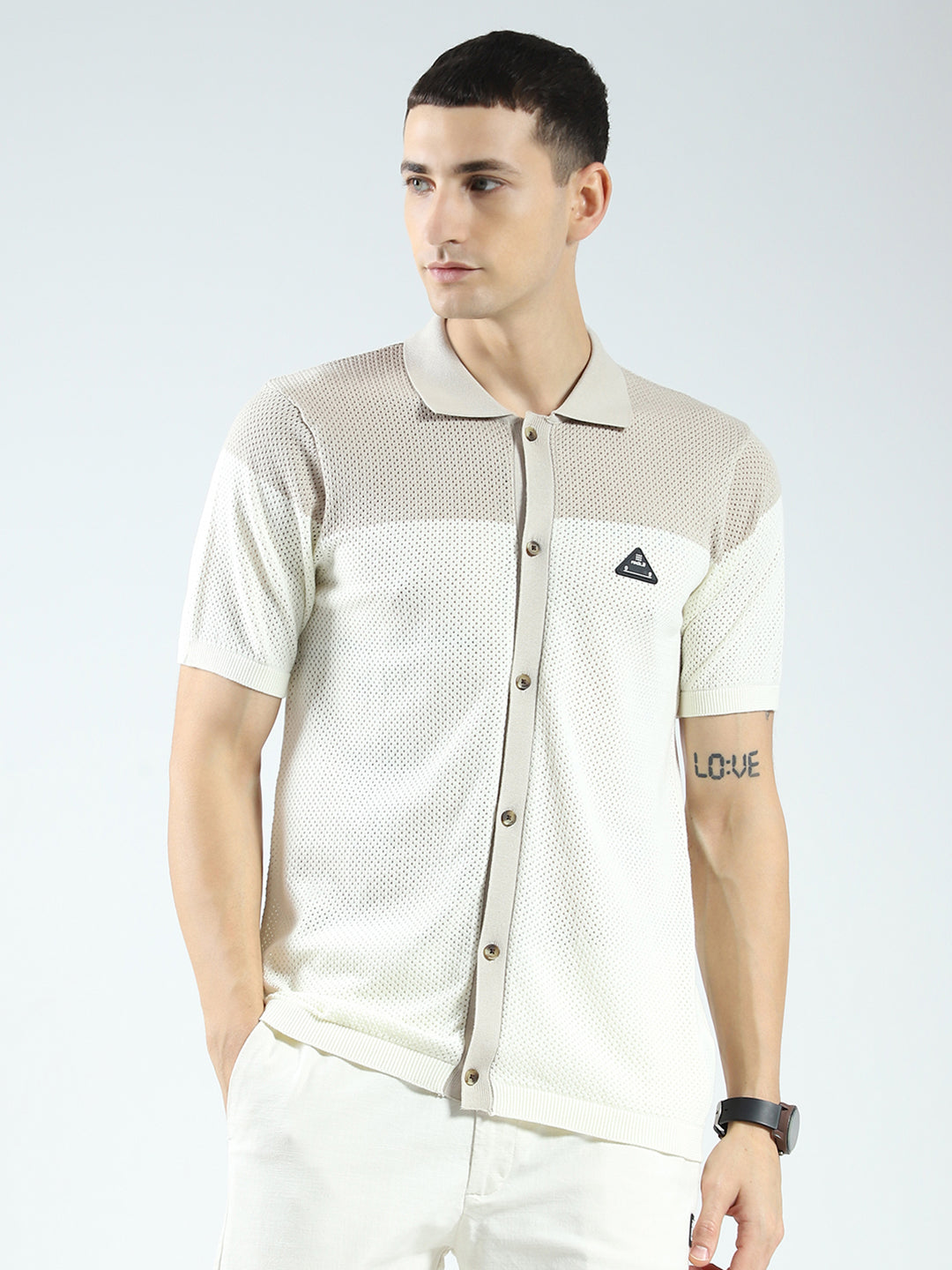 - Men Beige Self Design Collar Half Sleeve Shirt