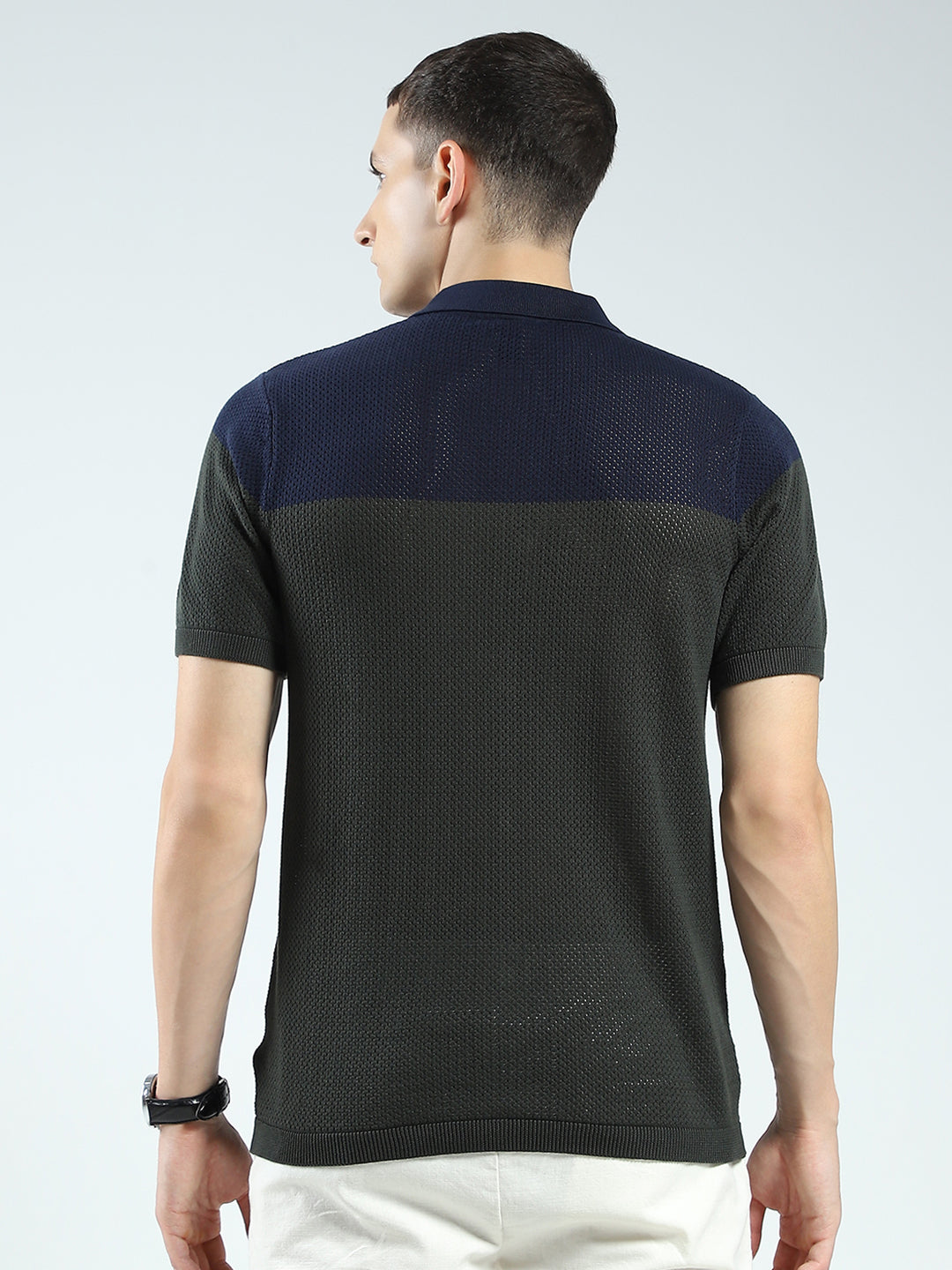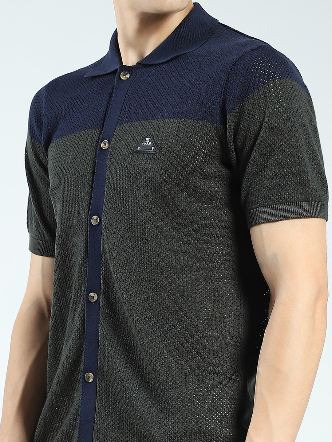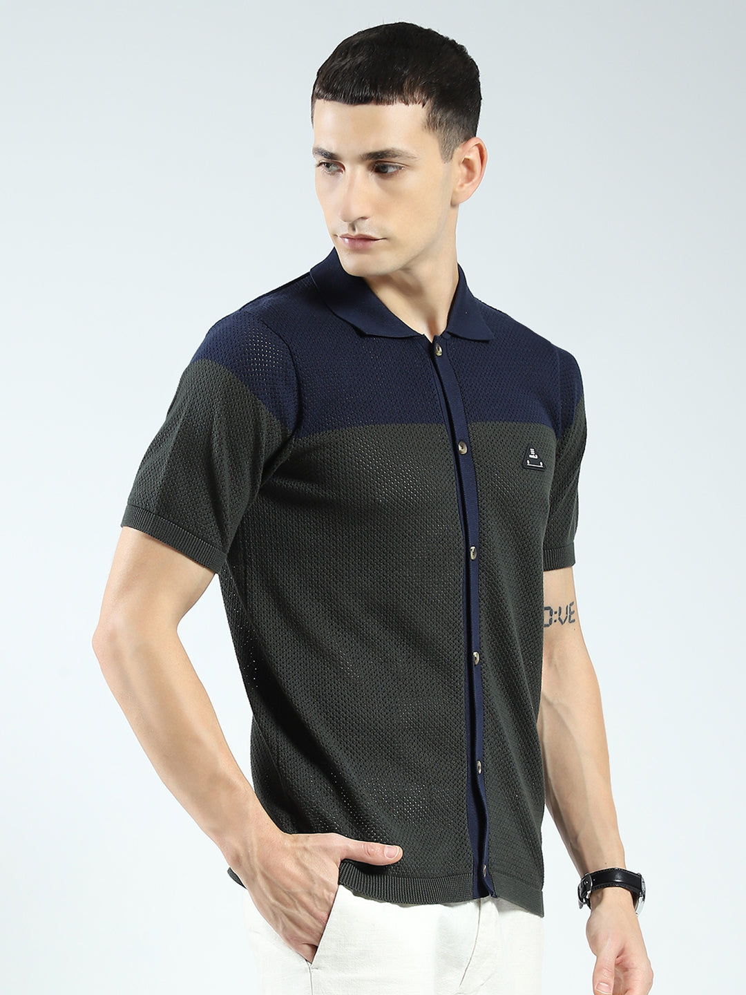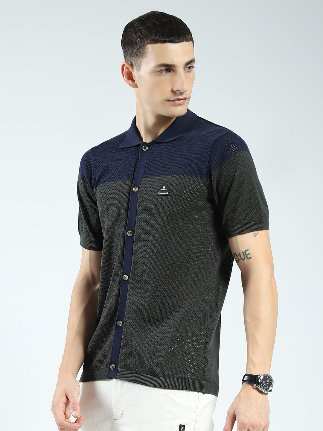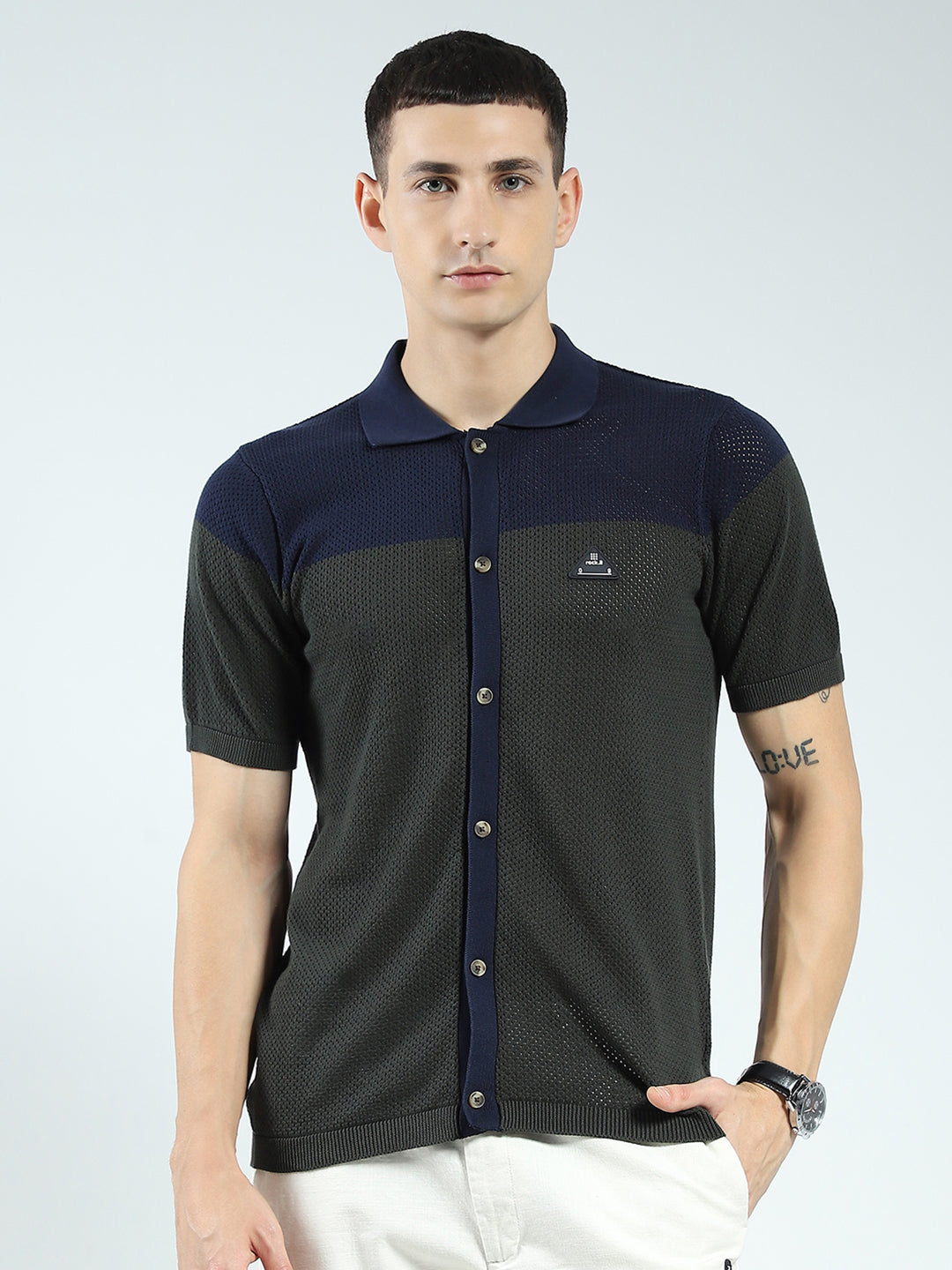 - Men Navy Blue Self Design Collar Half Sleeve Shirt