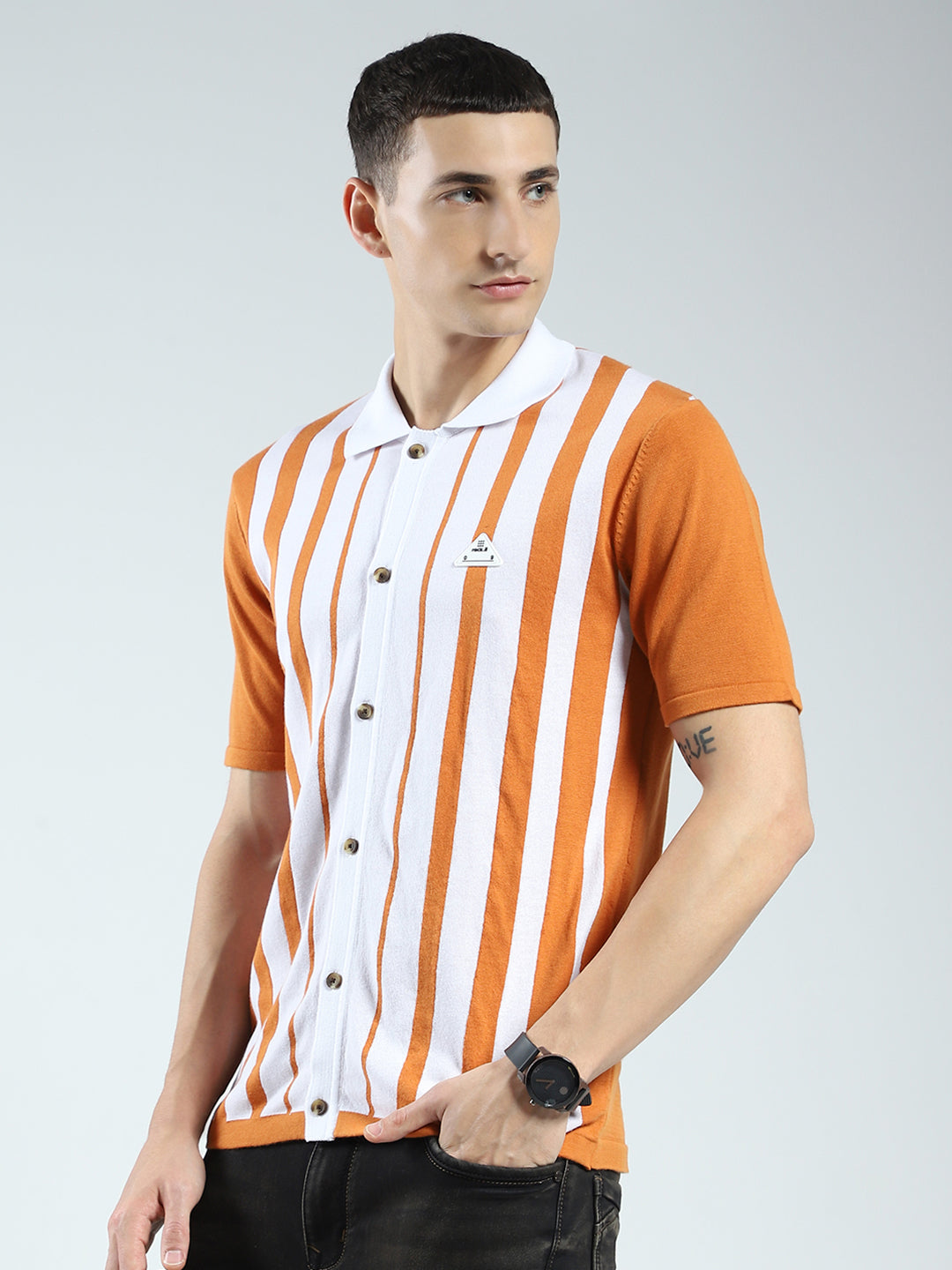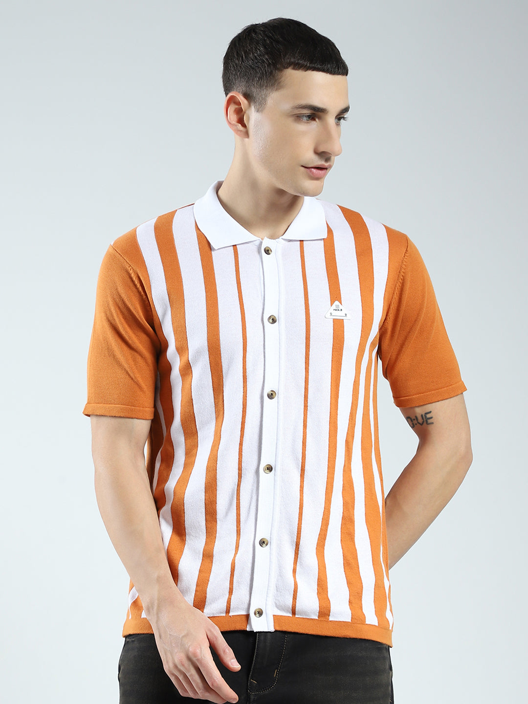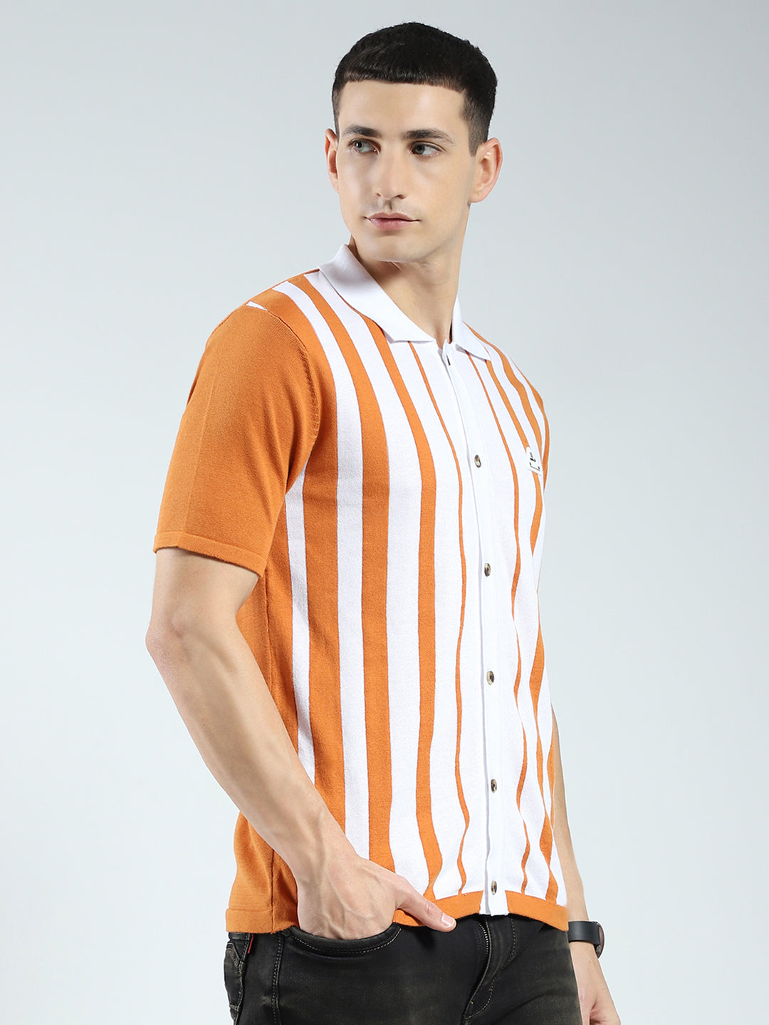- Men Orange Stripe Collar Half Sleeve Shirt