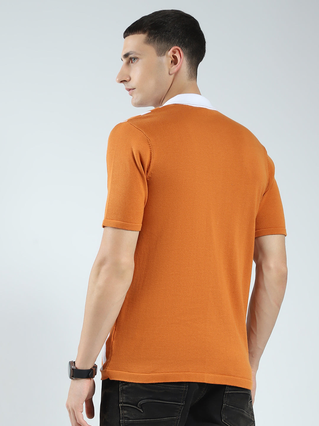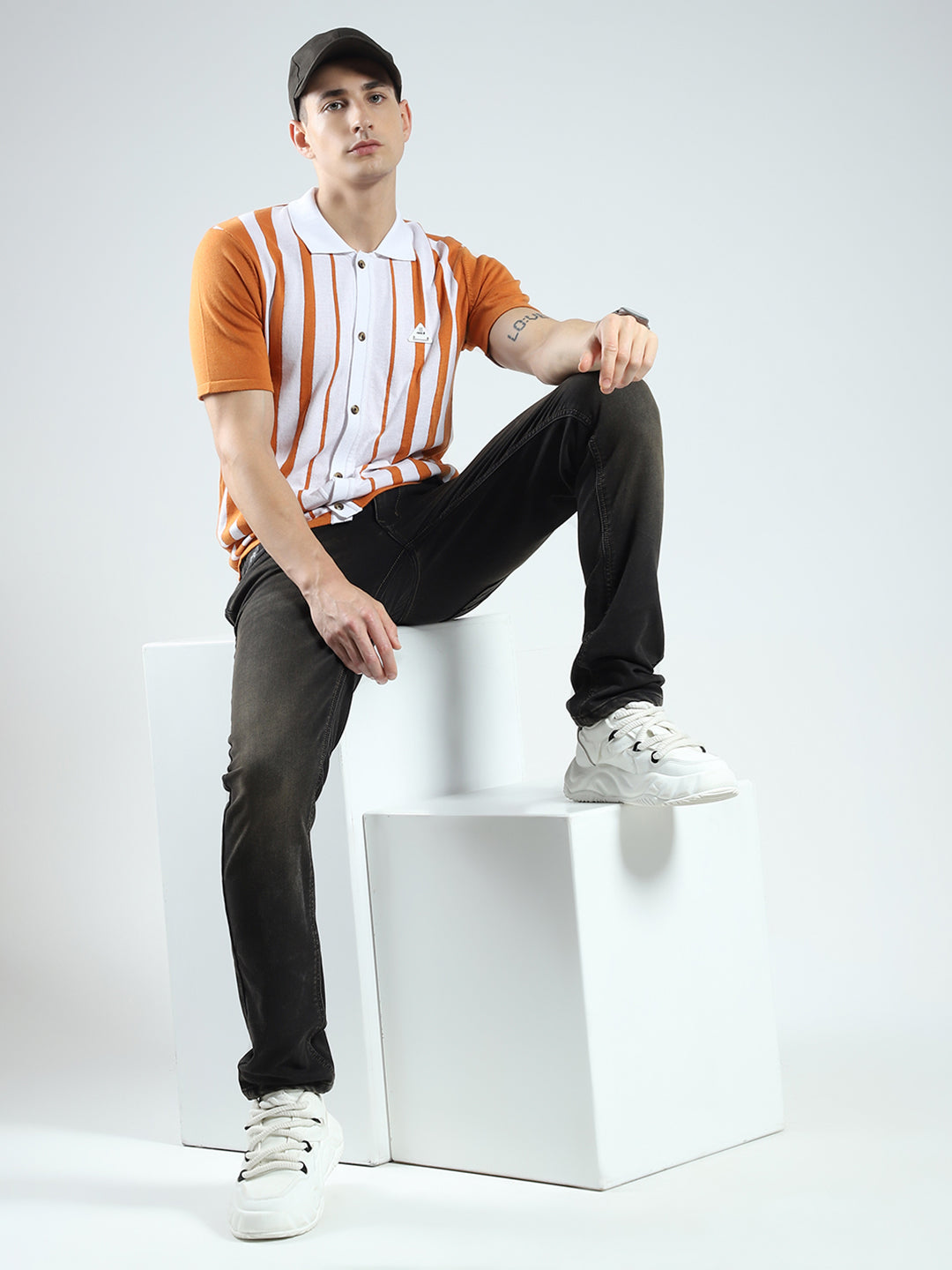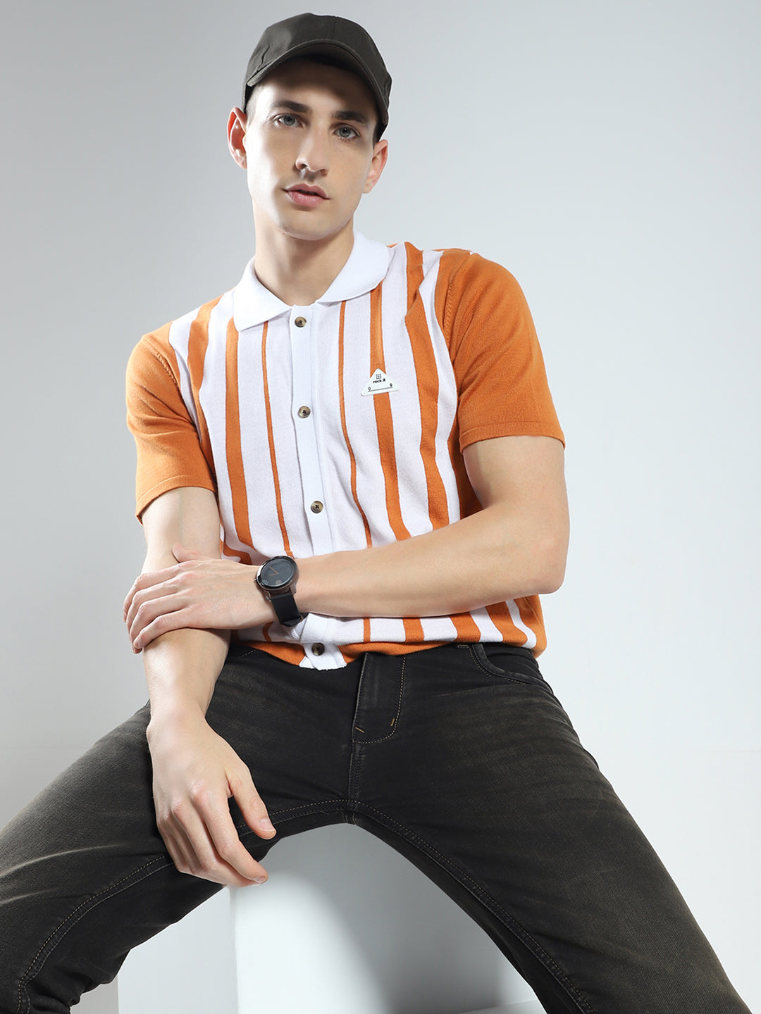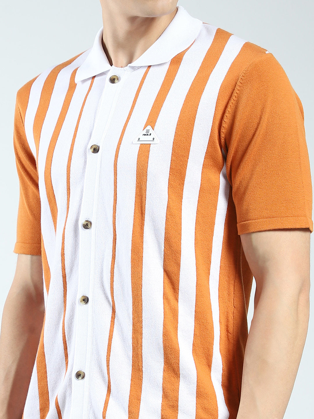 - Men Orange Stripe Collar Half Sleeve Shirt