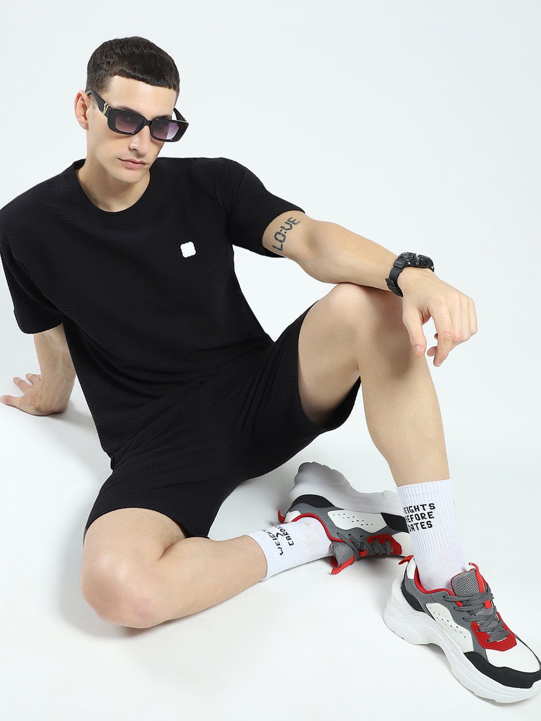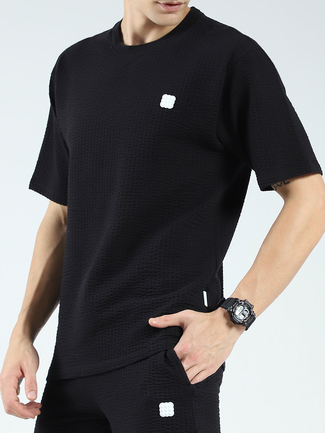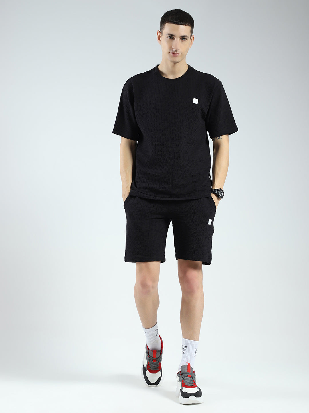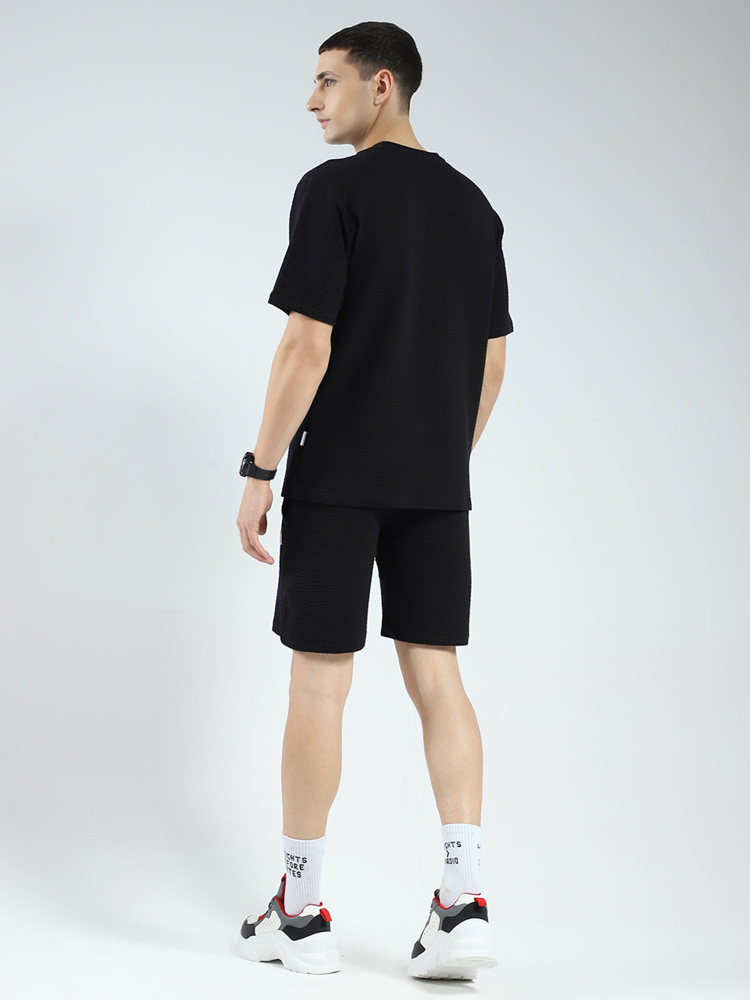 - Men Black Self Design V Neck Half Sleeve Shorts Set