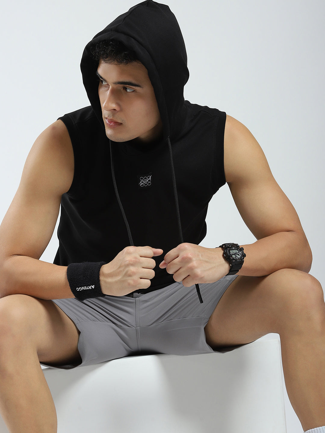 - Men Black Solid Hooded Sleeveless T-Shirt