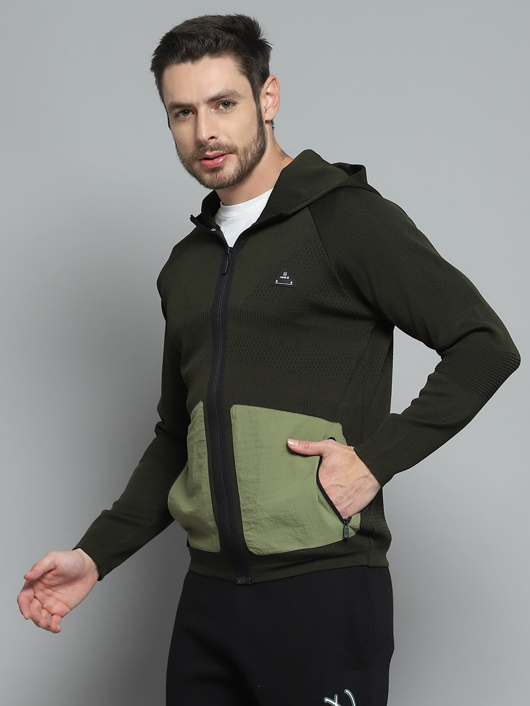 - Men Olive Self Design Hooded Full Sleeve Pullover