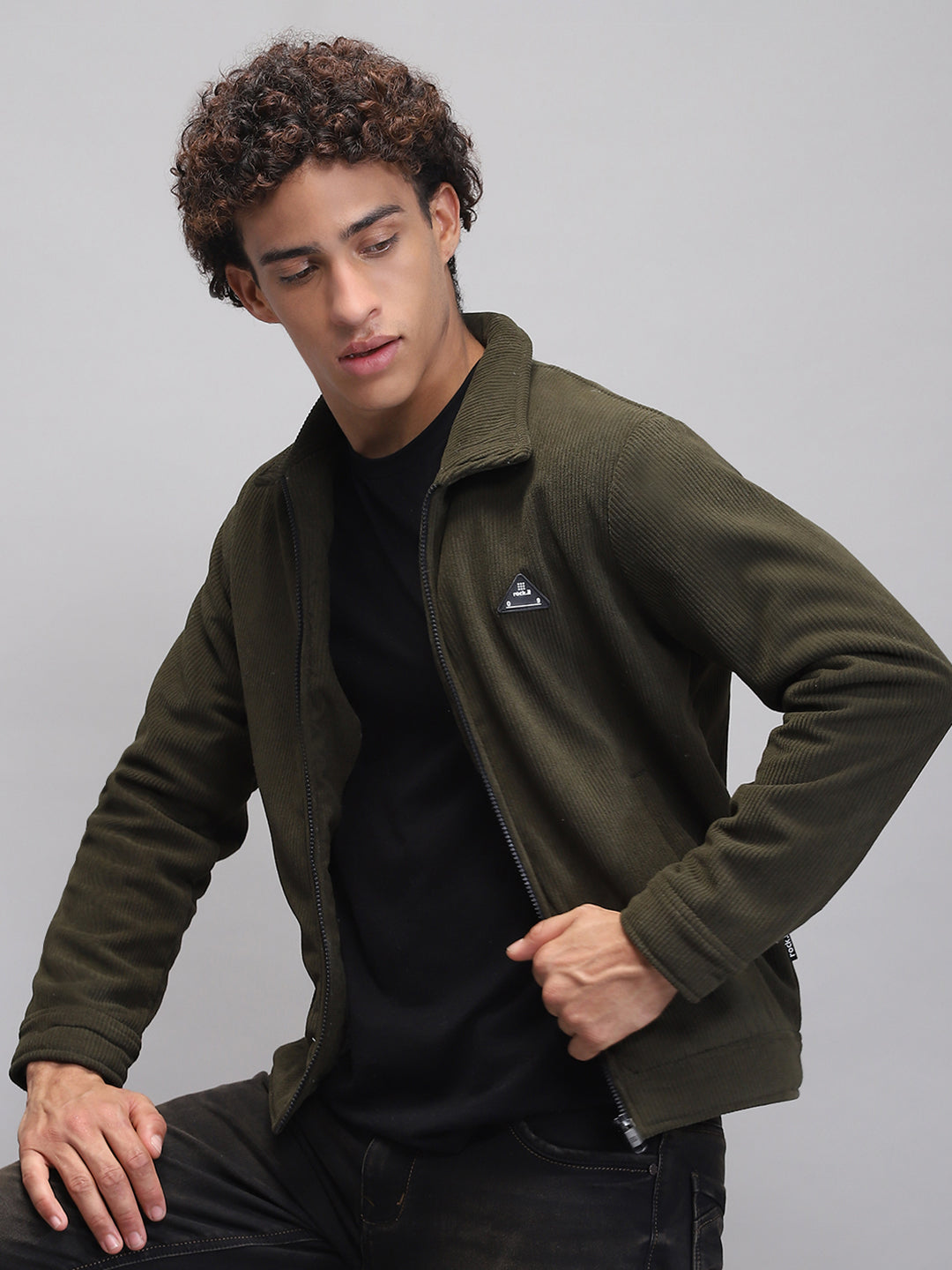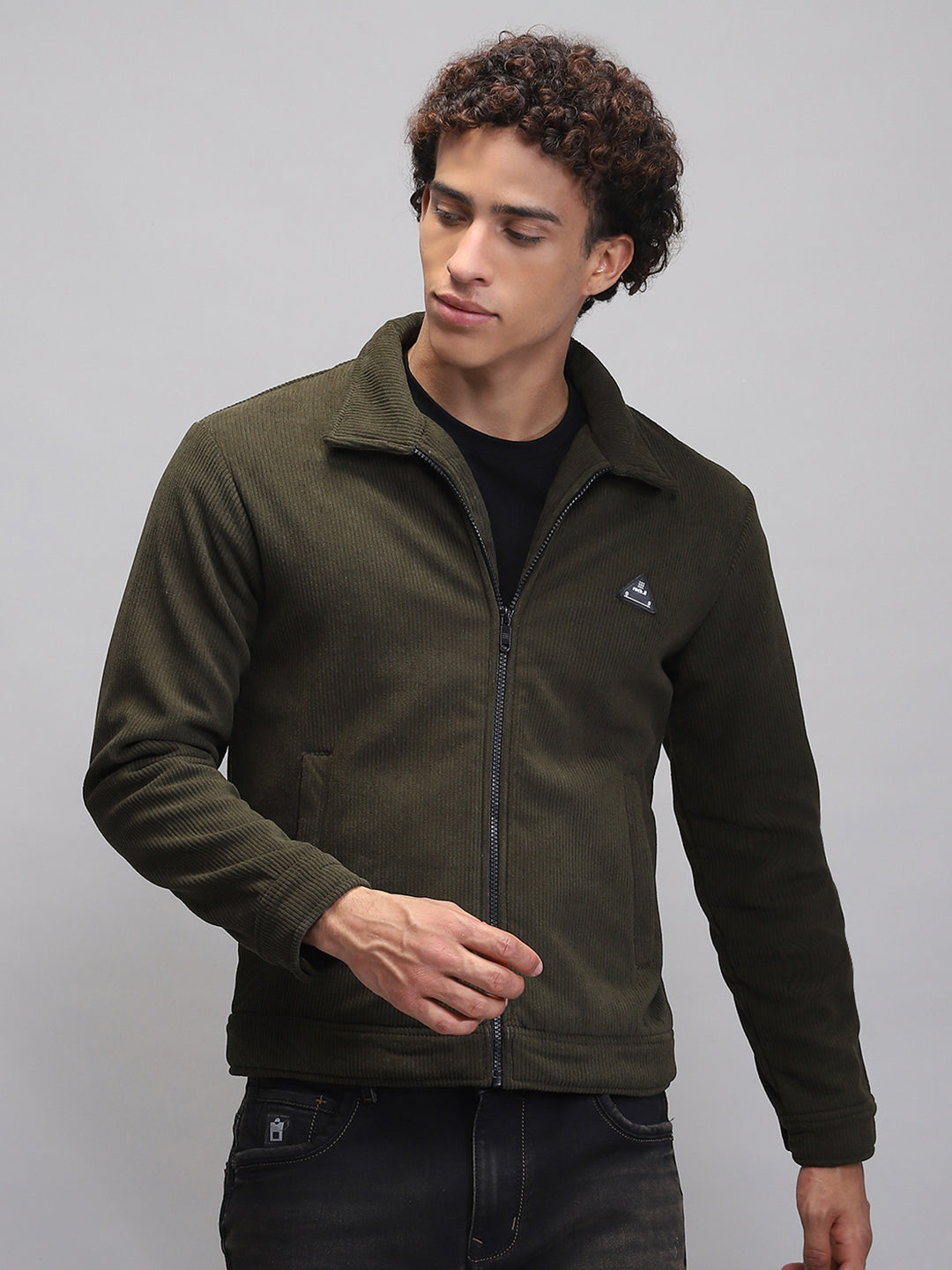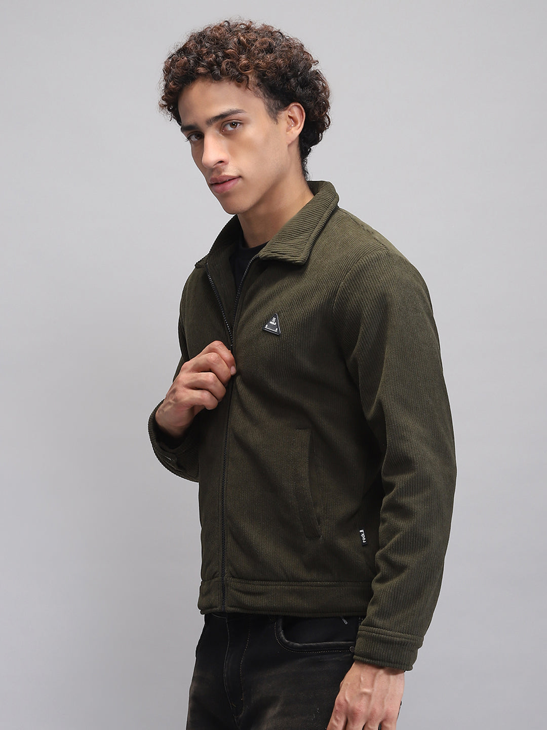 - Men Olive Solid Collar Full Sleeve Knitted Jacket