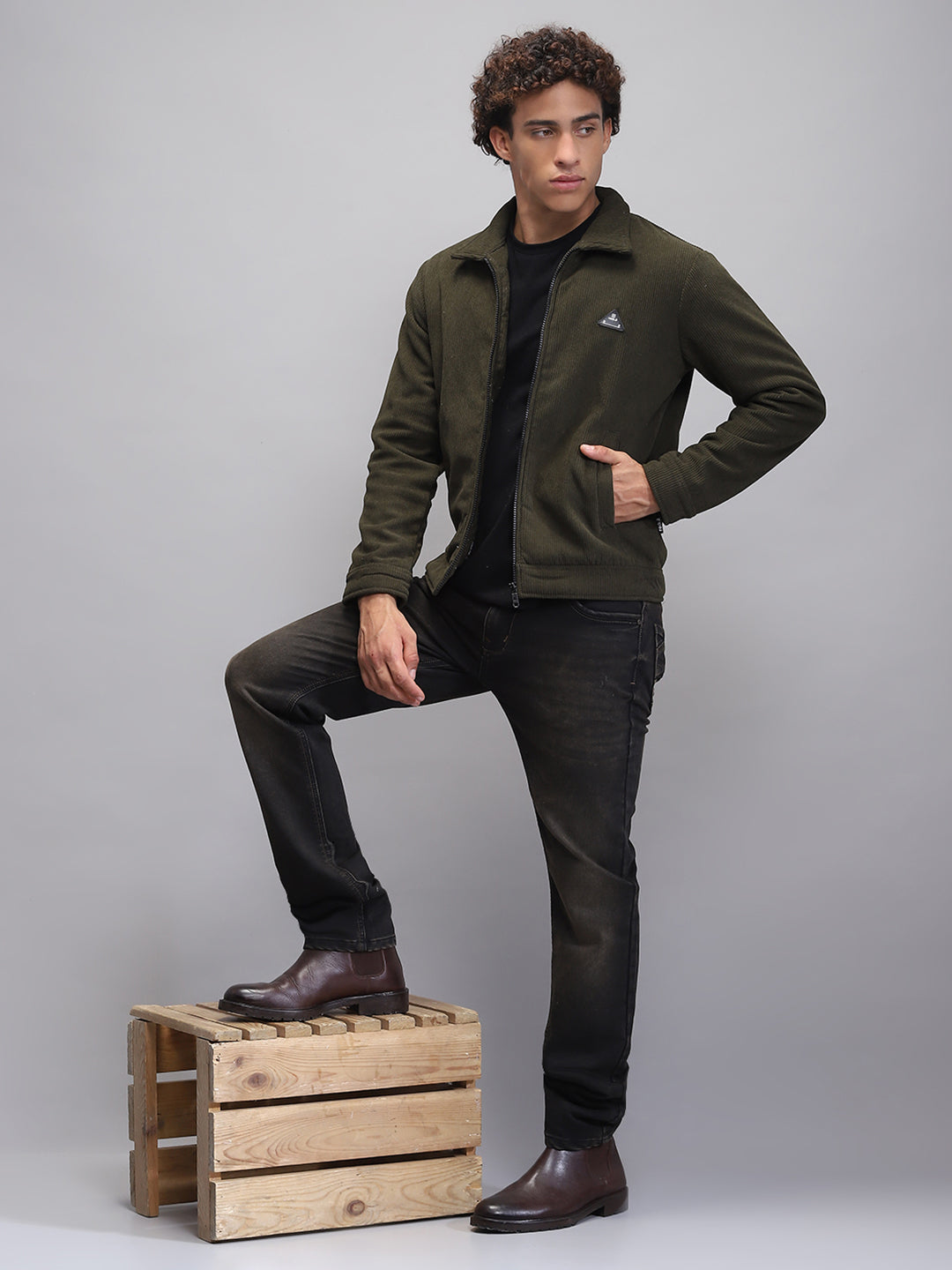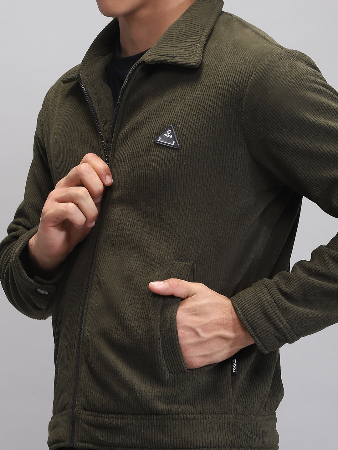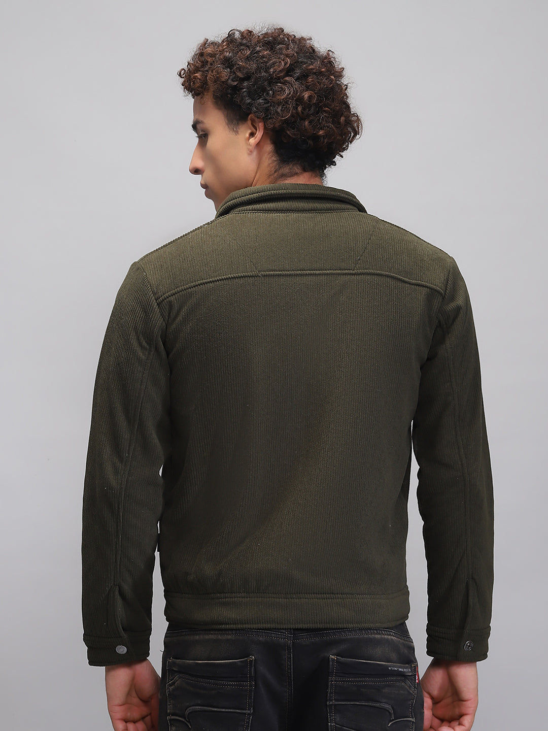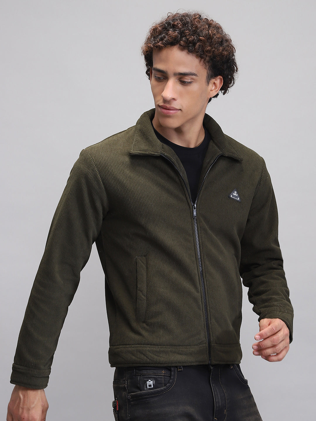 - Men Olive Solid Collar Full Sleeve Knitted Jacket
