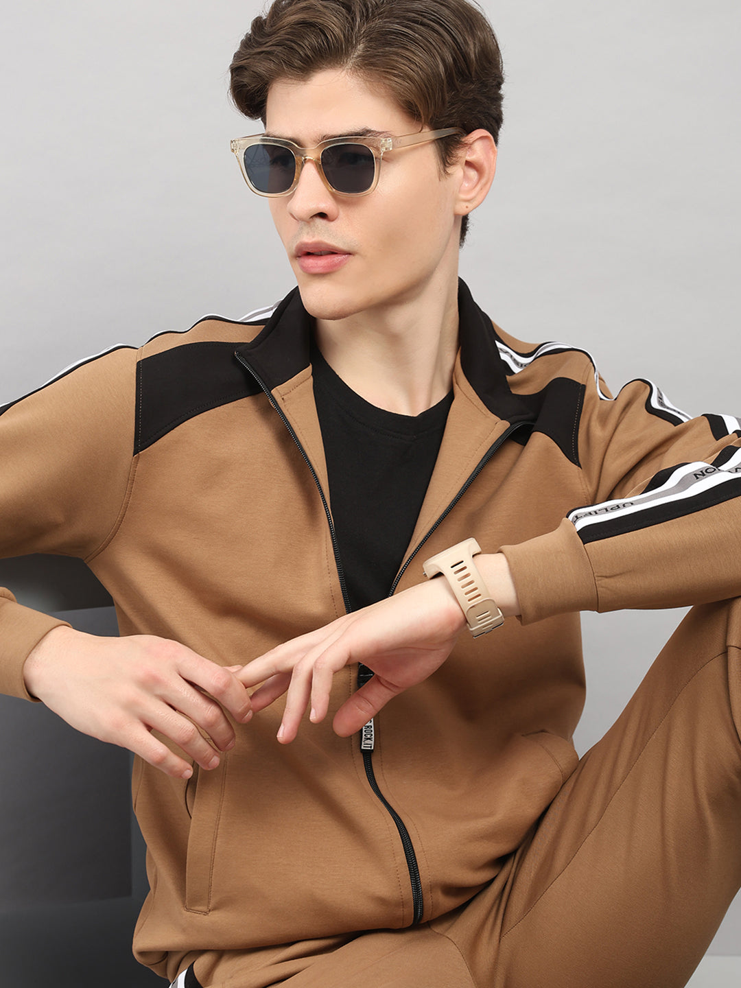 - Men Camel Brown Solid Round Neck Sleeveless Winter Tracksuit
