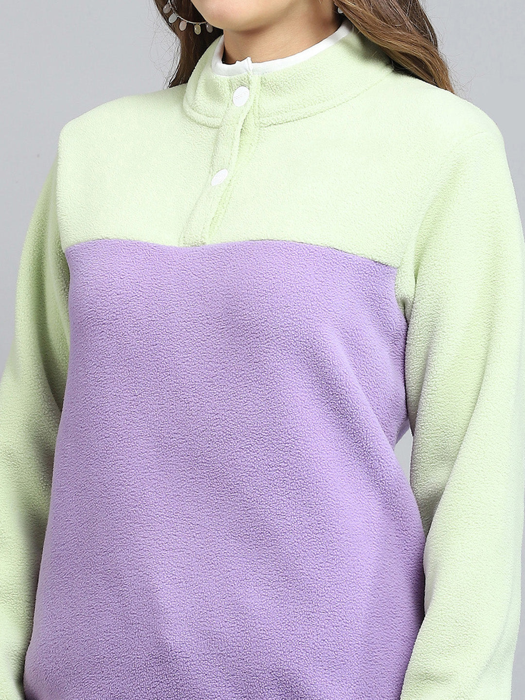 - Women Purple & Green Self Design Mock Neck Full Sleeve Sweatshirt