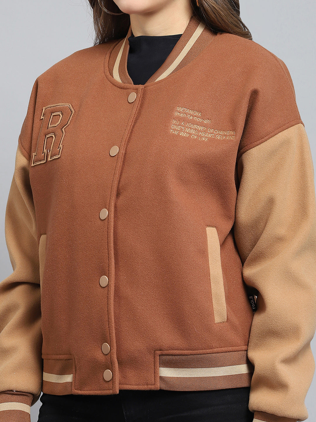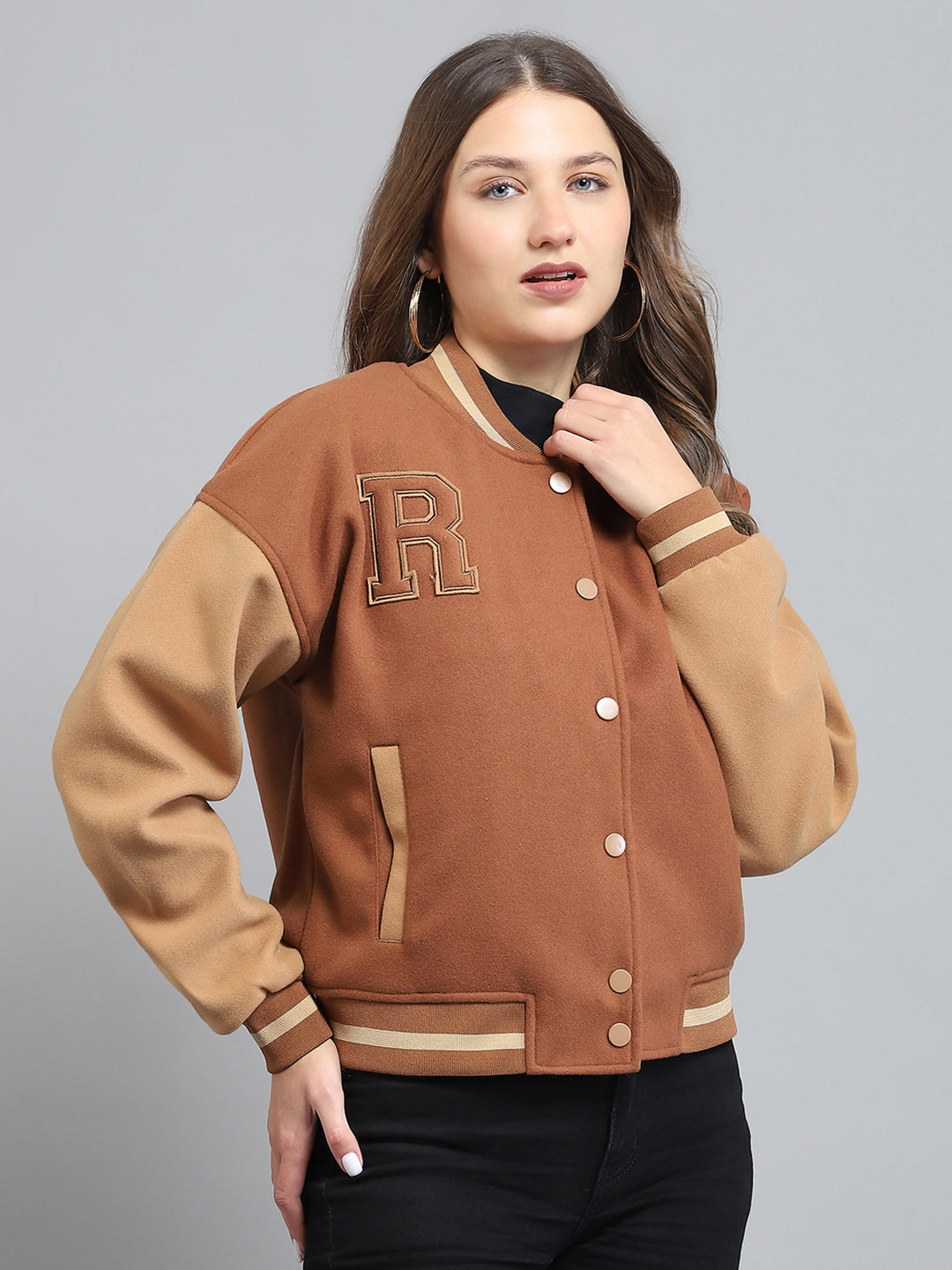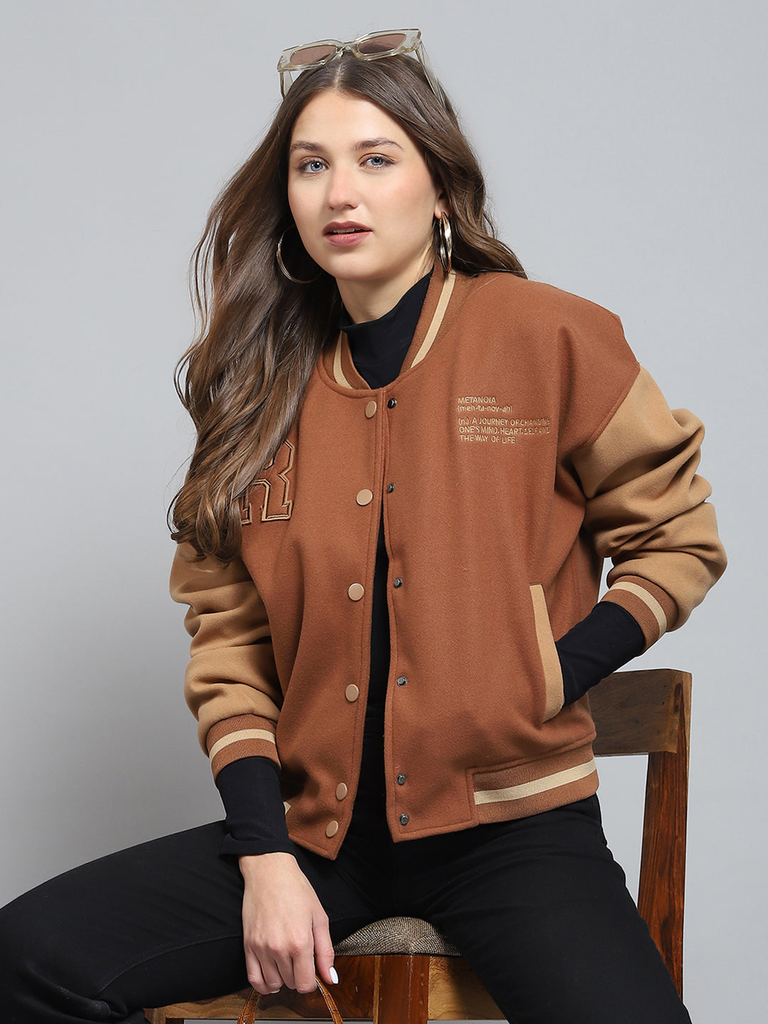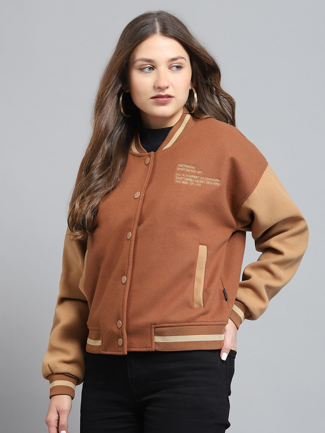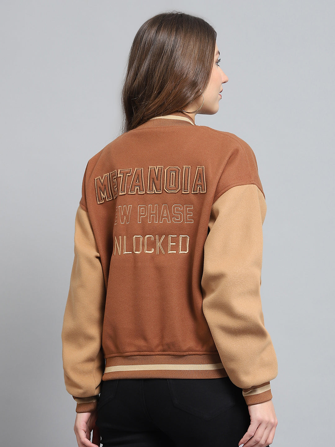 - Women Brown Printed Band Collar Full Sleeve Jacket