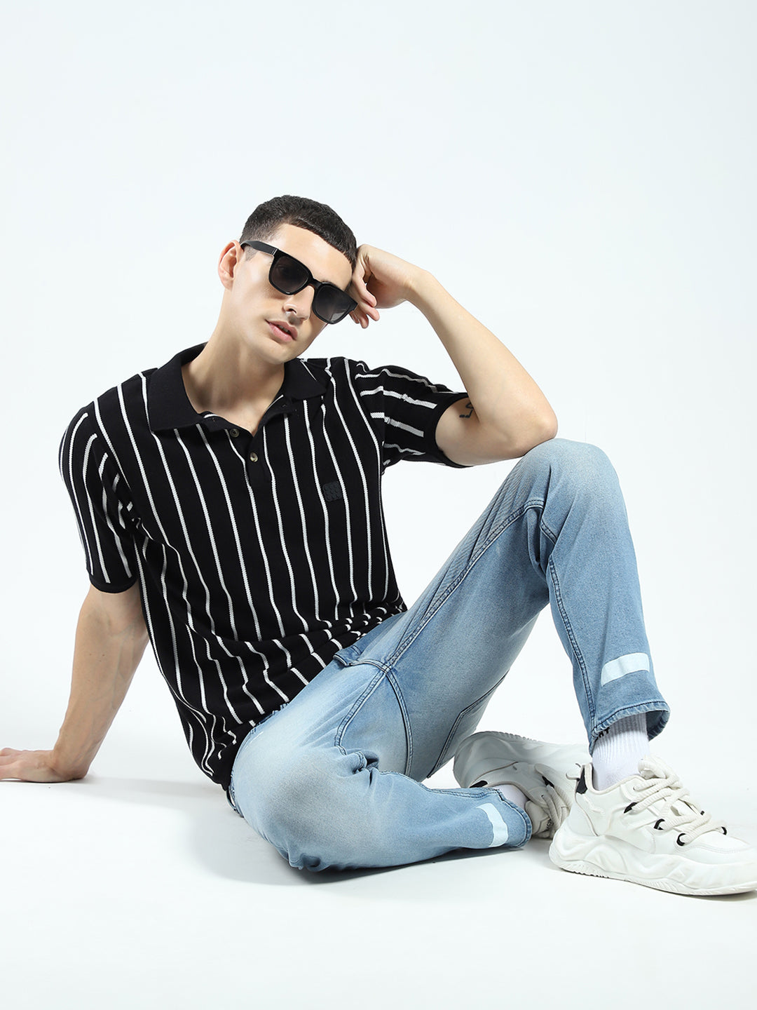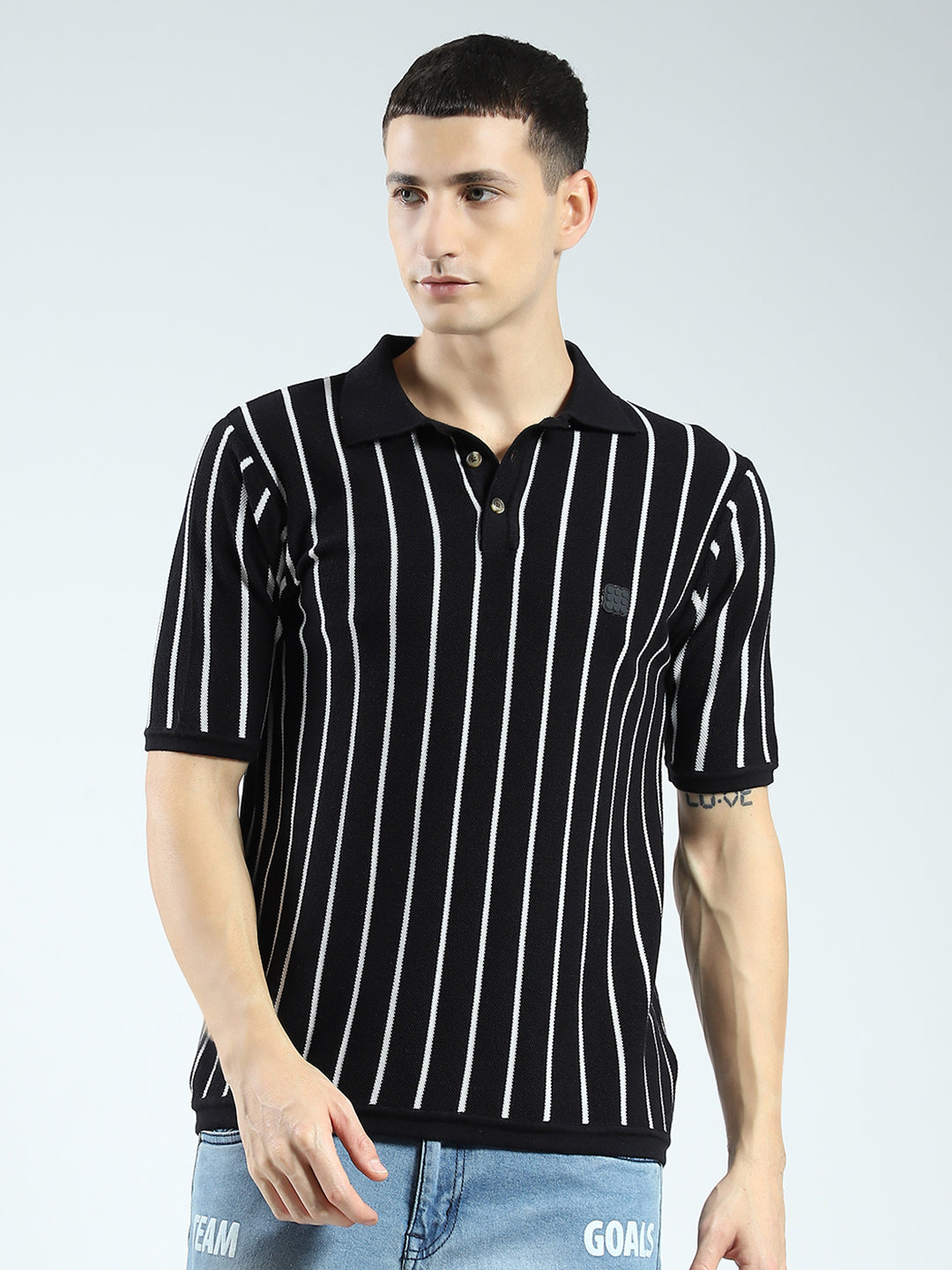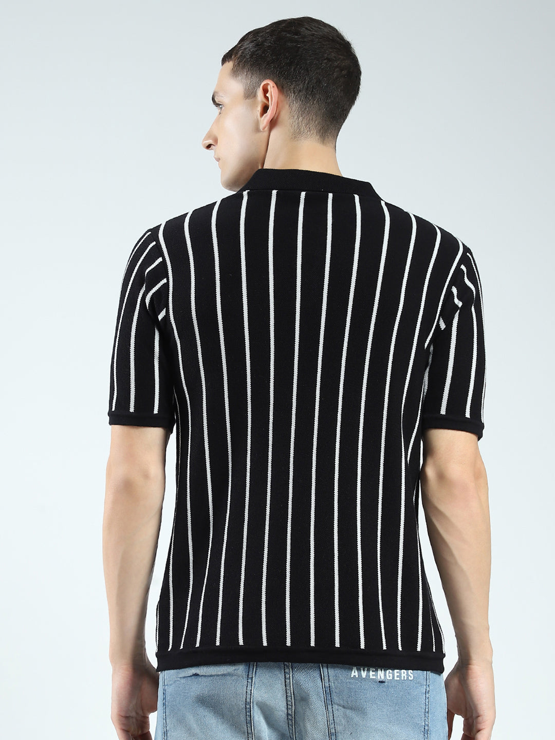 Men Black Stripe Collar Half Sleeve T-Shirt