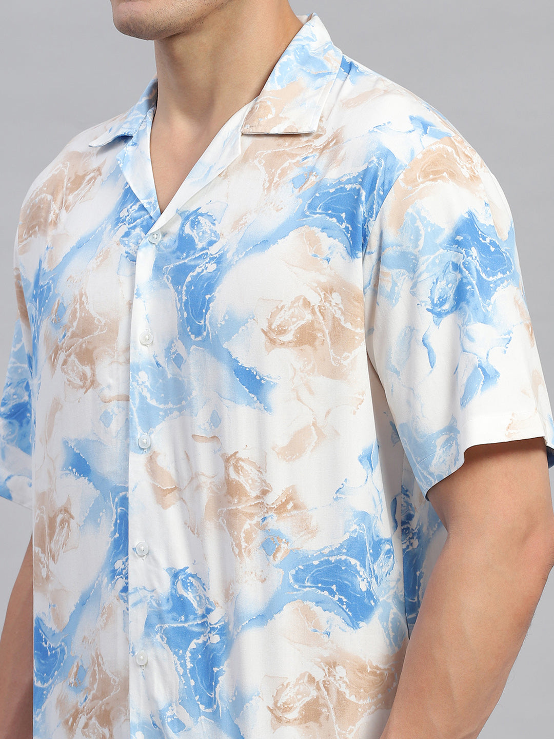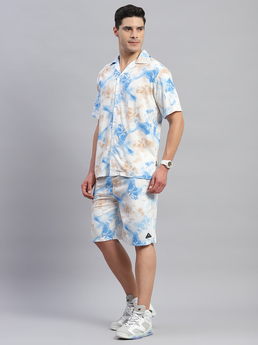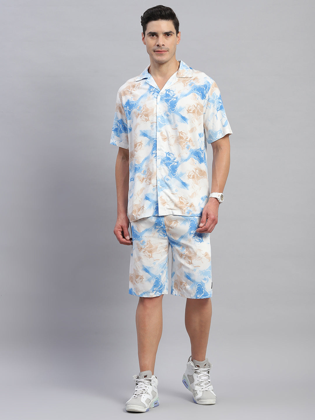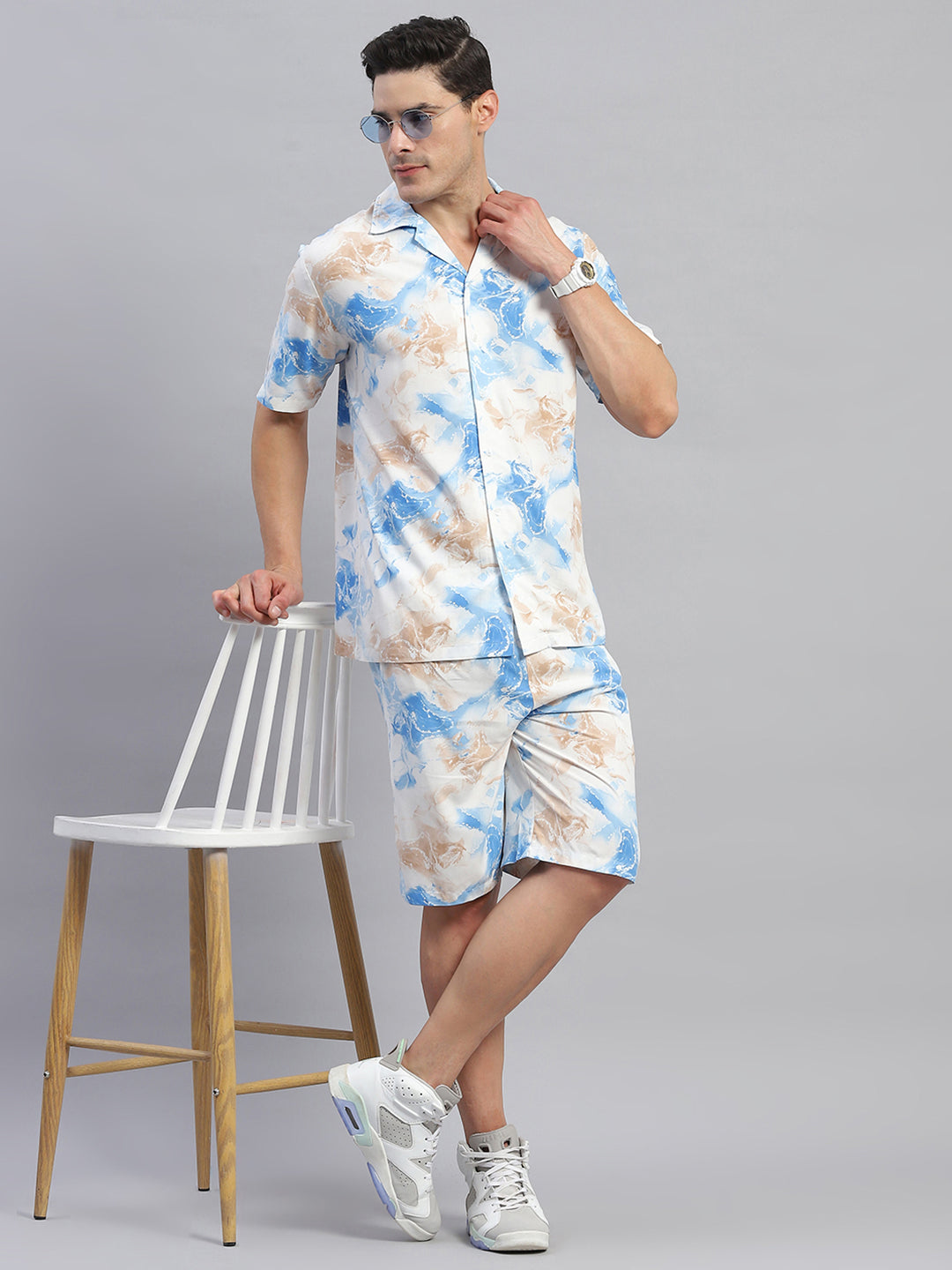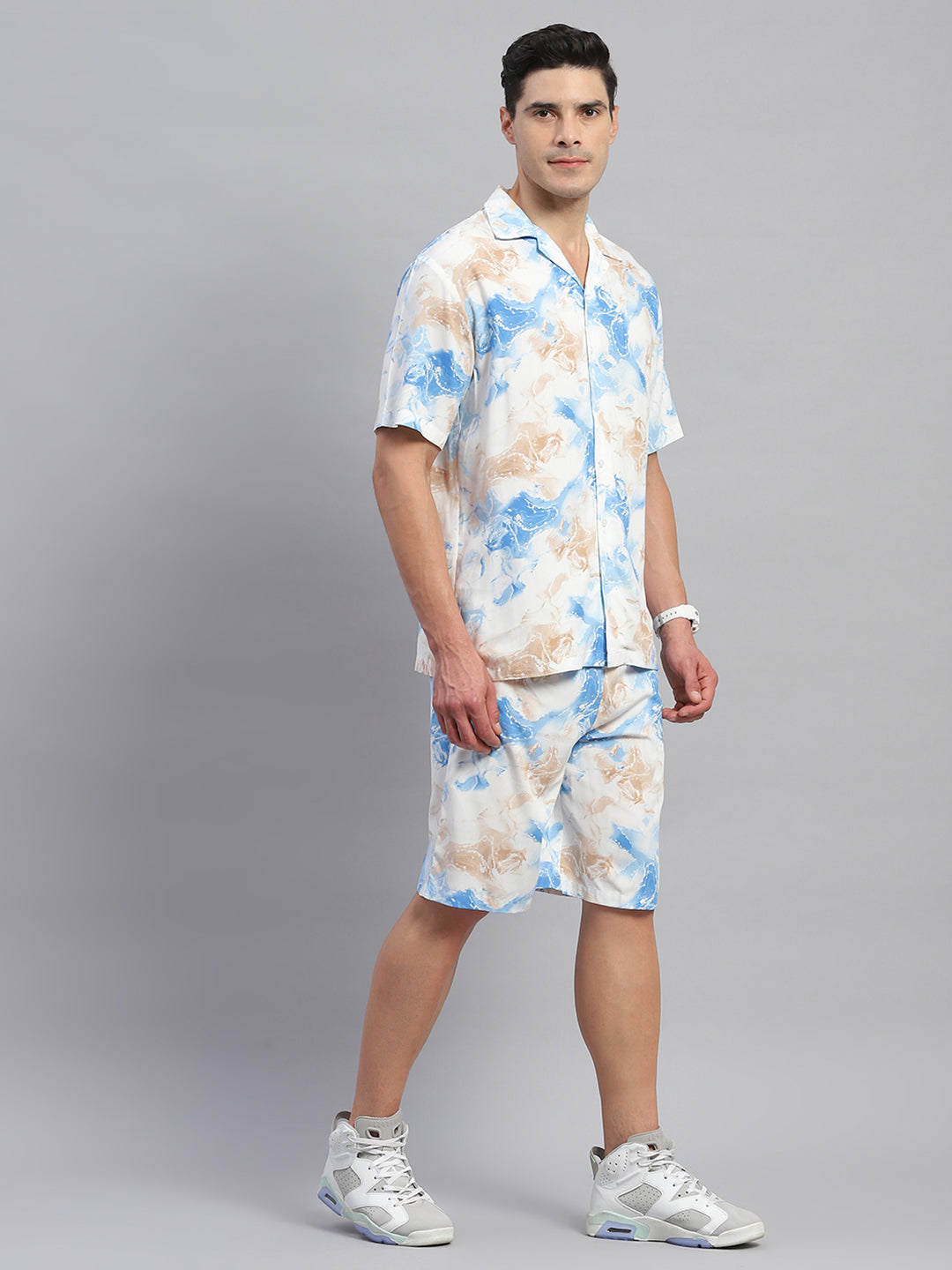 Men Blue Printed Round Neck Half Sleeve Cords Set