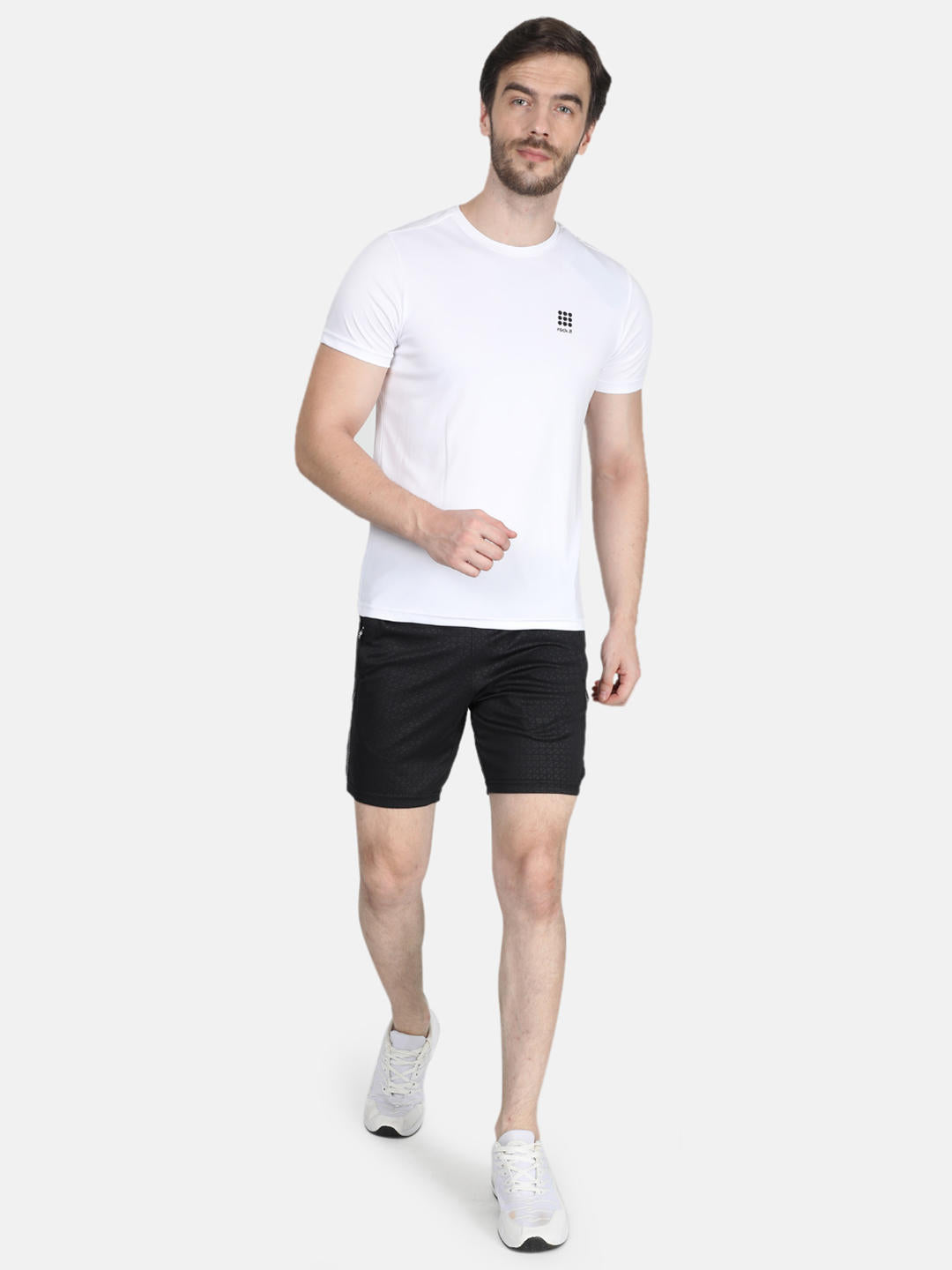 Men White Self Design V Neck Half Sleeve Shorts Set