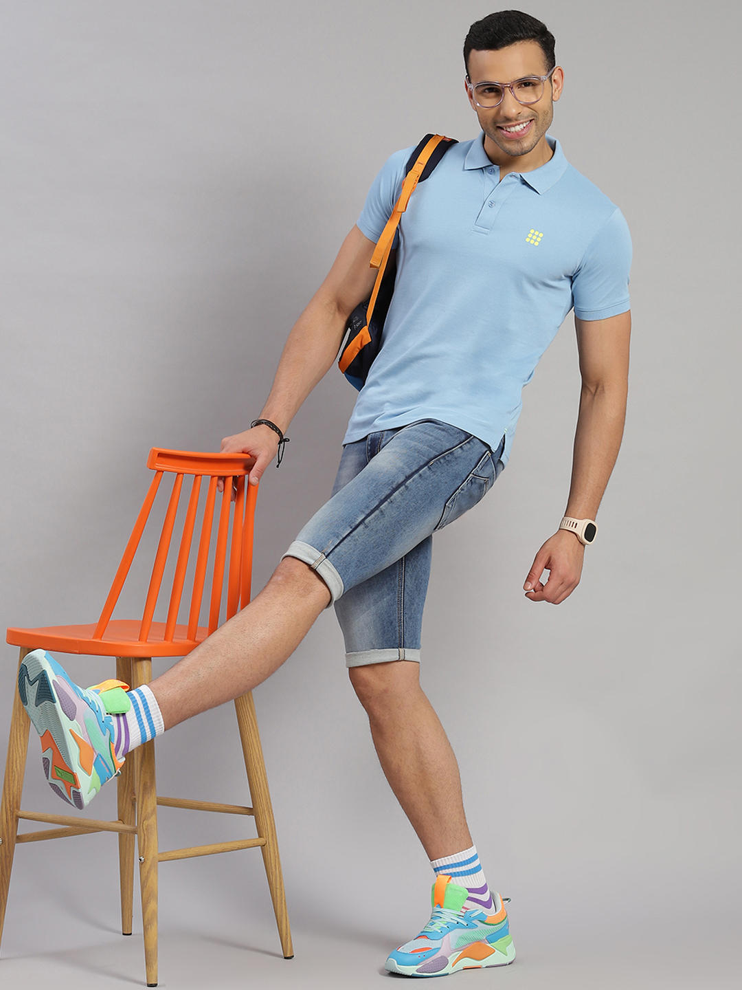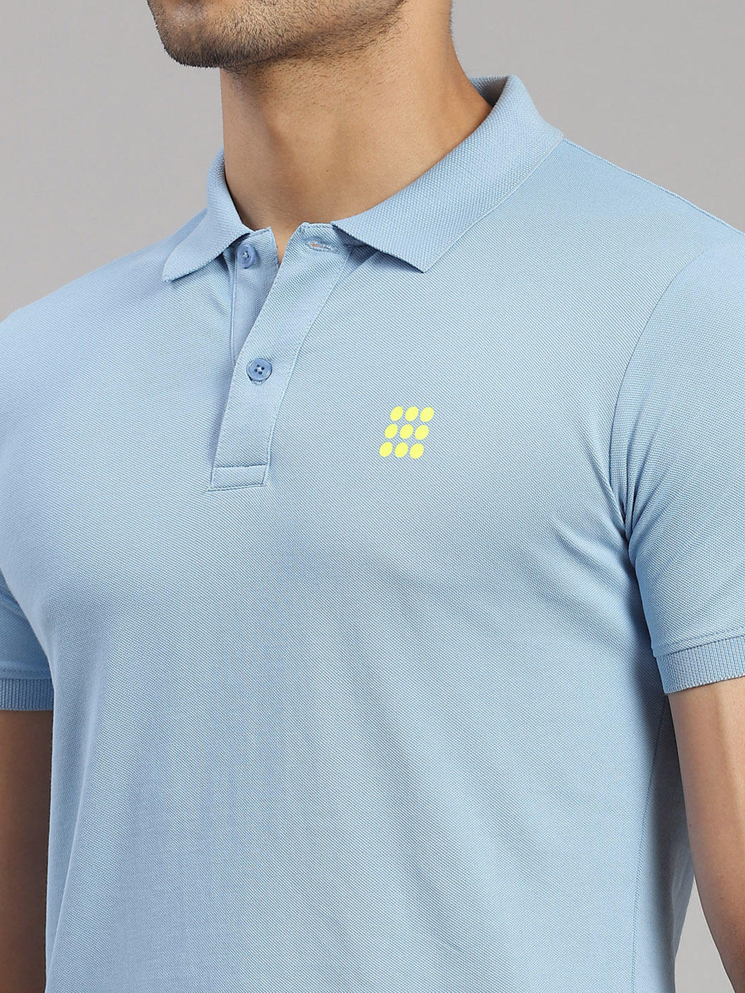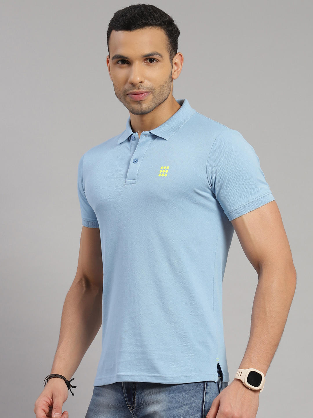 Men Cotton Blend Sky Blue Solid Collar T-Shirt