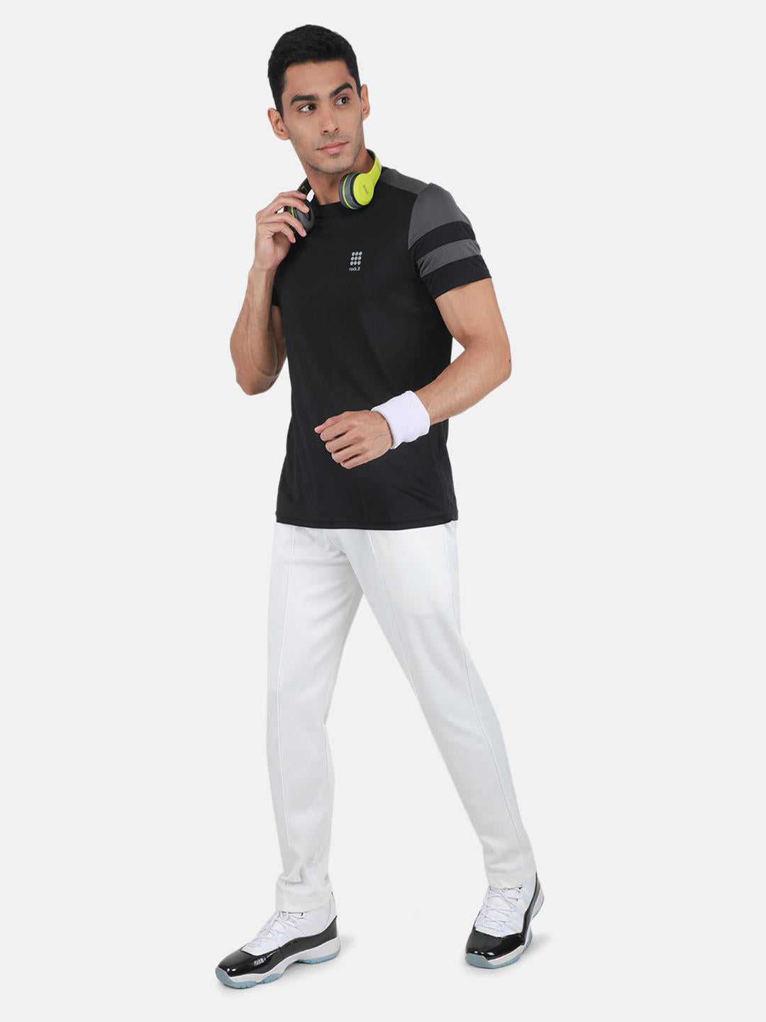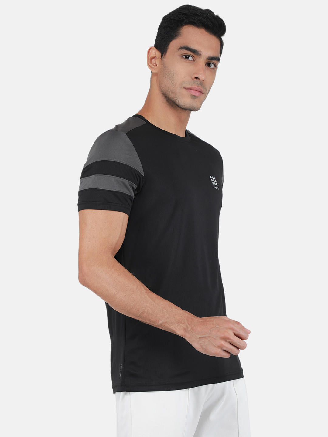 Mens Polyester Blend Black Self Design Round Neck T-Shirt