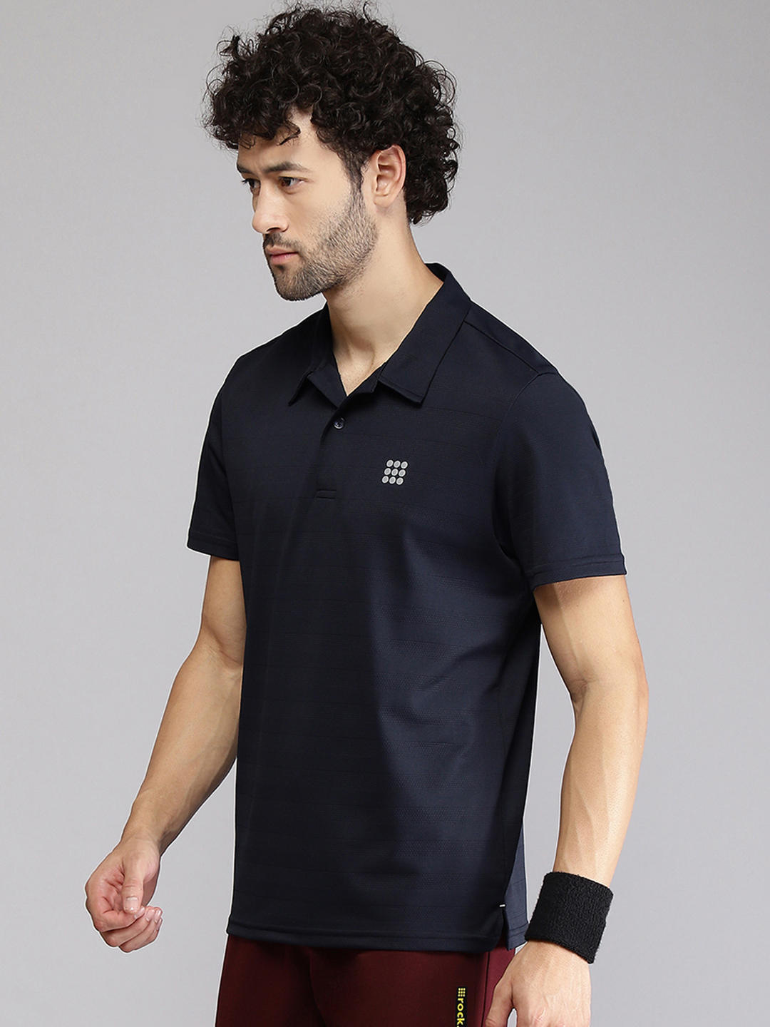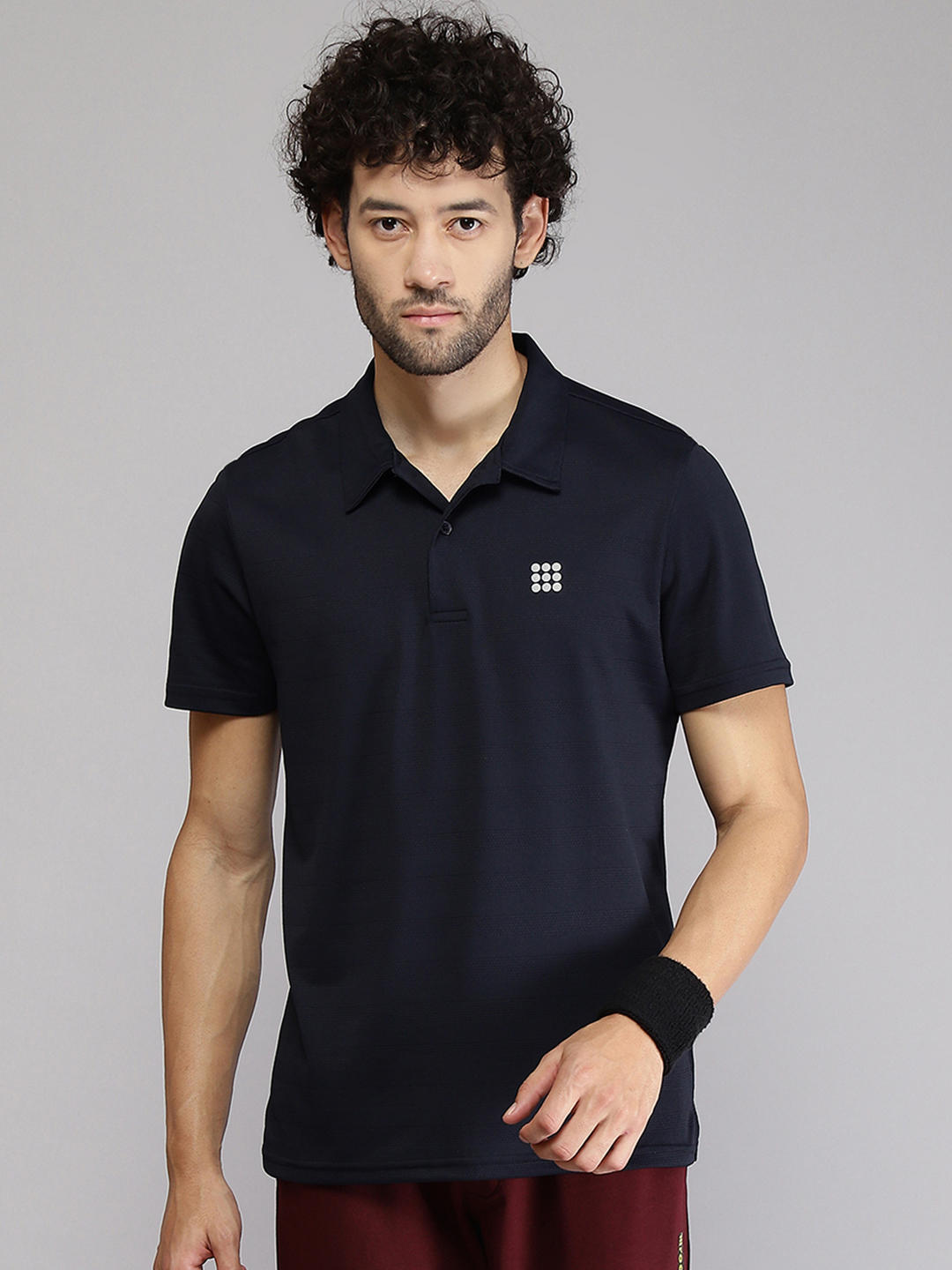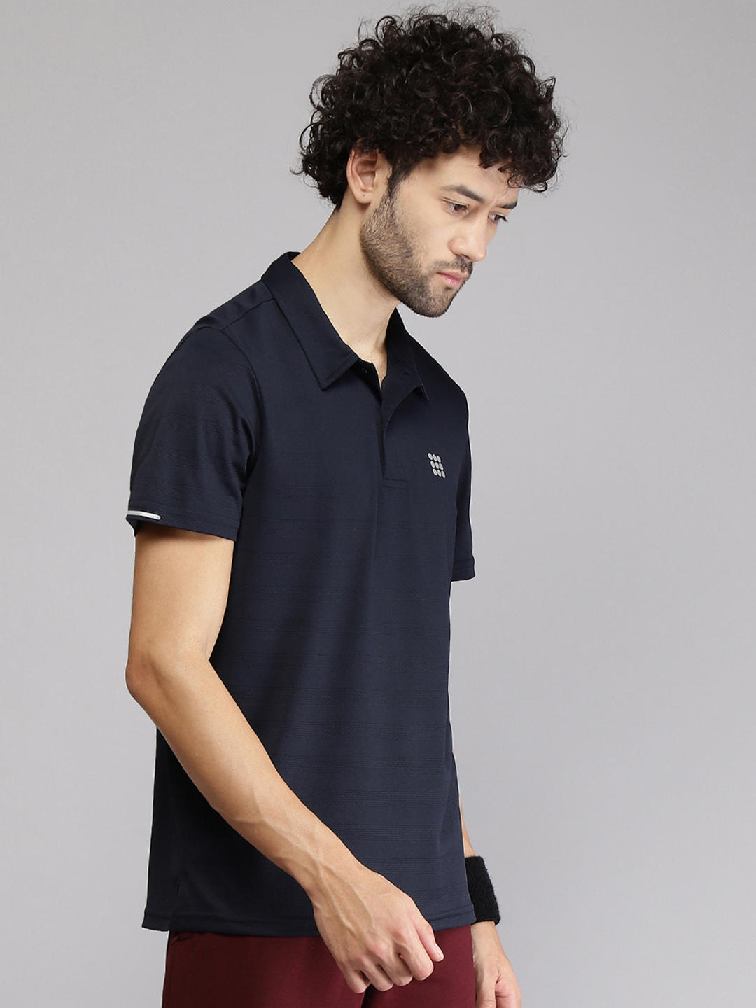 Mens Polyester Blend Navy Blue Self Design Collar T-Shirt