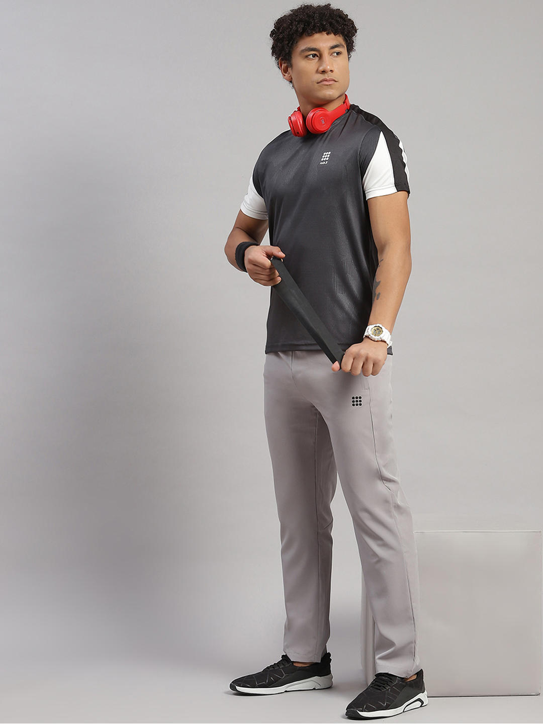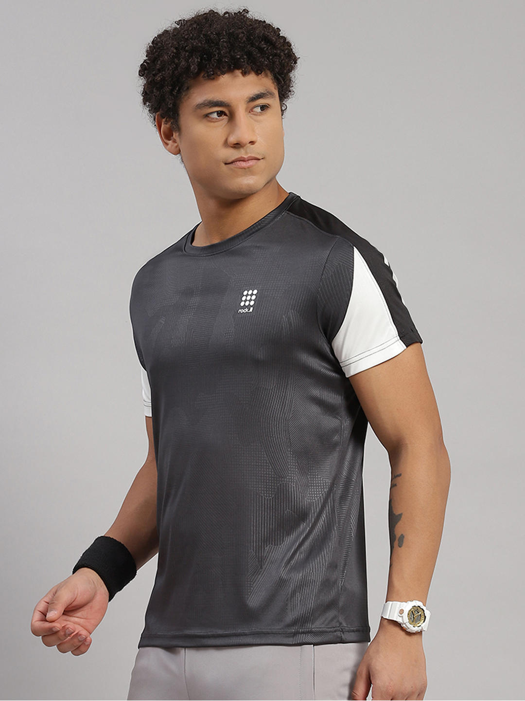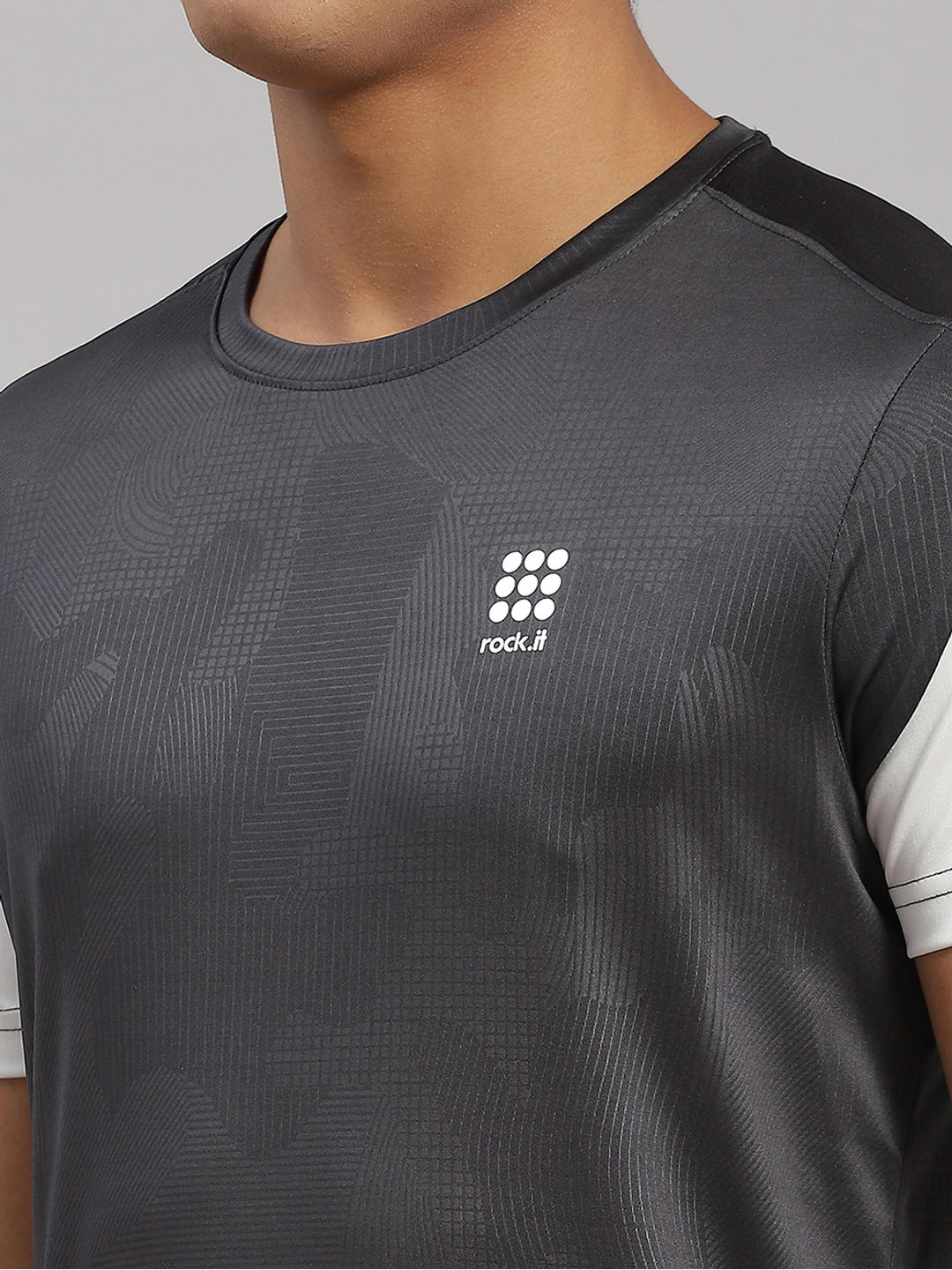 Men Polyester Blend Grey Self Design T-Shirt