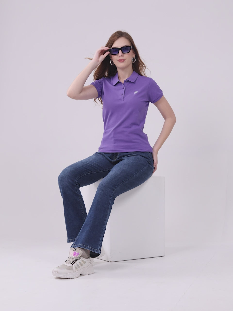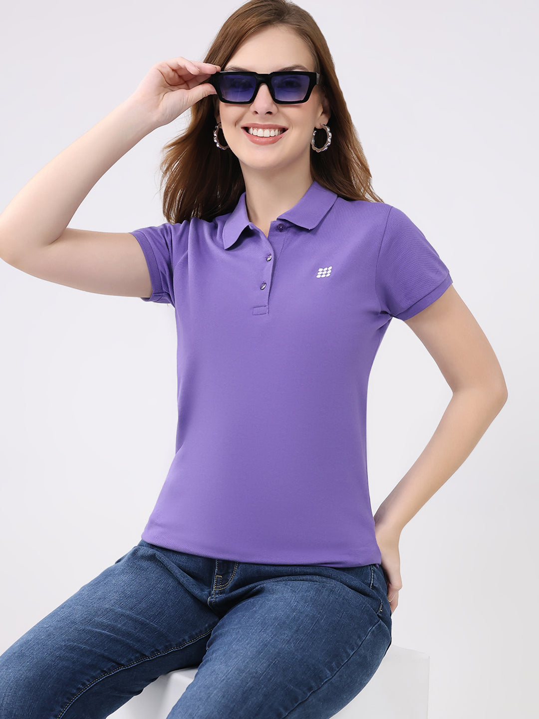 Women Purple Solid Collar Half Sleeve T-Shirt