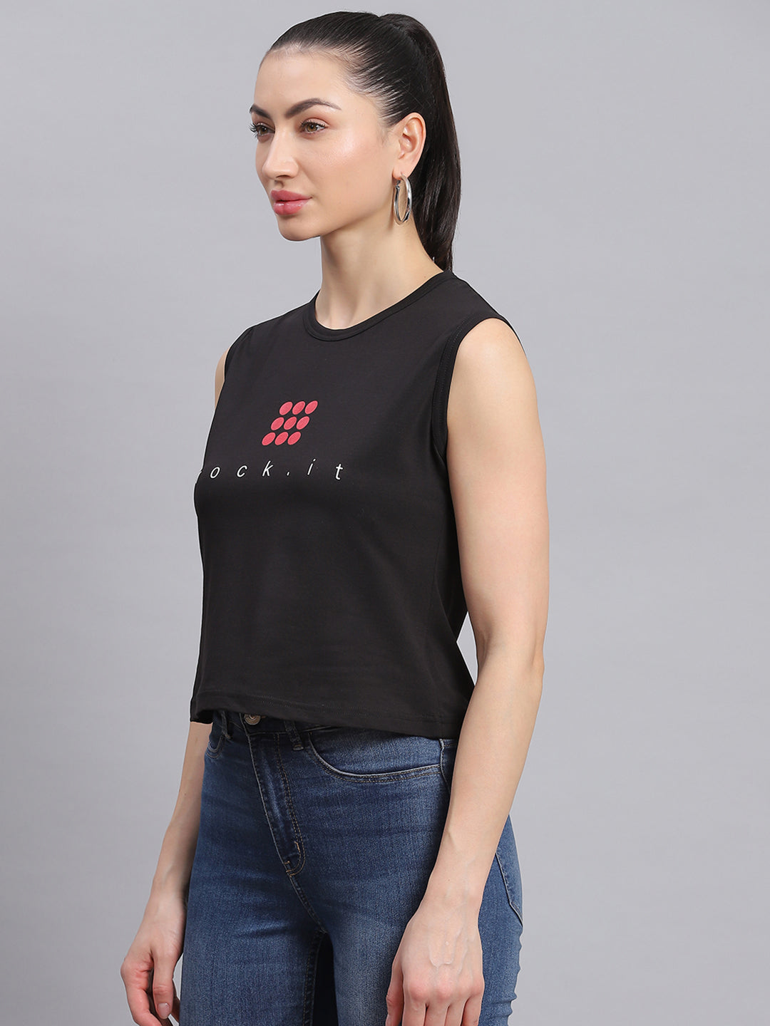 Women Black Printed Round Neck Sleeveless Top