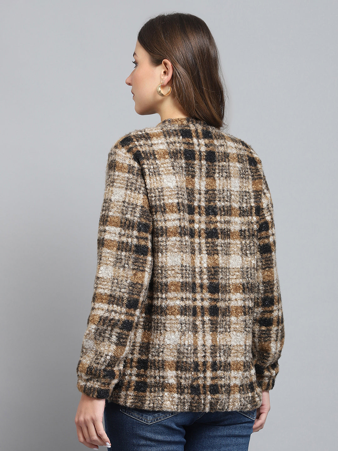 Women Brown Self Design Round Neck Full Sleeve Sweatshirt