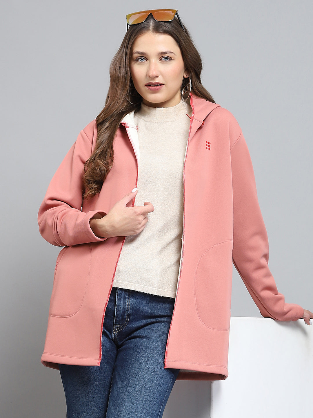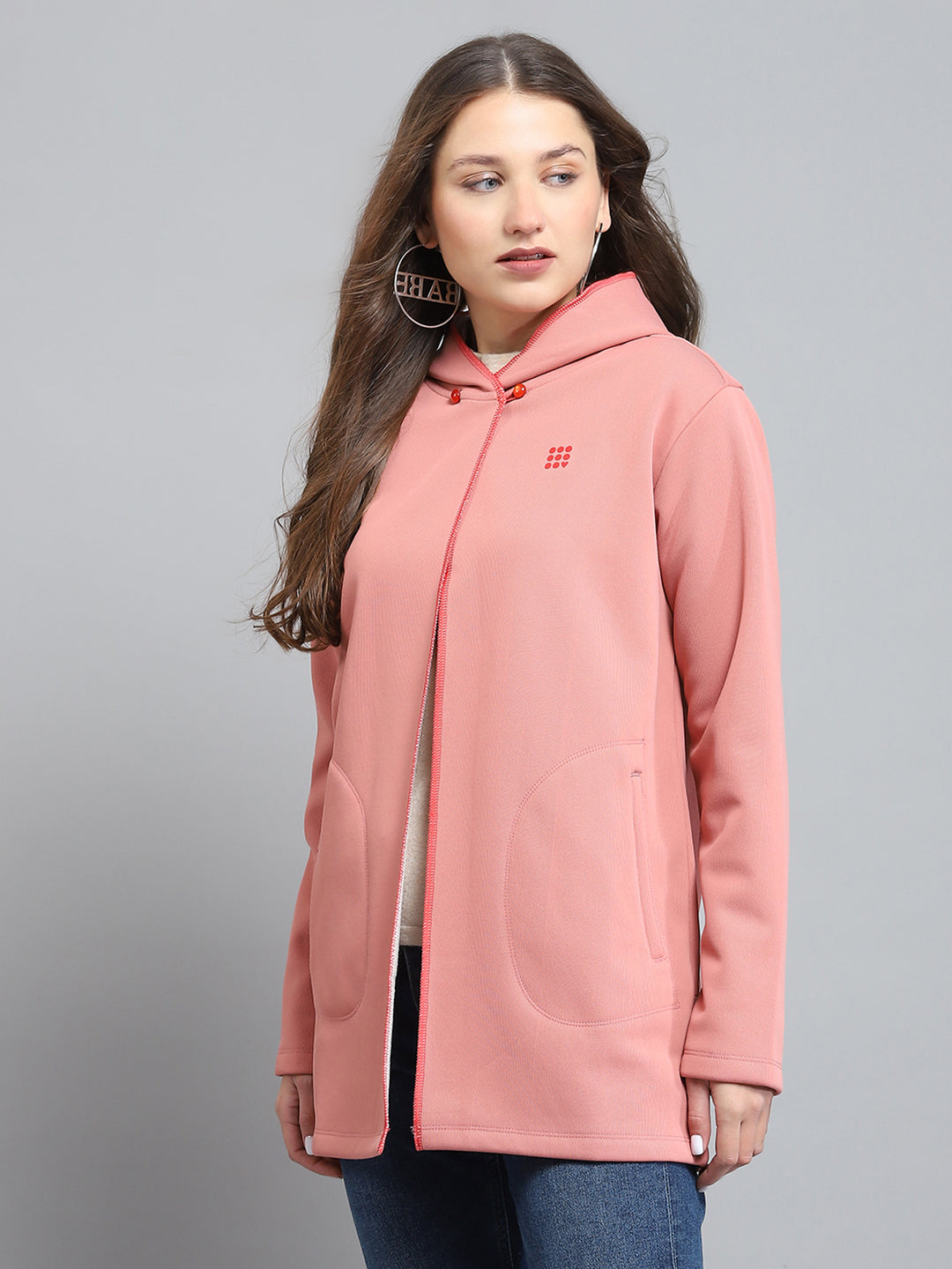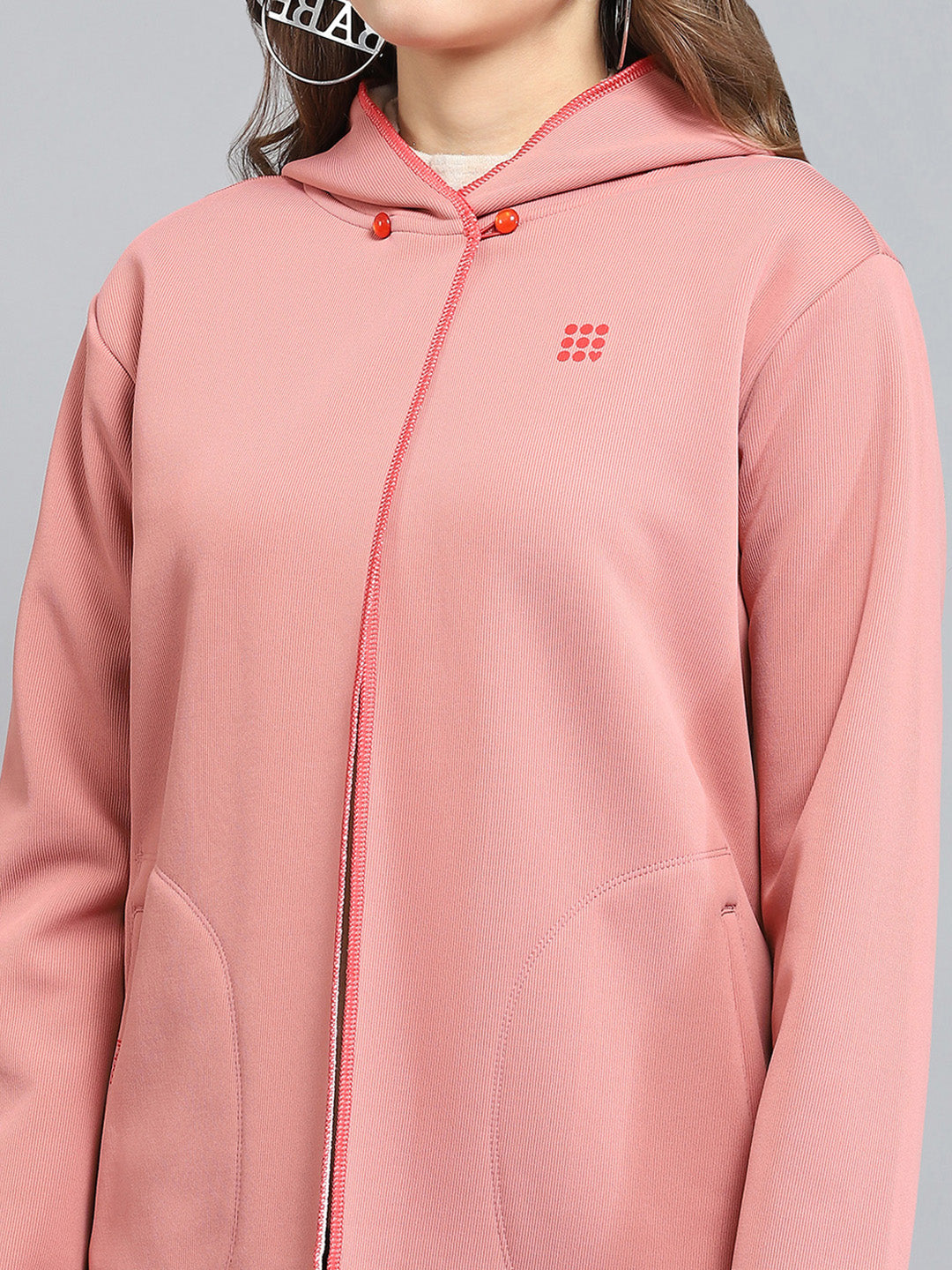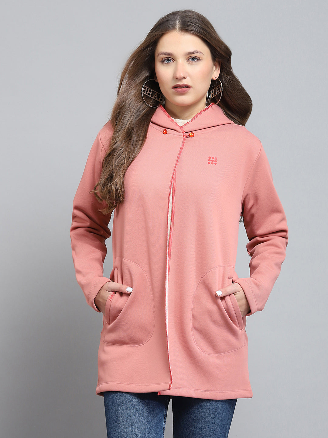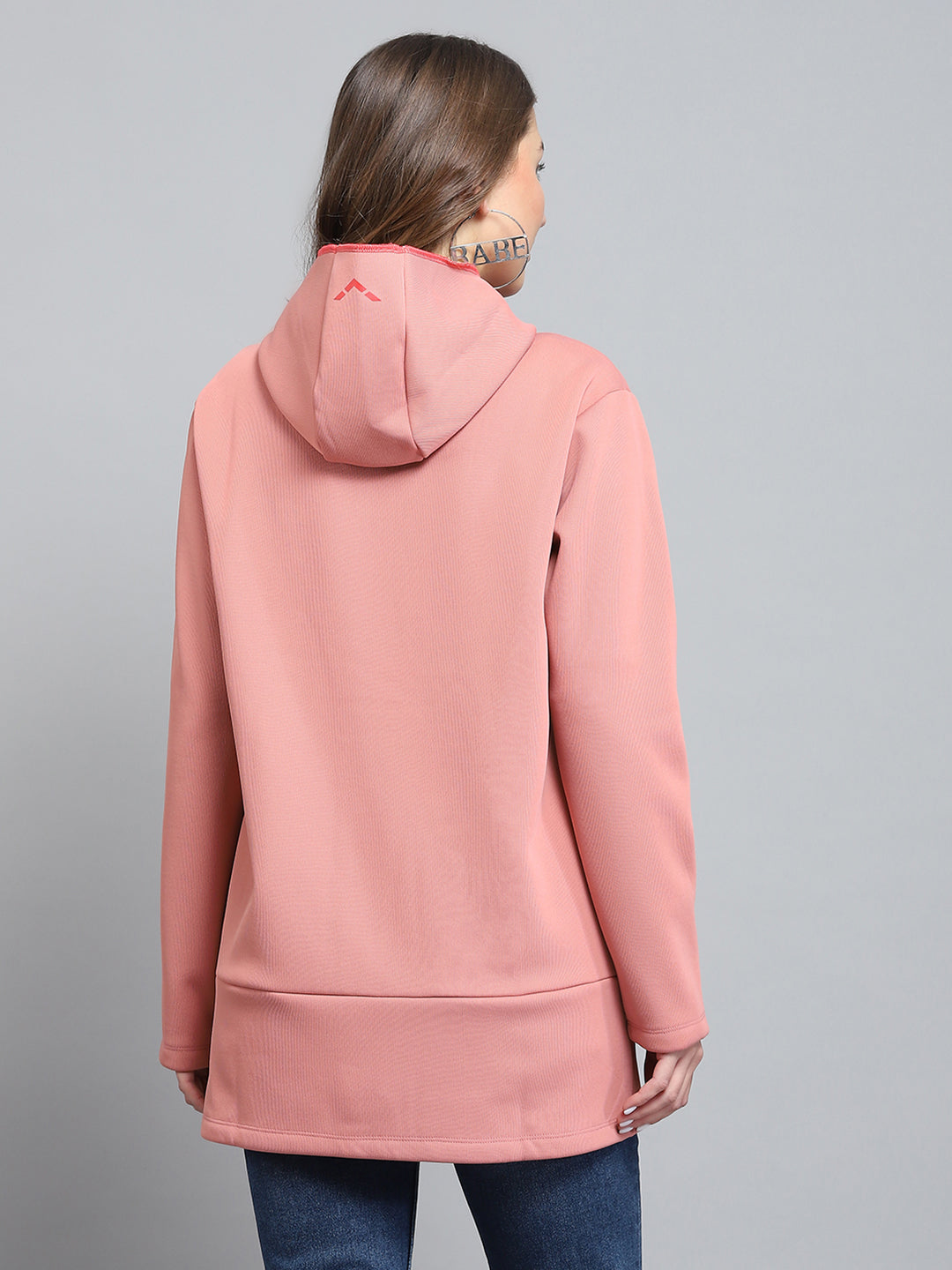 Women Peach Solid Hooded Full Sleeve Sweatshirt